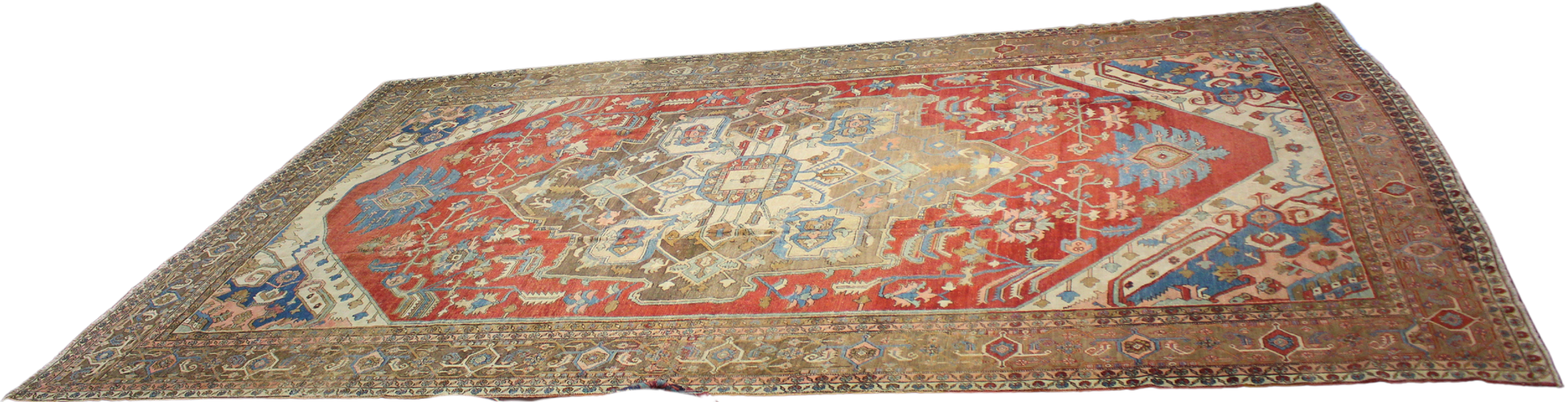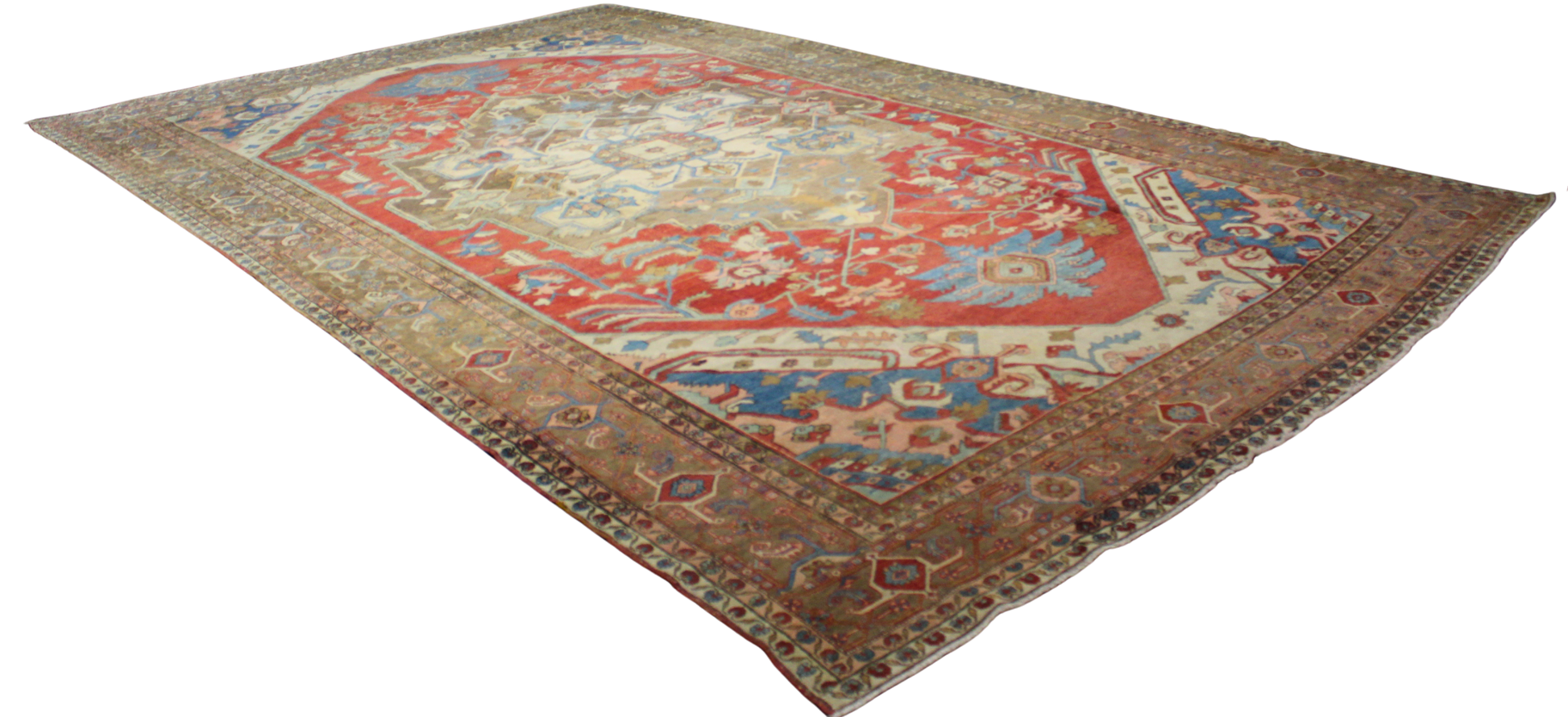The border a masterpiece in itself - is lined with classic Heriz-style rosettes and geometric detailing in cool indigo, sand, and faded rose. This elegant composition balances regal formality with the rustic charm that defines antique Serapis, making it perfect for anchoring large living rooms, dining halls, or gallery-style entryways.