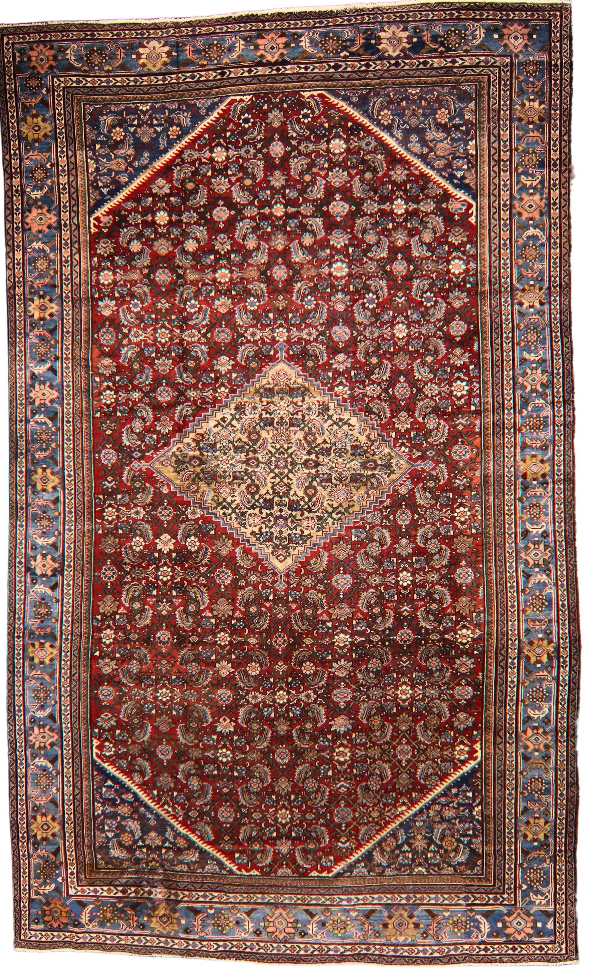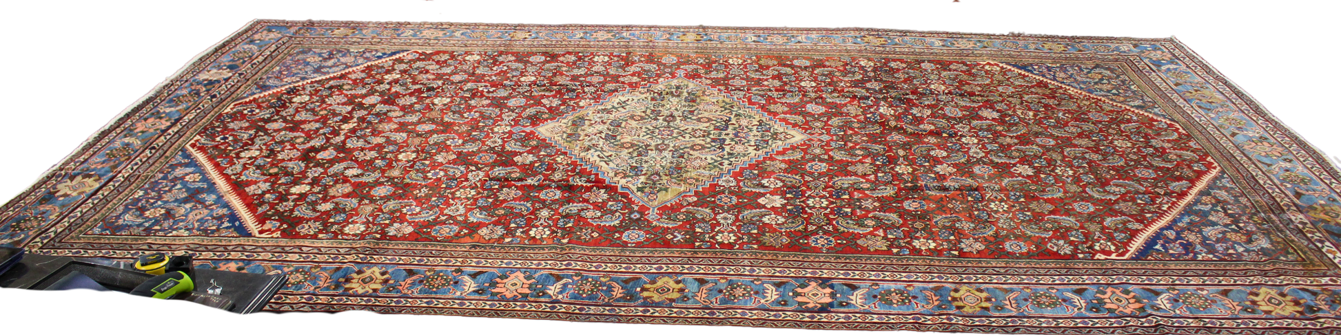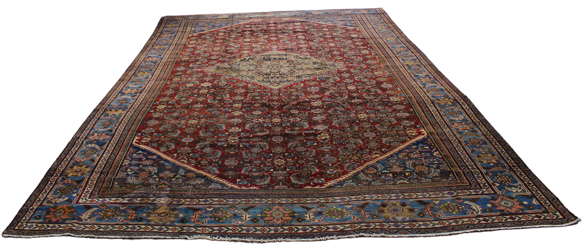 A commanding presence and a masterclass in floral symmetry, this oversized Persian Mahal rug (11 × 18.2 ft) is the embodiment of grandeur and refined craftsmanship. Set against a deep red field, a sea of intricate scrolling vines and stylized floral rosettes create a flowing tapestry of movement and harmony. At its heart, a diamond-shaped ivory medallion radiates balance and structure, bordered by elegant cobalt corner spandrels.