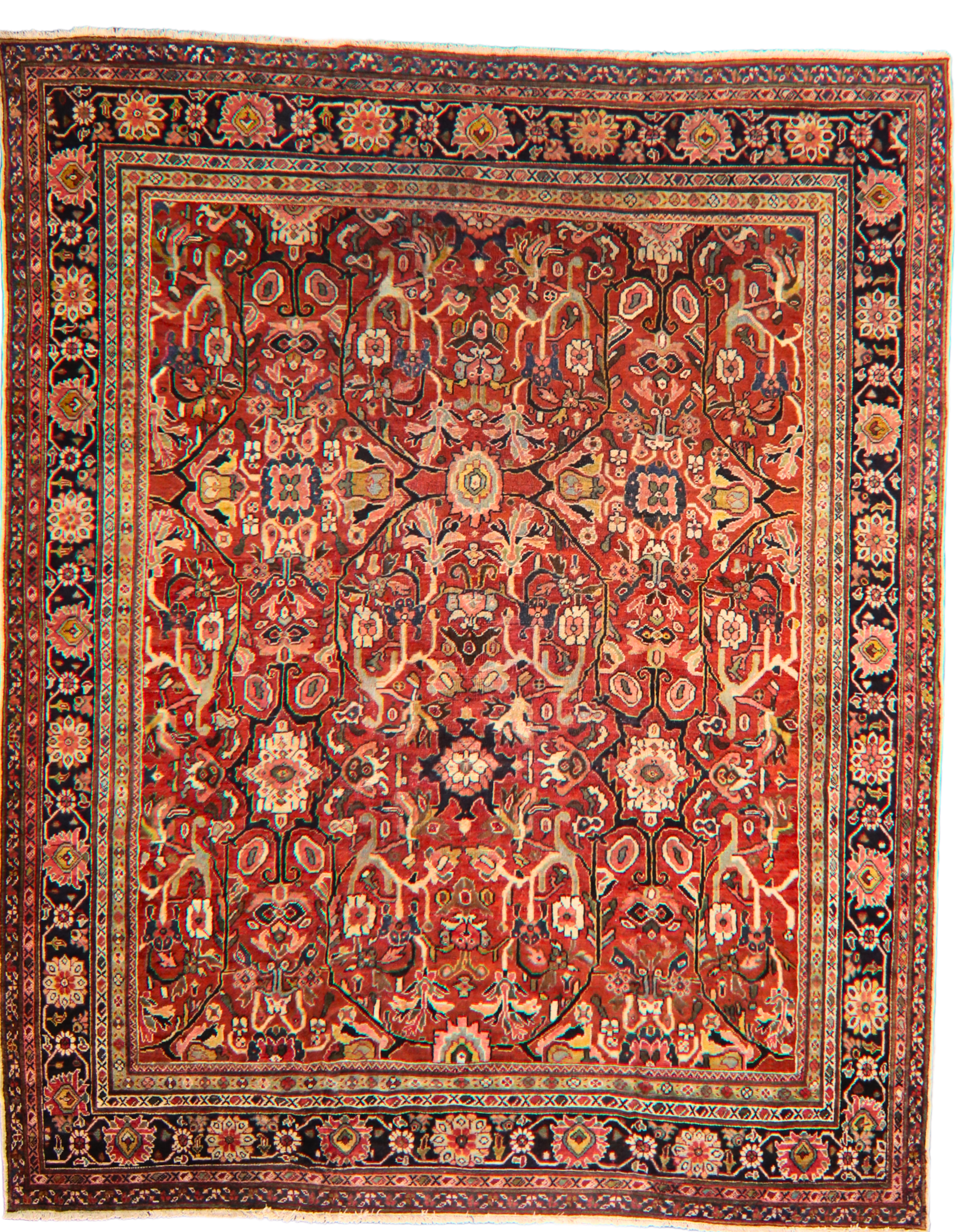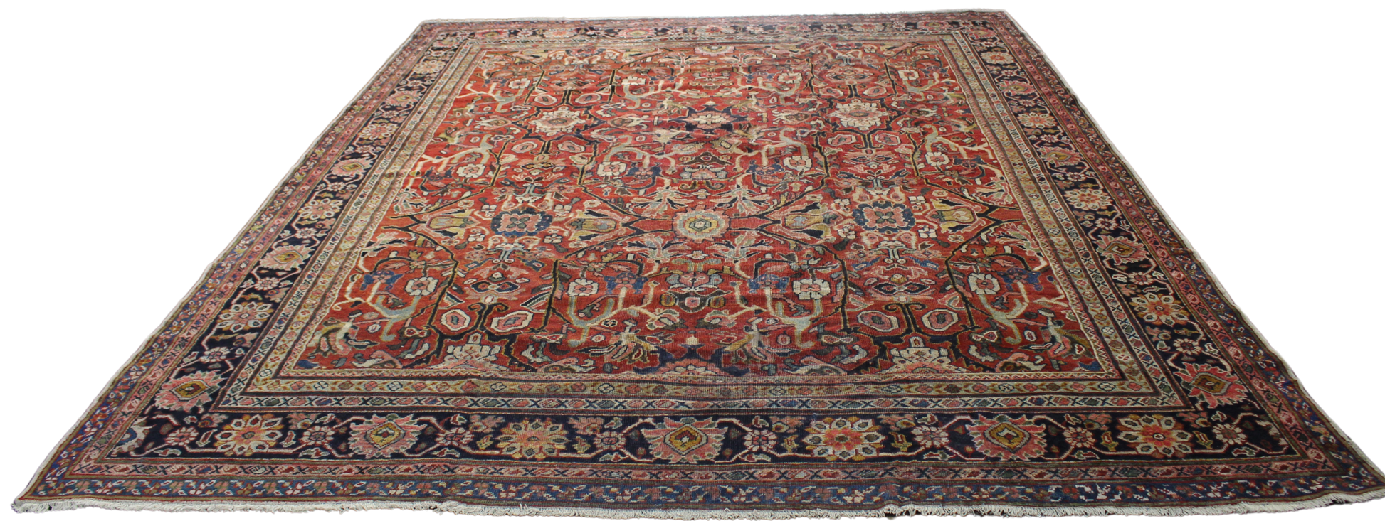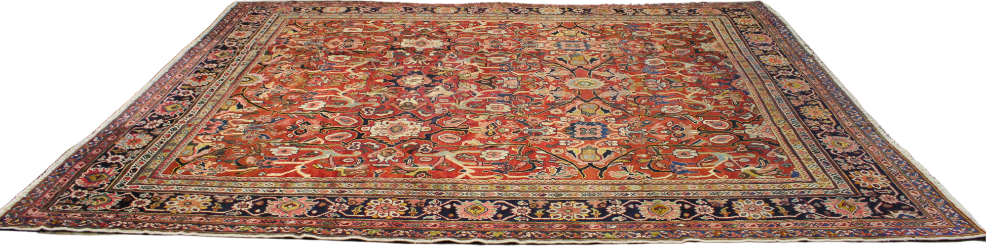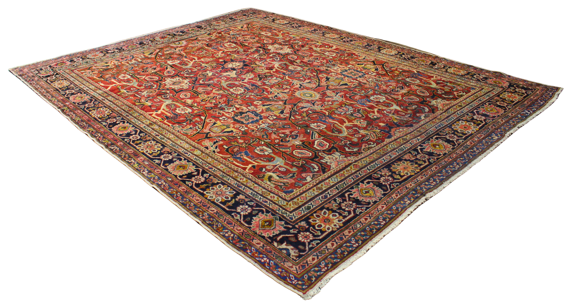 This antique Persian Mahal rug (10.8 × 13.1 ft) showcases a regal and elaborate allover pattern, reflecting the richness and artistic spirit of early 20th-century Persian village weaving. The deeply saturated brick-red field bursts with stylized floral rosettes, palmettes, and leafy tendrils arranged in a finely balanced, symmetrical layout. A navy border densely filled with floral sprays offers bold contrast and a refined frame to the central field.