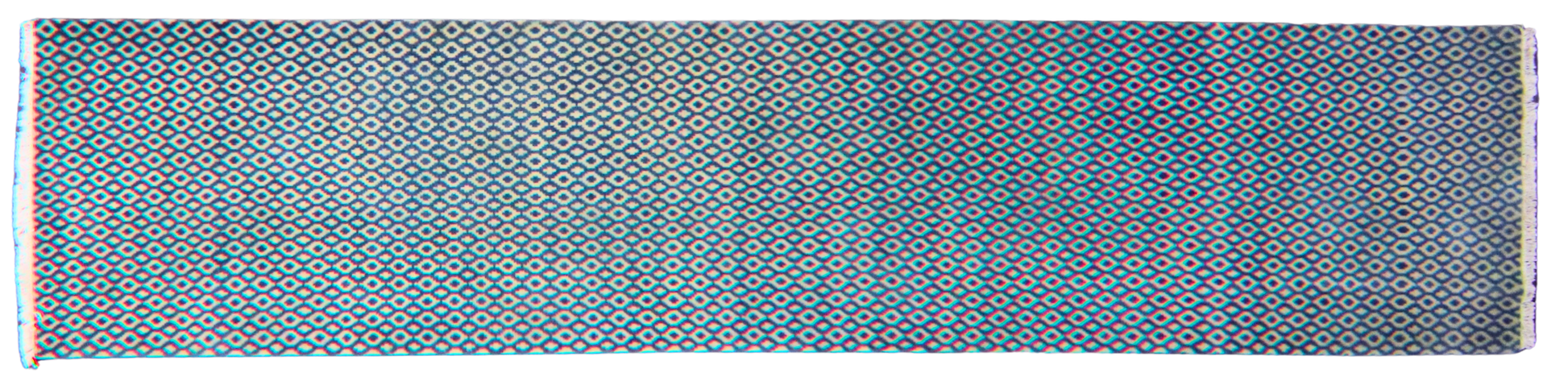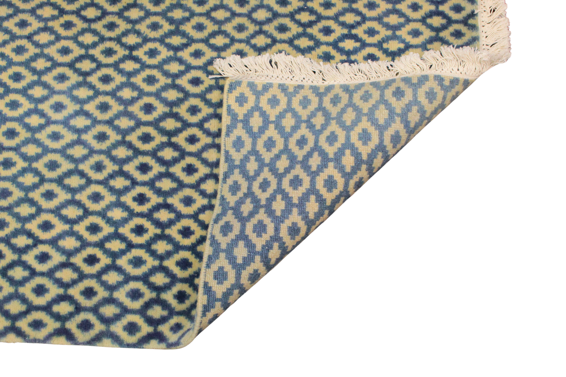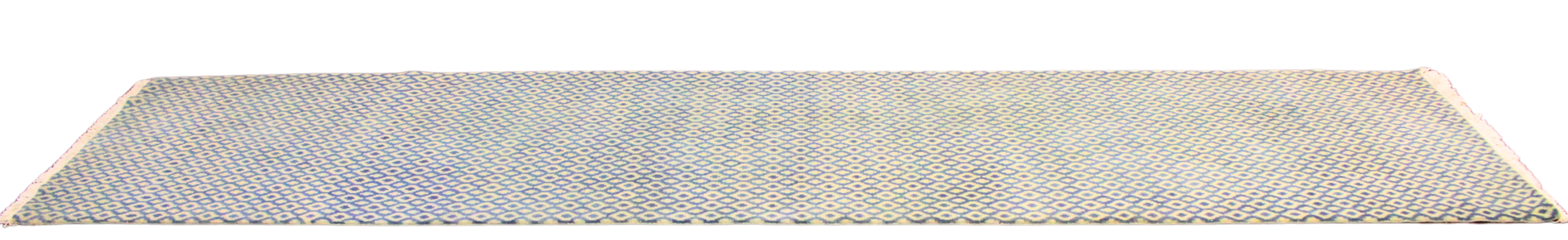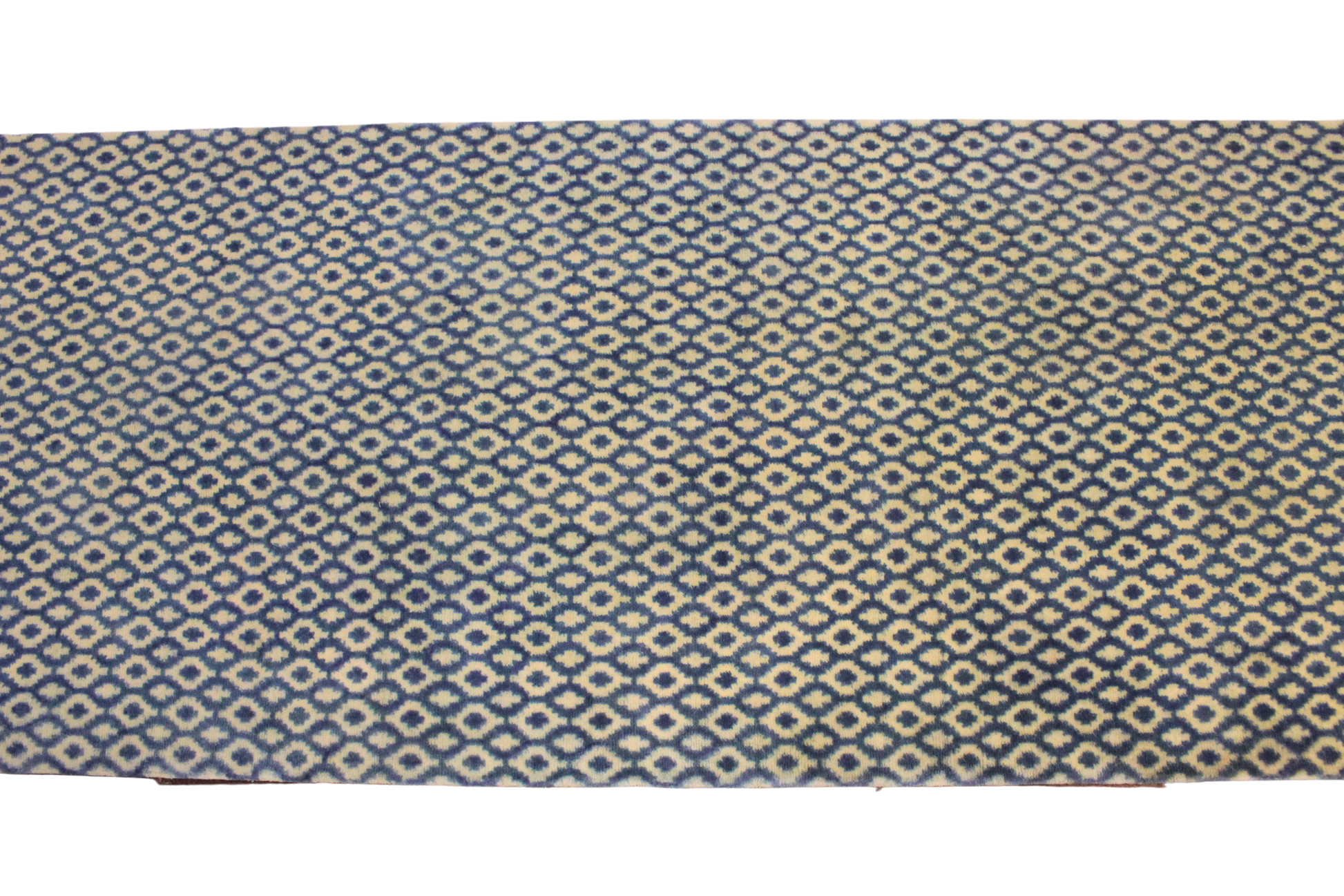 Bold and rhythmic, this contemporary Afghan Oushak runner is a masterclass in minimalism with impact. A tightly packed lattice of diamond motifs in alternating navy and ivory forms a continuous geometric field — clean, modern, and full of movement. The symmetry gives it visual energy, while the muted palette keeps it grounded and versatile.