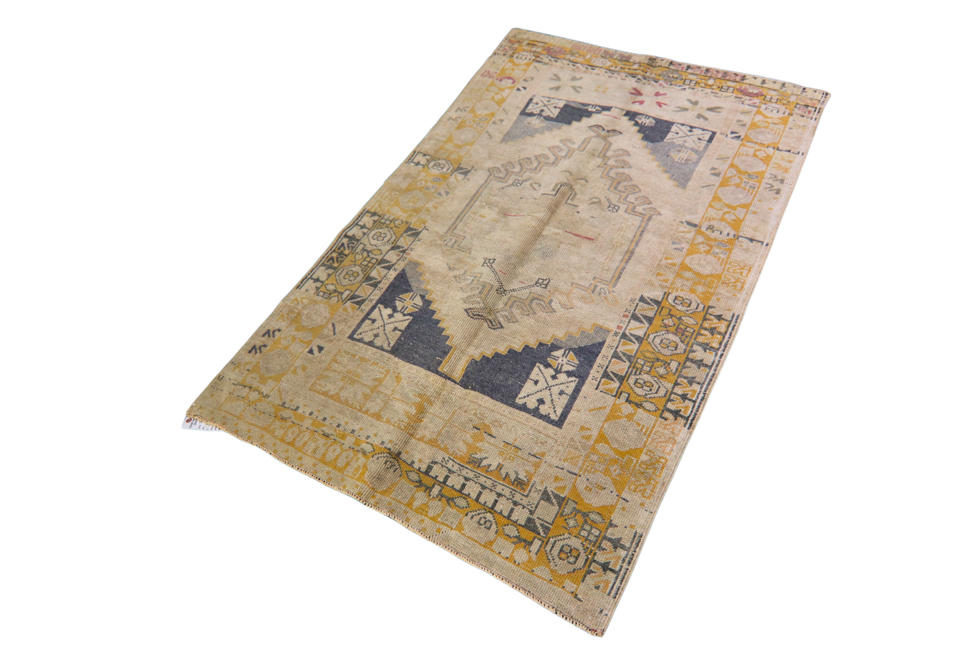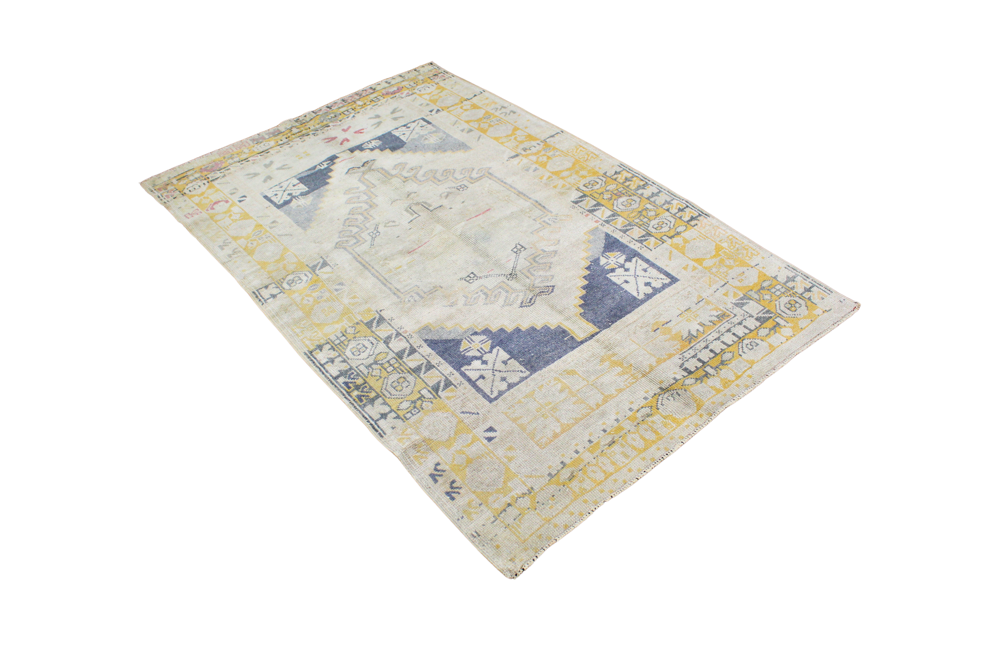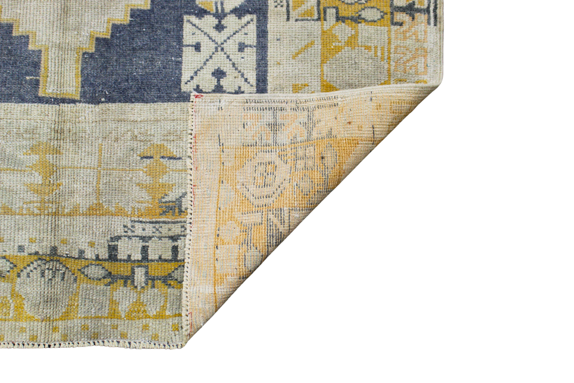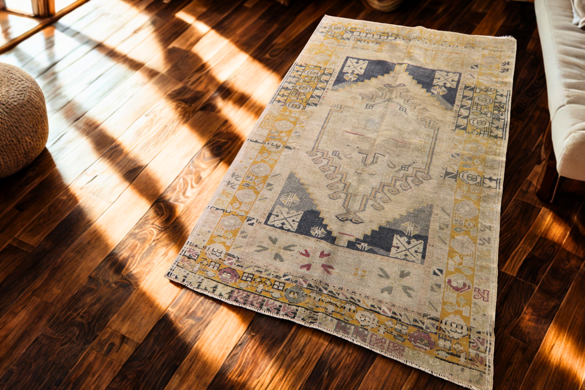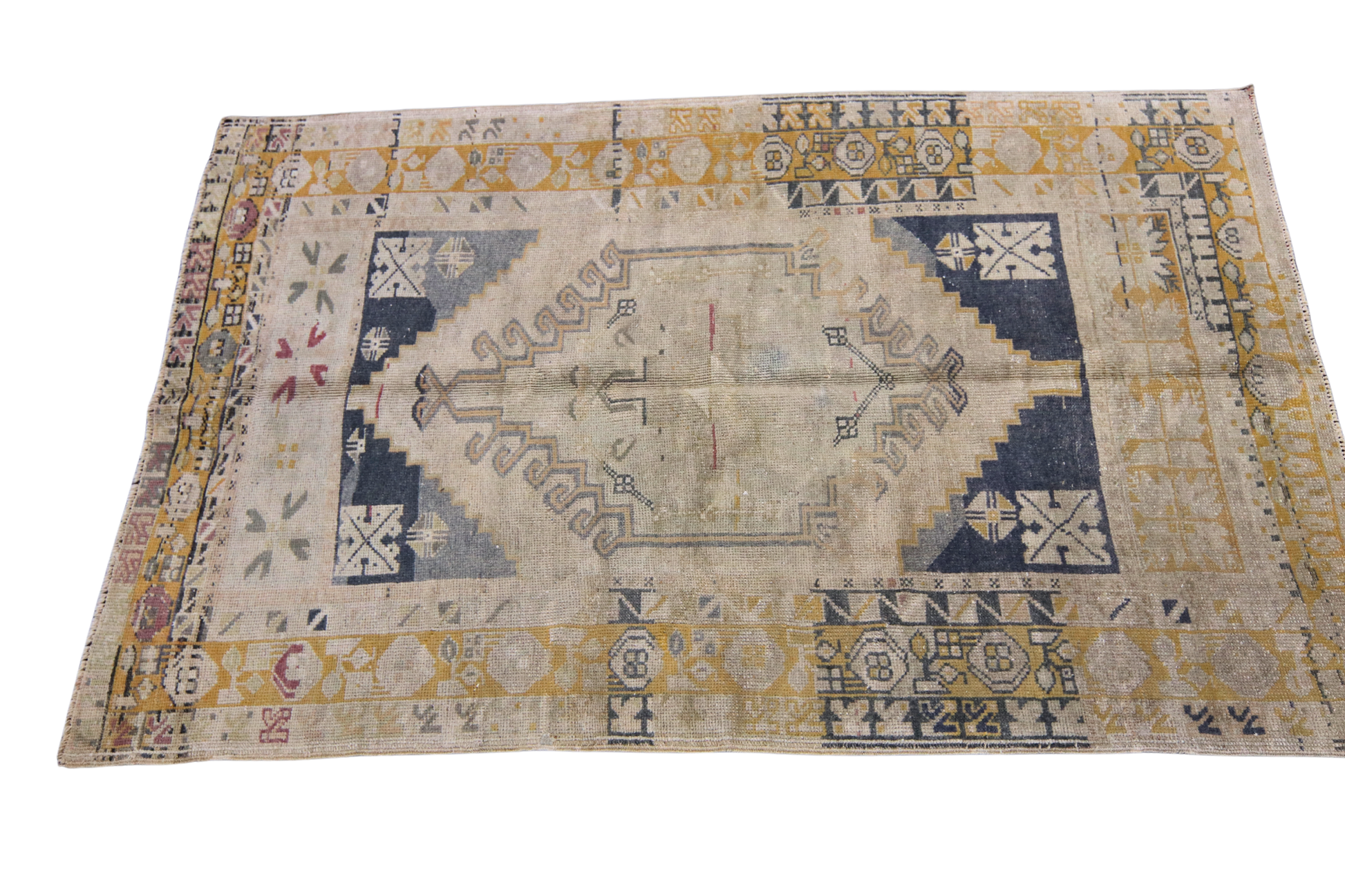 This antique Turkish Oushak rug (3.9 × 5.11 ft) features a rare and atmospheric palette that evokes a feeling of desert twilight. Its faded central medallion floats in a soft ivory field, framed by stepped corners in inky blue and accented with ochre gold. Angular vines and stylized botanical motifs create a rhythmic sense of movement, while the worn patina enhances its rustic, timeworn charm.