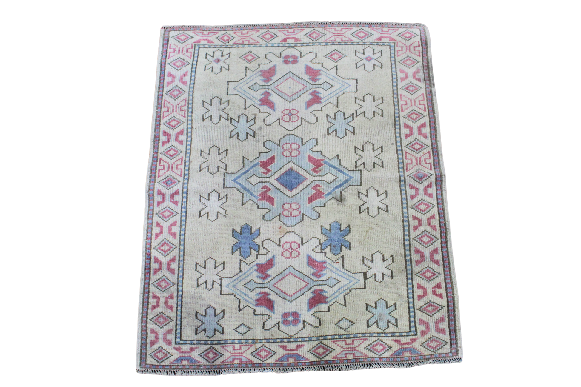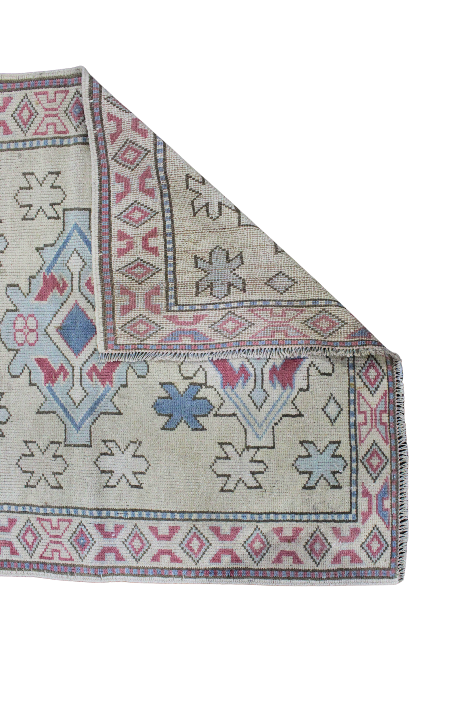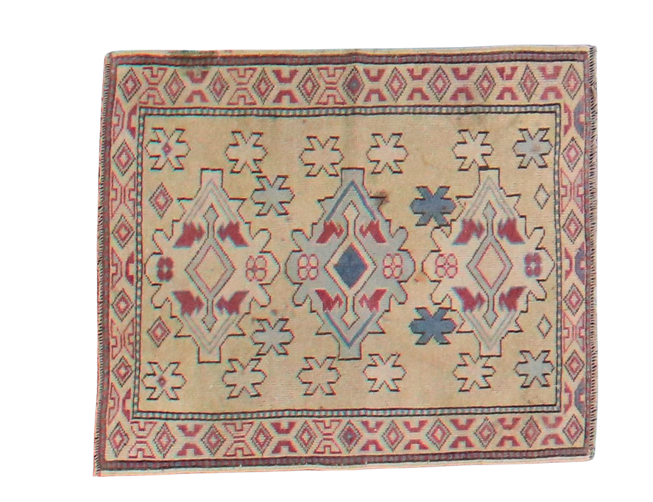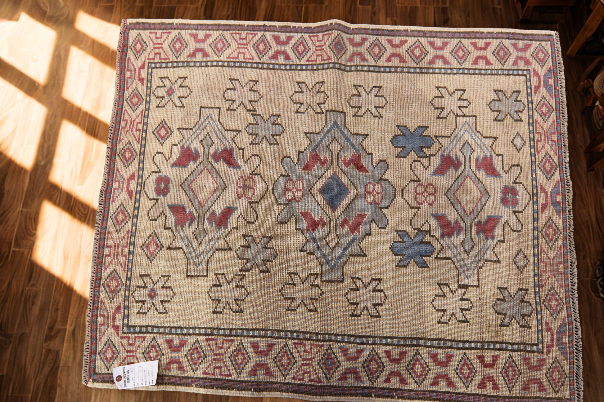 A charming small-scale piece, this handwoven Oushak rug from Turkey measures 3'2" x 3'9" and brings authentic Anatolian artistry into your space. The design showcases a bold geometric medallion motif in muted red and denim blue tones against a natural beige field. The delicate border of tribal diamonds adds a playful touch, while the floral and angular elements speak to traditional Oushak influences.