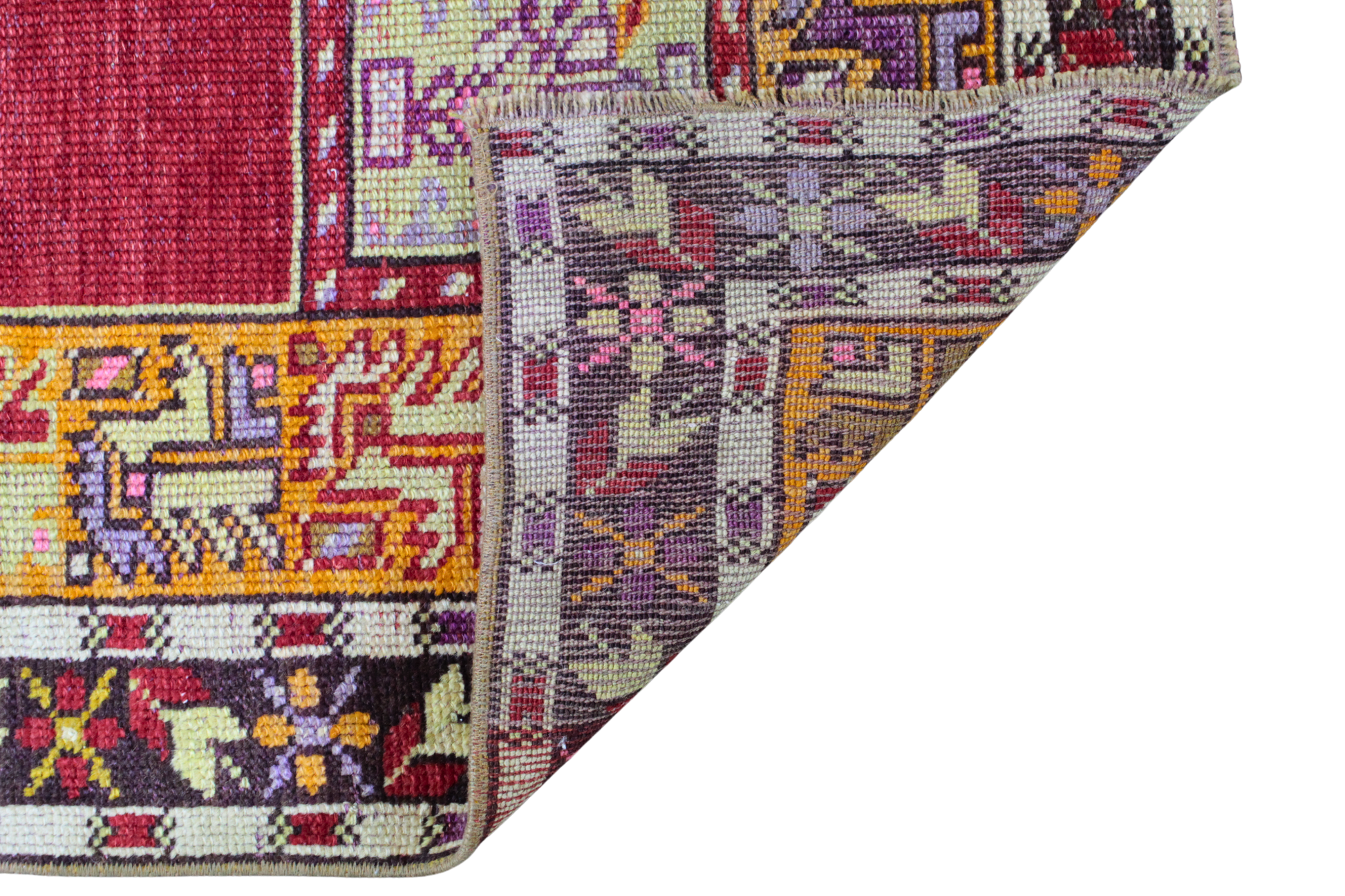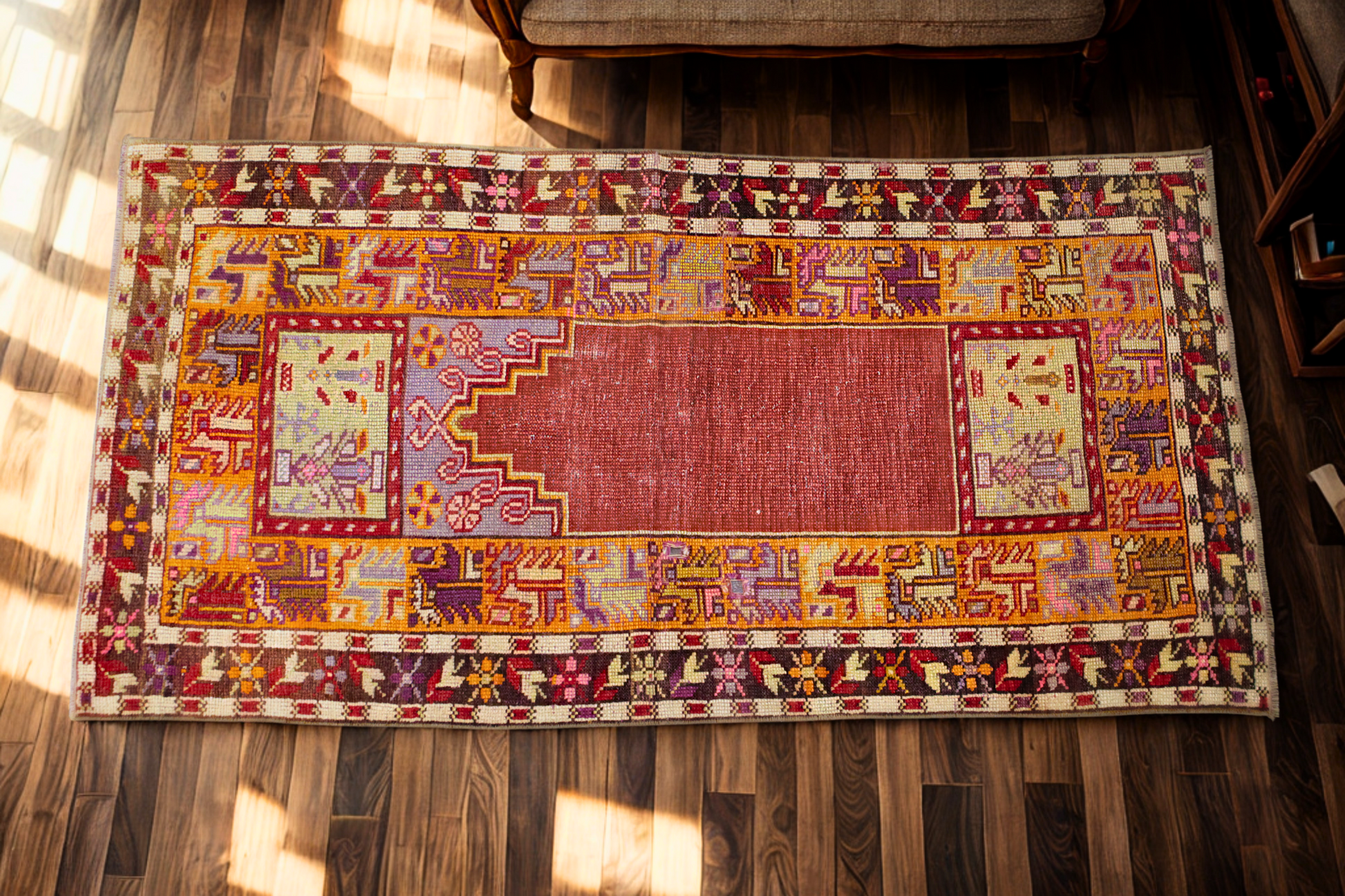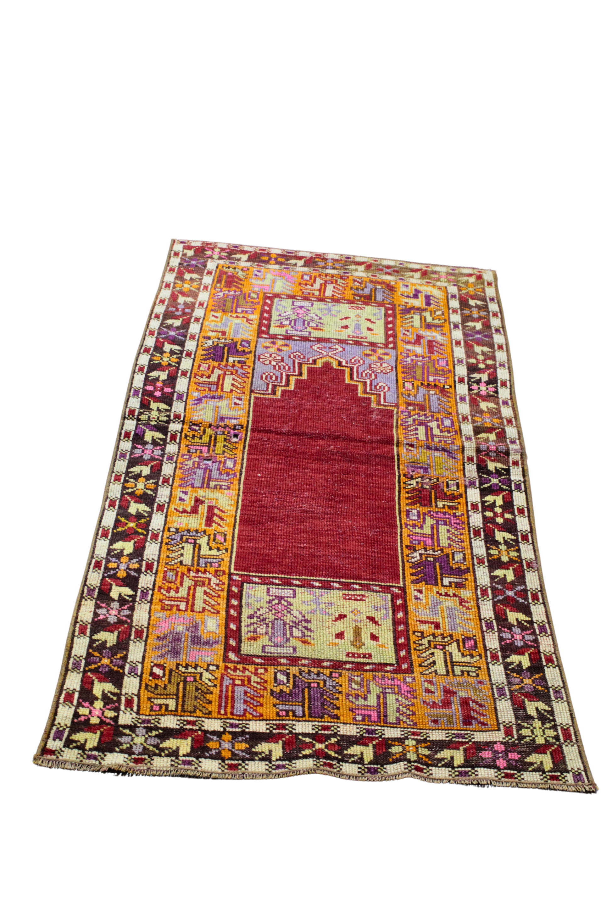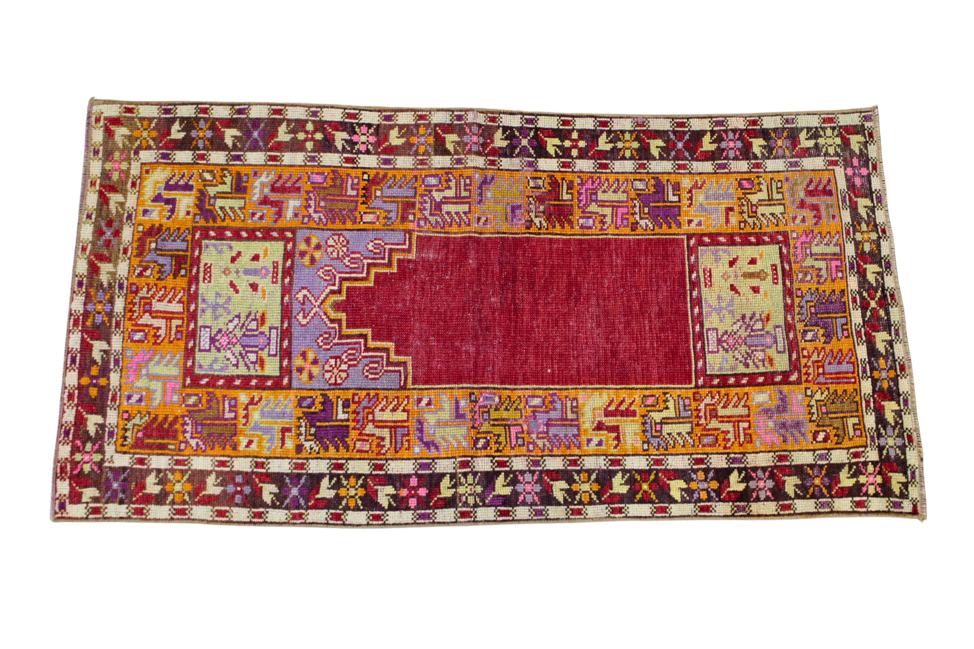 The rich crimson prayer field draws the eye immediately, framed by twin corner panels featuring delicate floral urns in soft greens and lavenders. Surrounding the center is a dynamic array of tribal border motifs—woven in fiery oranges, amethyst, ochre, and deep rose—each one reflecting the deep heritage of Oushak weaving traditions. This piece is more than décor; it’s a living artifact of Turkish cultural legacy.