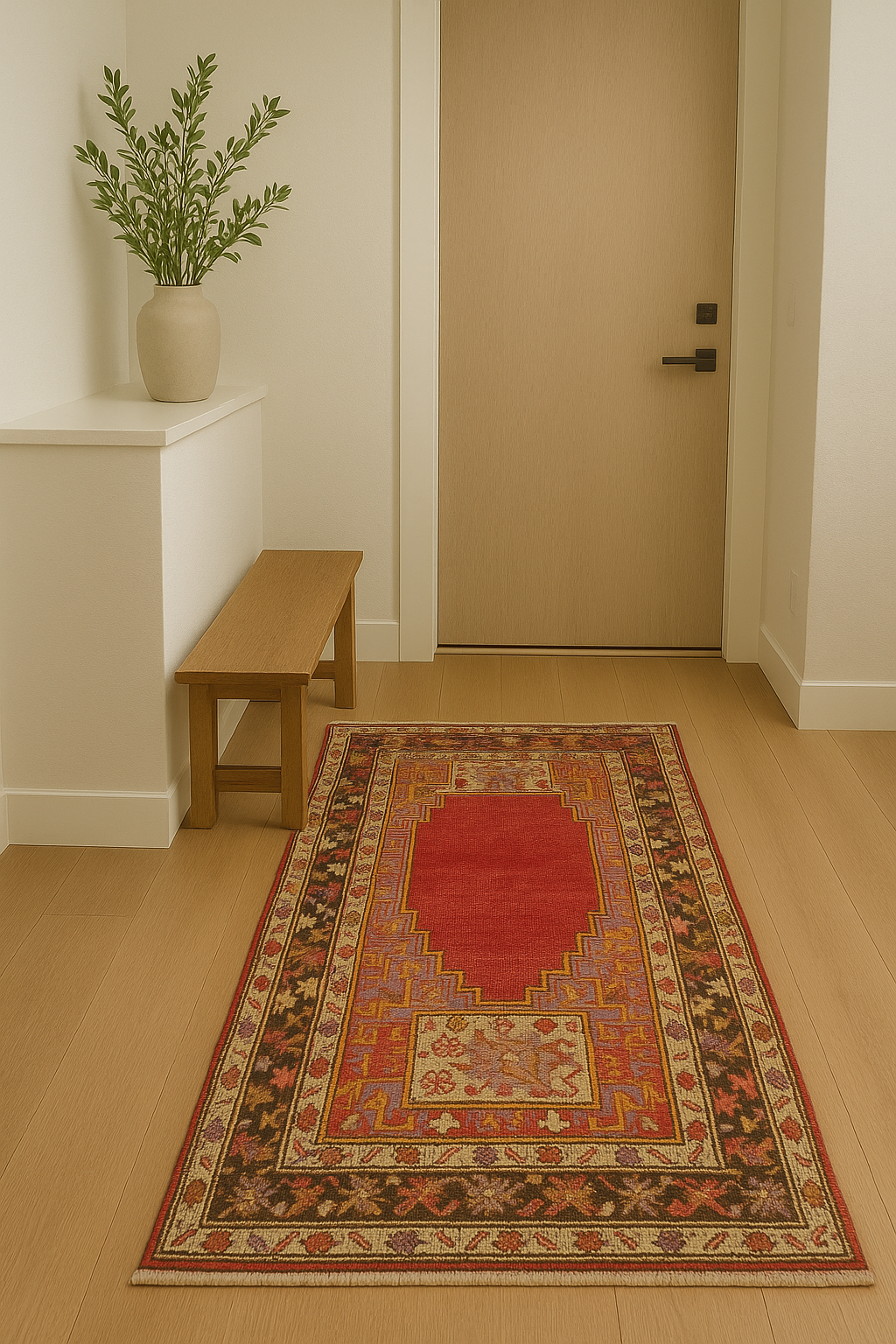 Its compact size makes it a perfect fit for an entryway, hallway, or reading nook, adding warmth, texture, and storytelling to any space. With its naturally worn patina, this antique rug offers both color and soul—bringing history home in a deeply personal way.