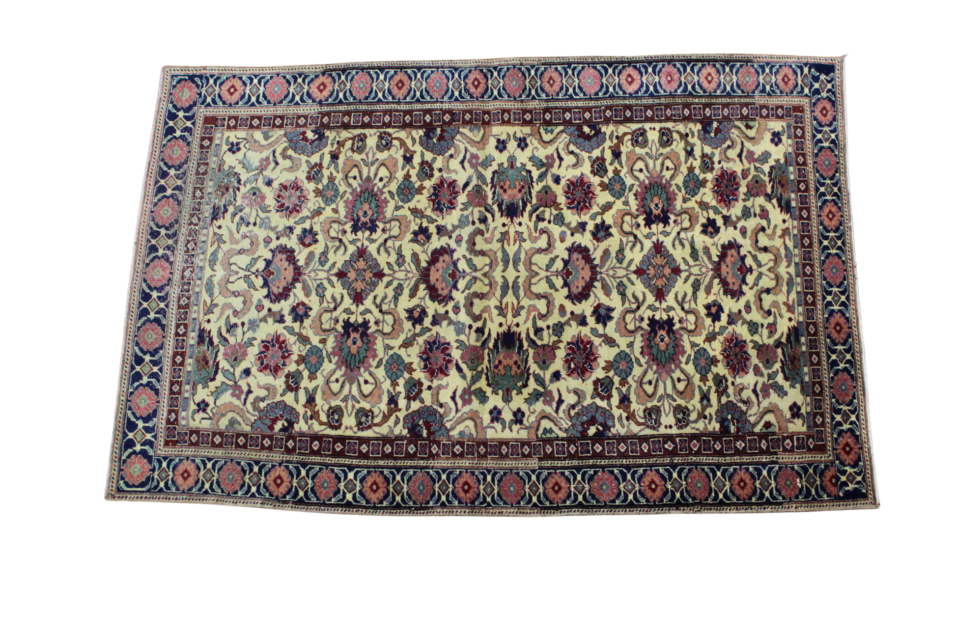 Design: Symmetrical floral scrollwork with a contrasting wide border