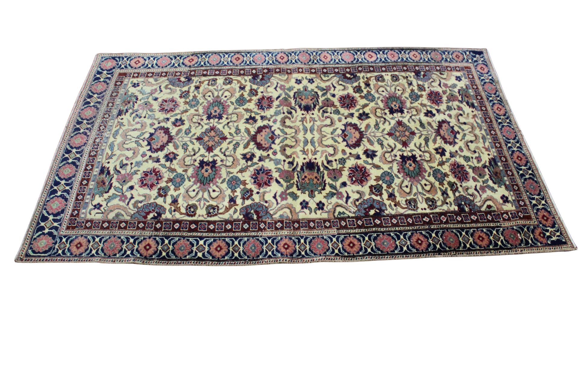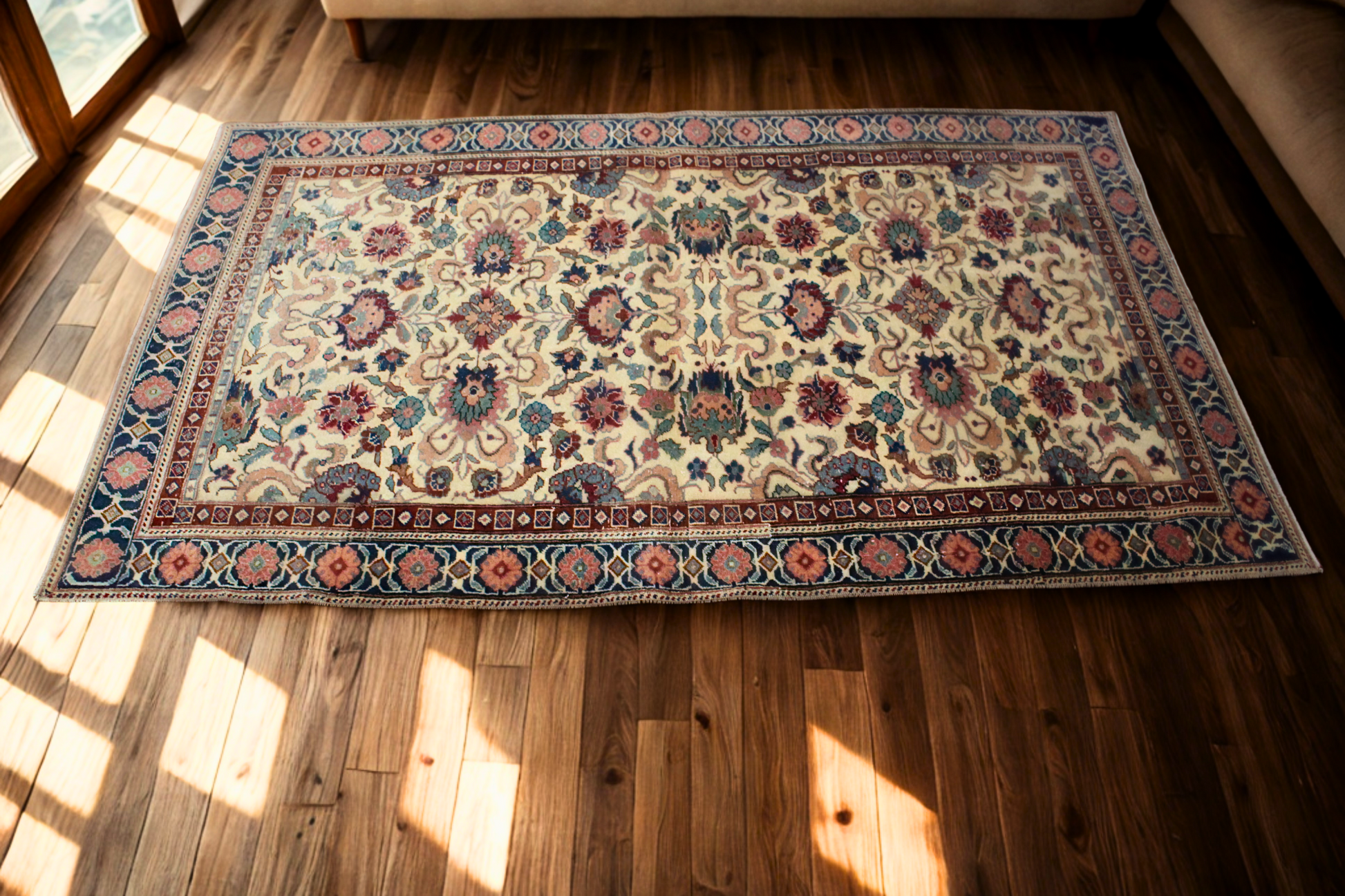 Exquisite detailing meets timeless craftsmanship in this Turkish Oushak rug (3.7 × 5.10 ft). Its ivory field is densely packed with intricate floral scrollwork and palmettes in an elegant palette of dusty rose, olive green, soft teal, and navy. The design flows symmetrically from a central axis, flanked by a sophisticated two-tone border: a narrow inner band of geometric motifs and a wide sapphire blue outer band adorned with rosettes and vinework.