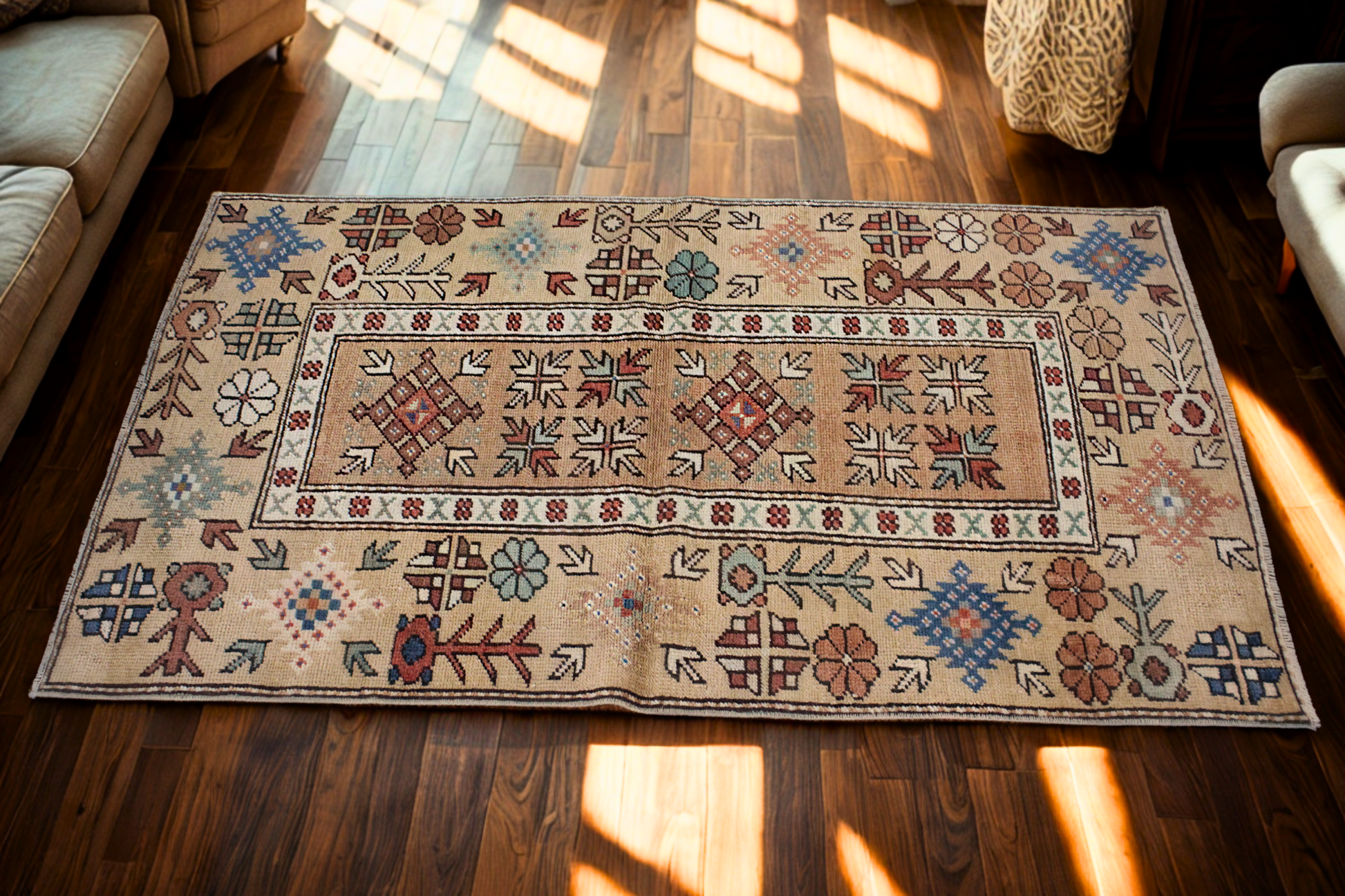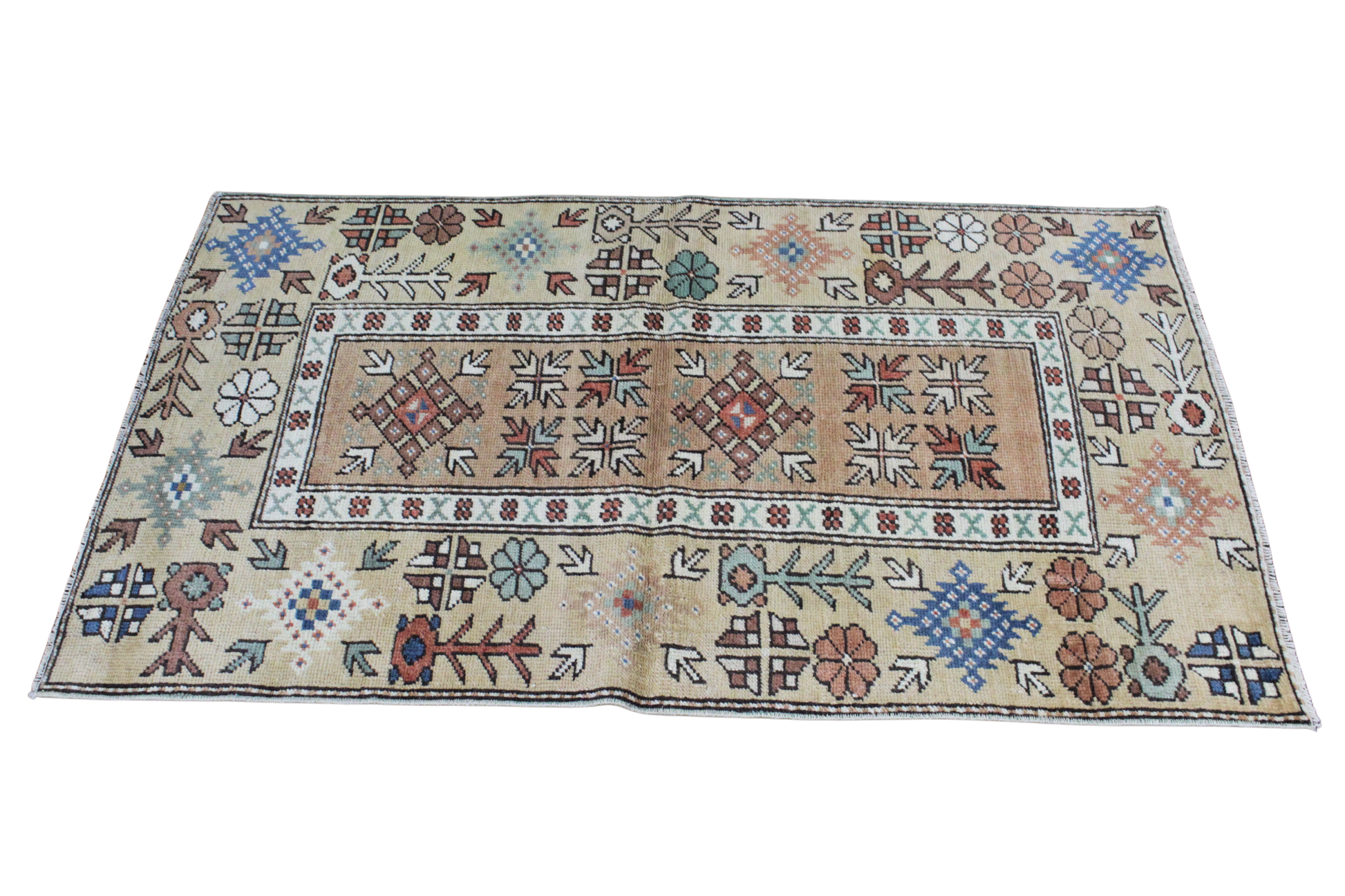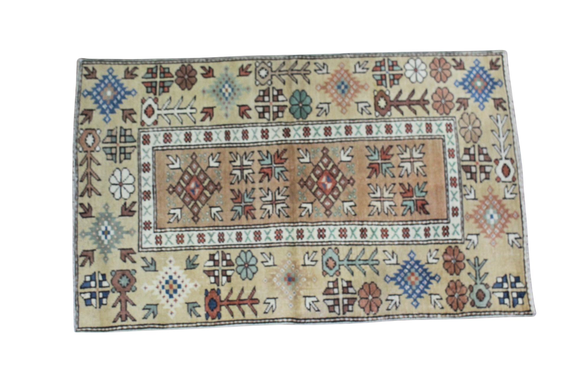 Rich in character and folk-inspired artistry, this hand-knotted Turkish Oushak rug (2.9 × 4.5 ft) brings the warmth of Anatolian tradition into any space. Its central camel-tone field is framed by a series of lively tribal motifs in an earthy yet vibrant palette—rust, teal, sky blue, ivory, and terracotta. Geometric blossoms, stylized arrows, and symbolic medallions dance across the composition, giving the piece a joyful, almost storybook quality.