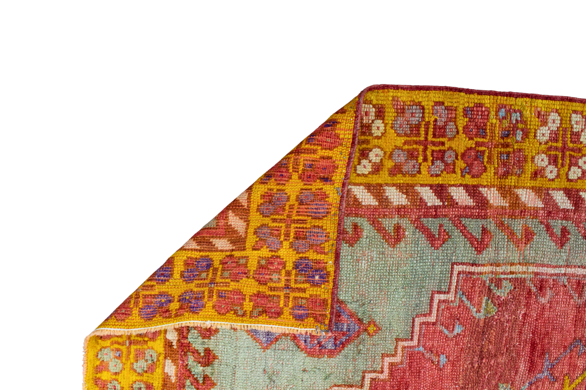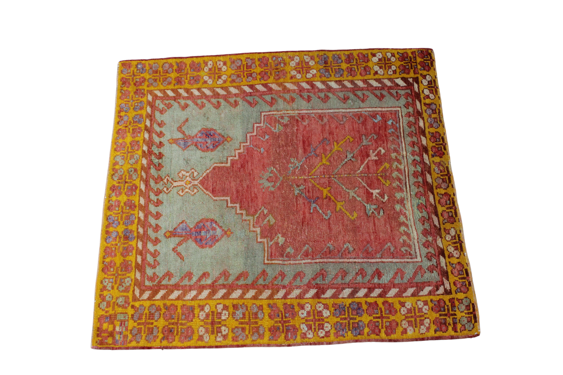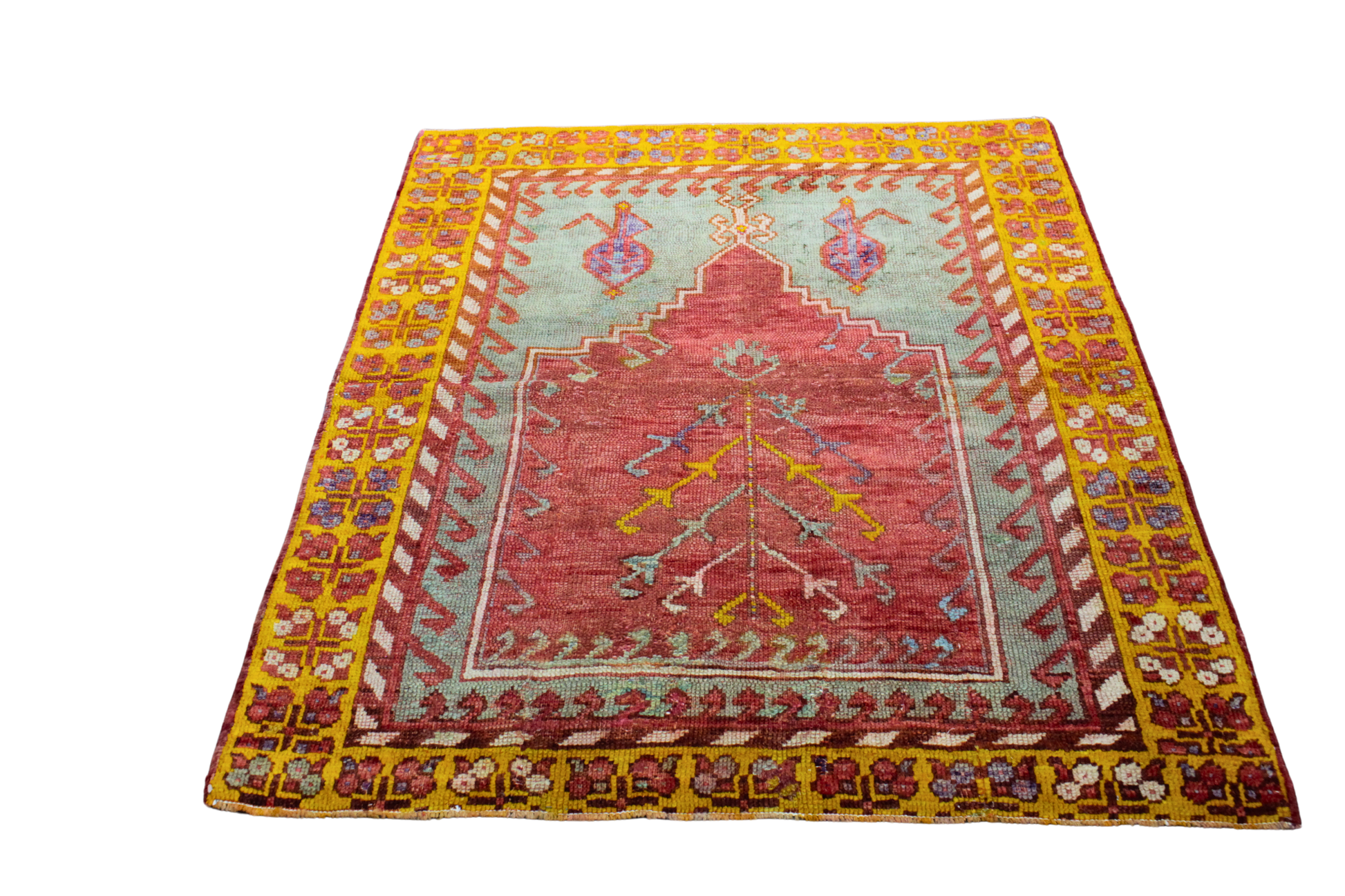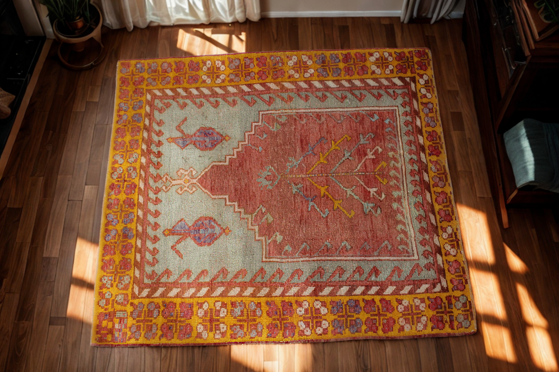 Bursting with character, this petite Turkish Oushak rug (3.6 × 3.11 ft) carries the spirit of Anatolia in every knot. A striking prayer-style niche dominates the red field, flanked by stylized tree-of-life motifs and tribal medallions. The inner border features rhythmic red and white chevrons, while a cheerful outer border in saffron yellow blooms with tiny geometric floral rosettes in lavender, crimson, and teal.