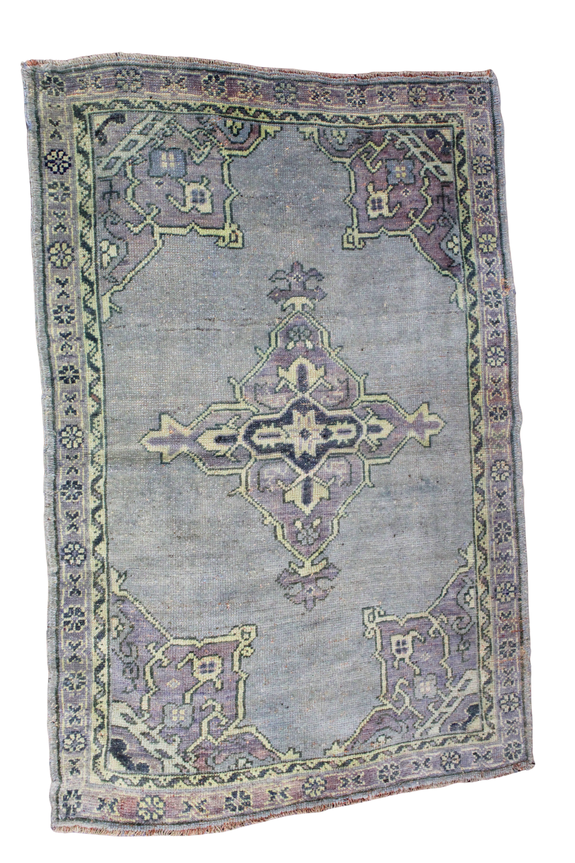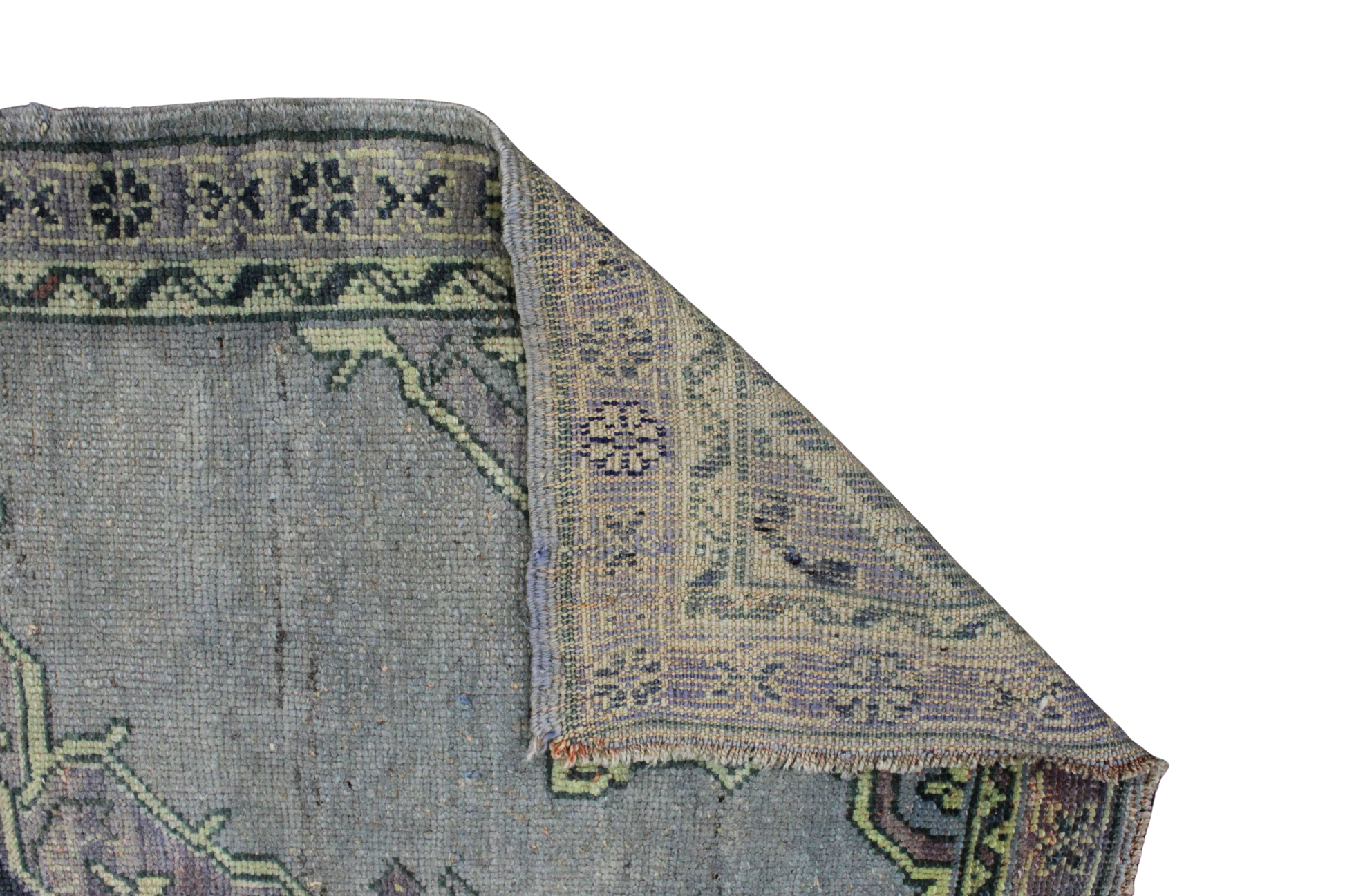 A perfect blend of subtlety and elegance, this vintage Turkish Oushak rug (3.9 × 5.6 ft) offers timeless charm with its understated palette and refined geometry. A soft, weathered blue field sets the tone, anchored by a central medallion in faded lavender and charcoal tones, accented with creamy ivory and muted olive outlines. The corner spandrels echo the central motif, contributing to the overall harmony of the design. Finished with a delicate floral border, this piece embodies the relaxed sophistication characteristic of Oushak weavings.
