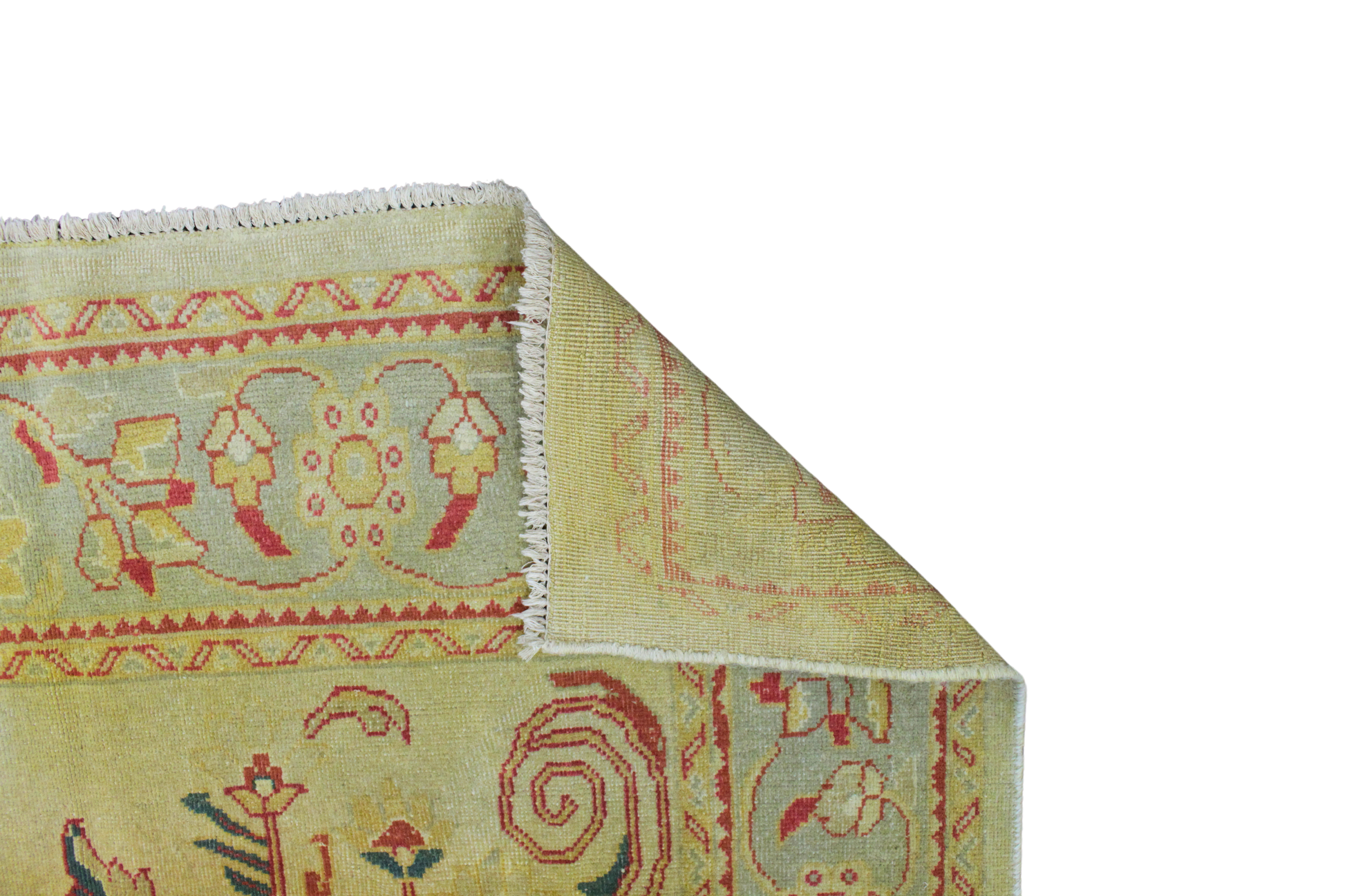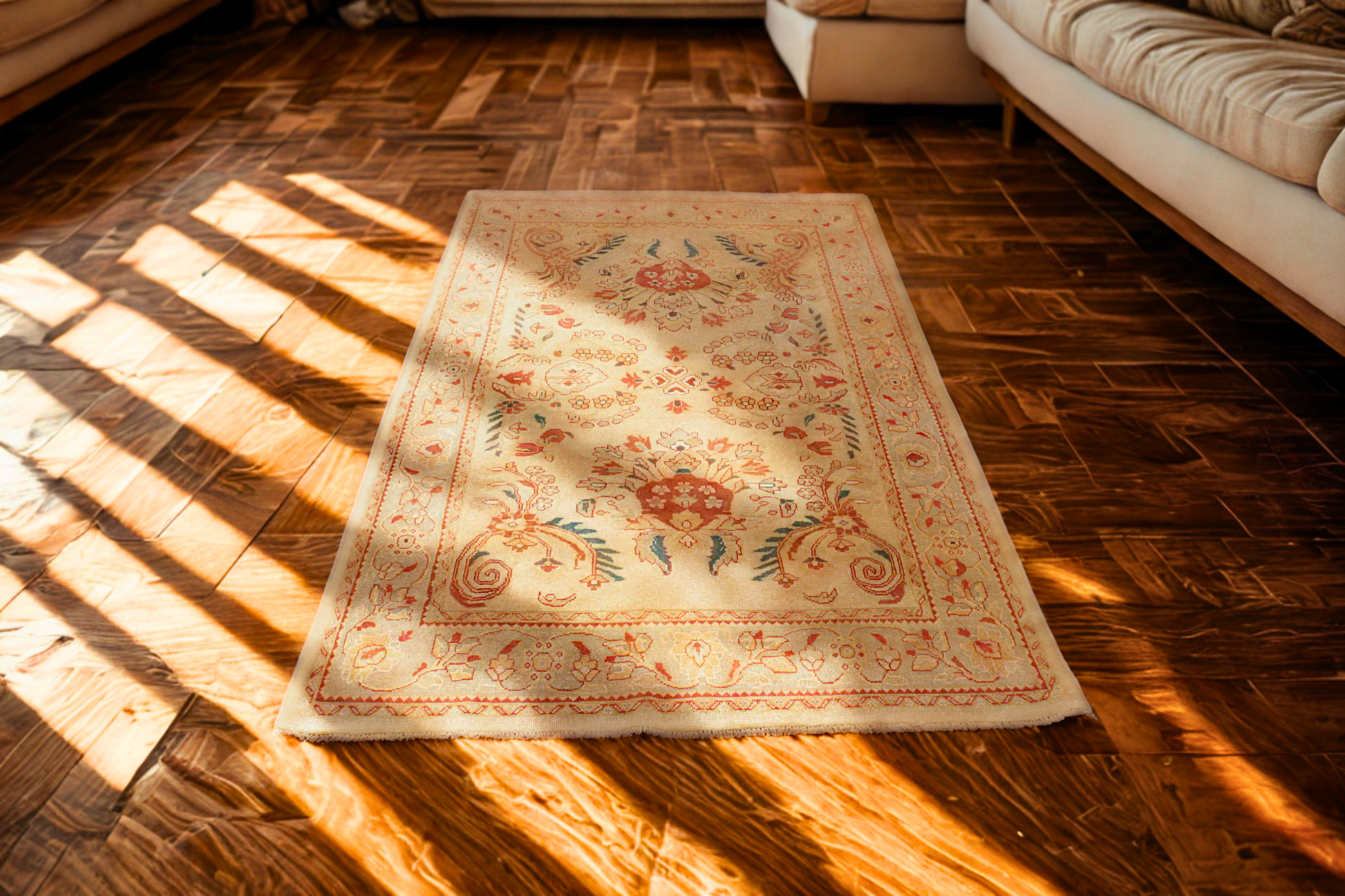 Glowing with understated warmth, this 4.7 × 8 ft antique Persian Mahal rug is a graceful study in balance and floral symmetry. The soft golden field is delicately adorned with bold crimson medallions, stylized palmettes, and intricate leafy flourishes—each detail echoing the quiet elegance of traditional village weaving. The saffron-toned border frames the composition with floral meanders that feel both decorative and grounded.