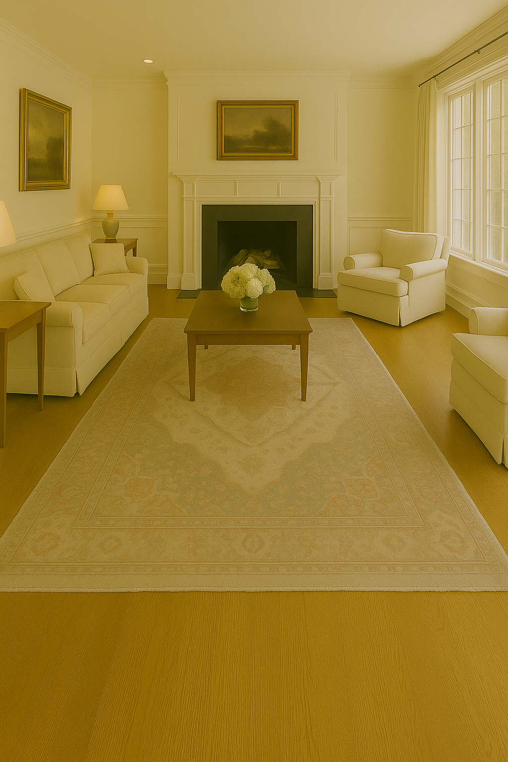 Its gracefully muted palette and balanced symmetry create an aura of tranquility, making it ideal for anchoring a refined living space, study, or library. The refined border frames the rug with stylized palmettes and scrolling vines, giving it both structure and quiet opulence.