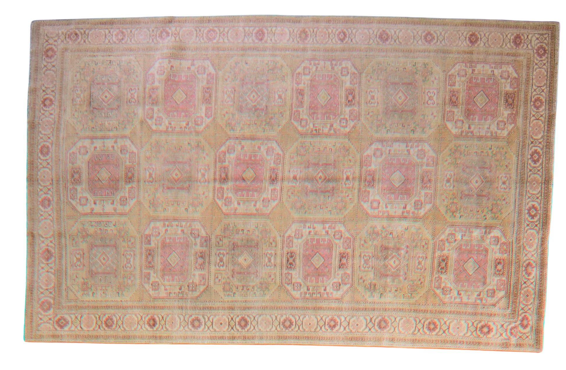 Delicately aged and full of Anatolian charm, this 6.5 × 10.2 ft hand-knotted Turkish Oushak rug brings quiet elegance through its softened geometry and muted tones. The rug features a field of repeating octagonal medallions, each filled with stylized motifs in faded rose, pale saffron, and dusty ivory. A wide floral border surrounds the field, balancing structure with gentle ornamentation.
