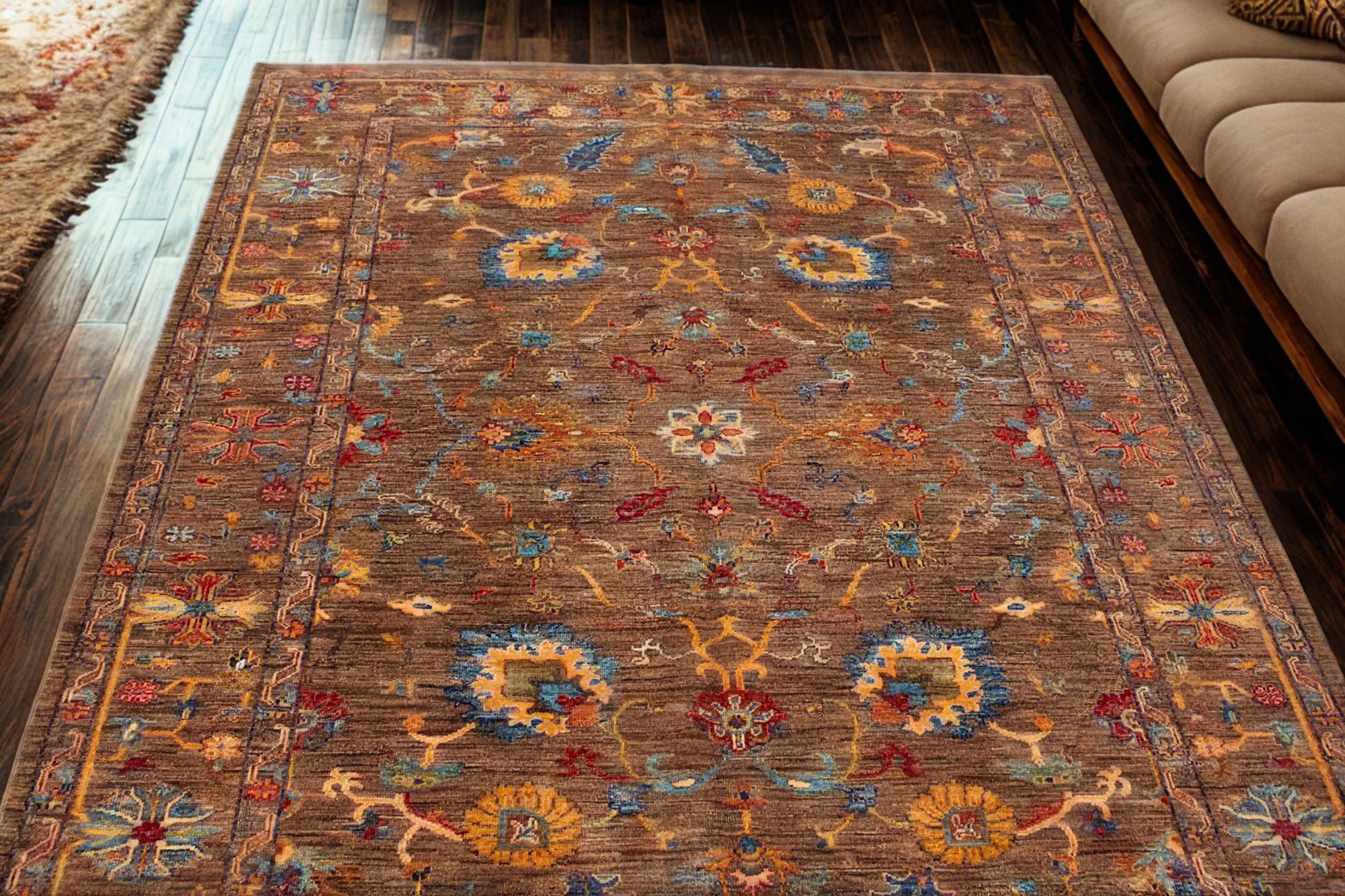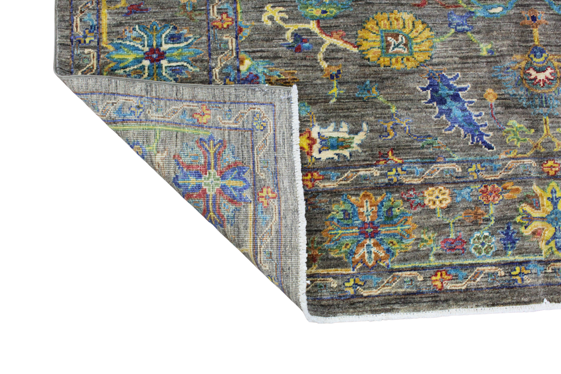 Infused with a moody elegance, this 5.7 × 7.4 ft hand-knotted Oushak rug from Afghanistan offers a modern twist on a classic form. Its deep charcoal field sets the stage for a whimsical array of stylized florals and vines rendered in rich jewel tones—sapphire blue, jade green, saffron, and hints of crimson. The composition feels both grounded and dynamic, a sophisticated balance of tradition and bold artistry.