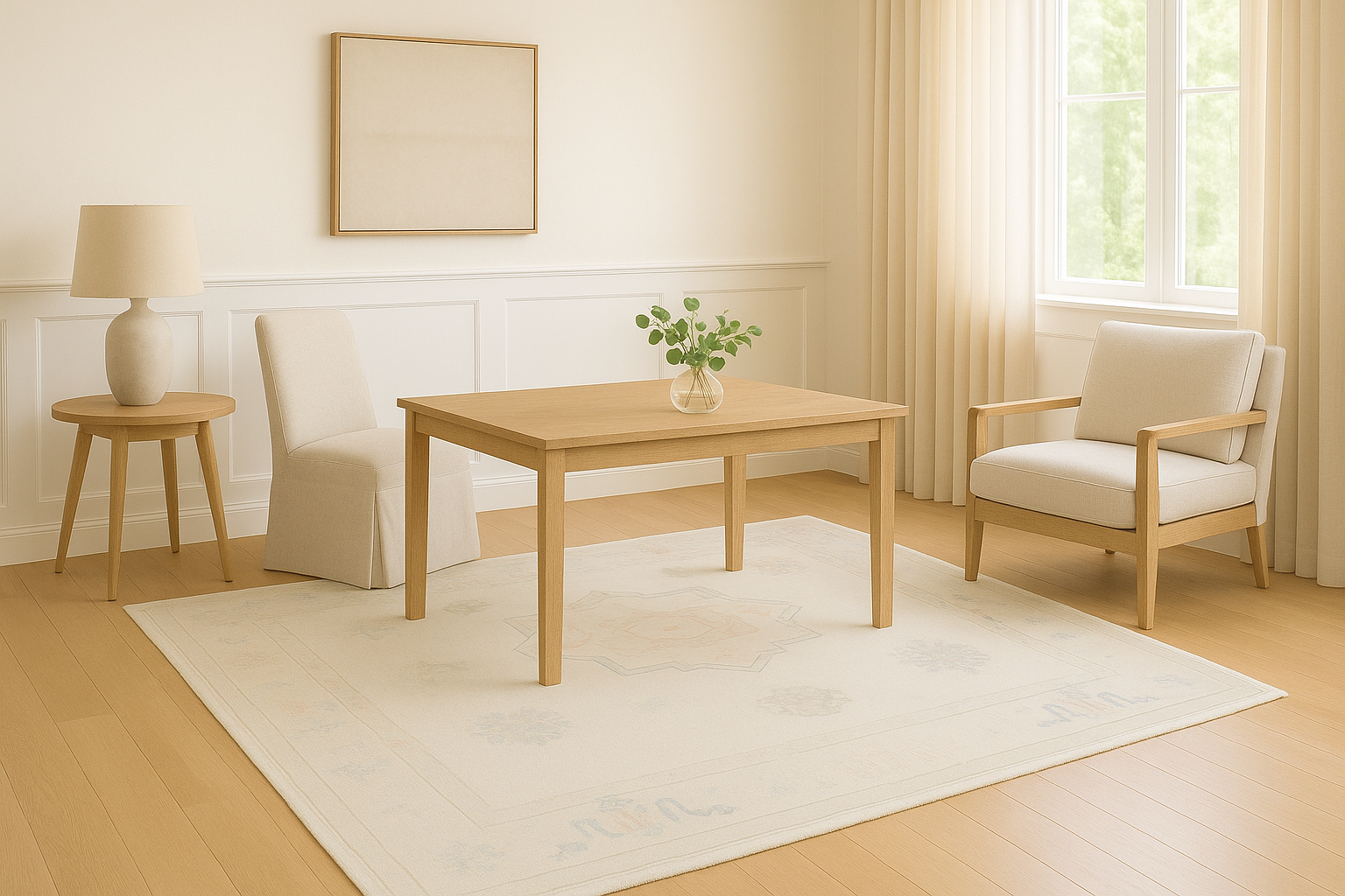 Its spacious proportions and muted elegance make it a natural fit for serene living rooms, modern bedrooms, or light-filled dining spaces. Traditional motifs with a minimalist presence lend versatility to interiors craving character without visual weight.