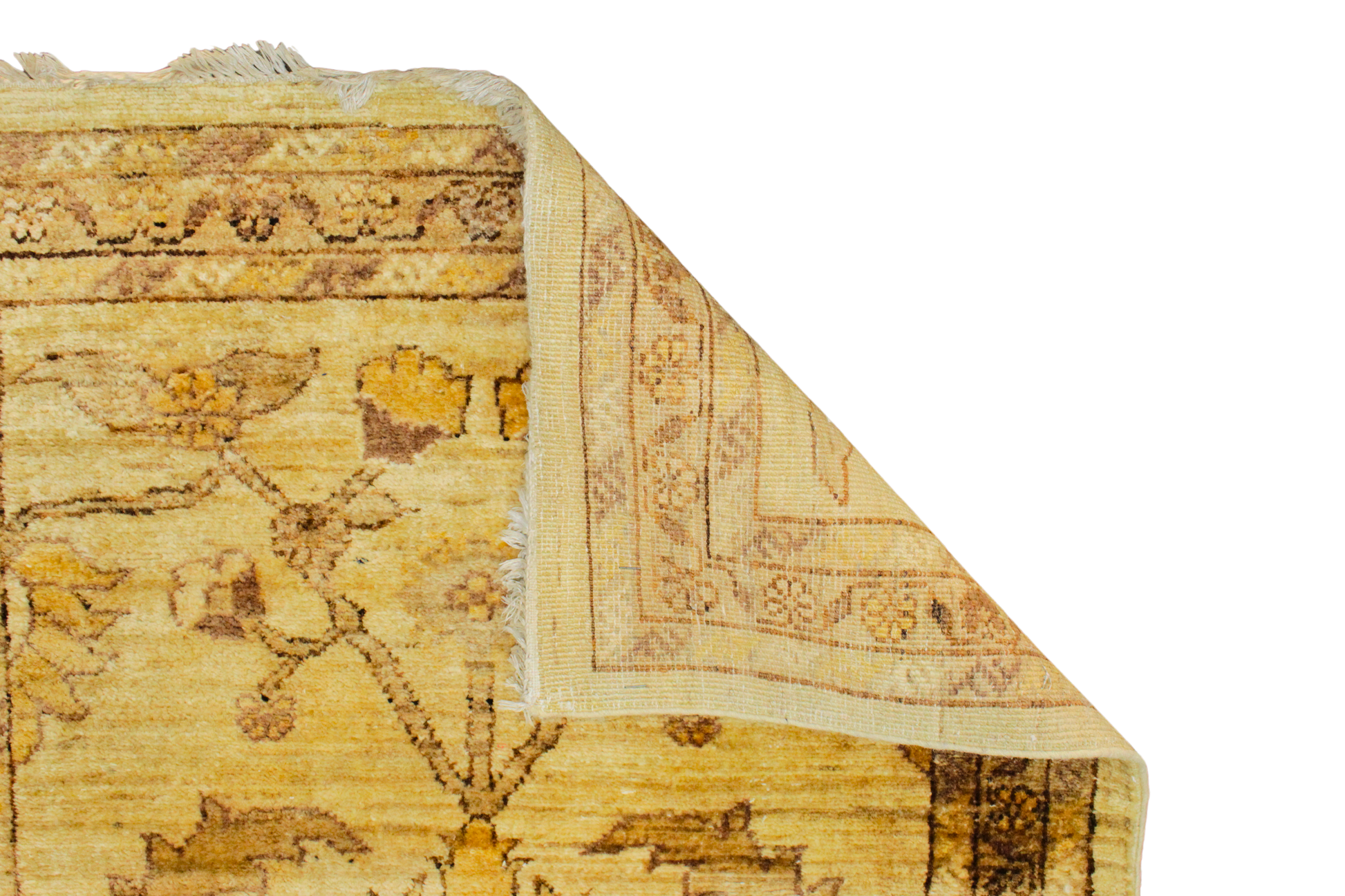 This long and graceful Afghan Oushak runner exudes quiet refinement through its delicate interplay of sand, taupe, and walnut tones. Flowing botanical motifs and stylized palmettes wind through the field in a mirrored layout, offering a subtle symmetry that calms and elongates the space. Its time-softened colors and lightly aged patina add depth and authenticity to its character.