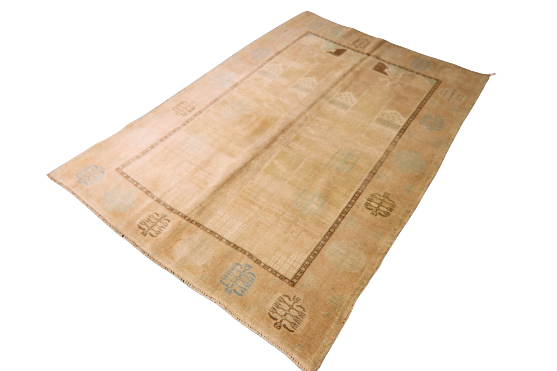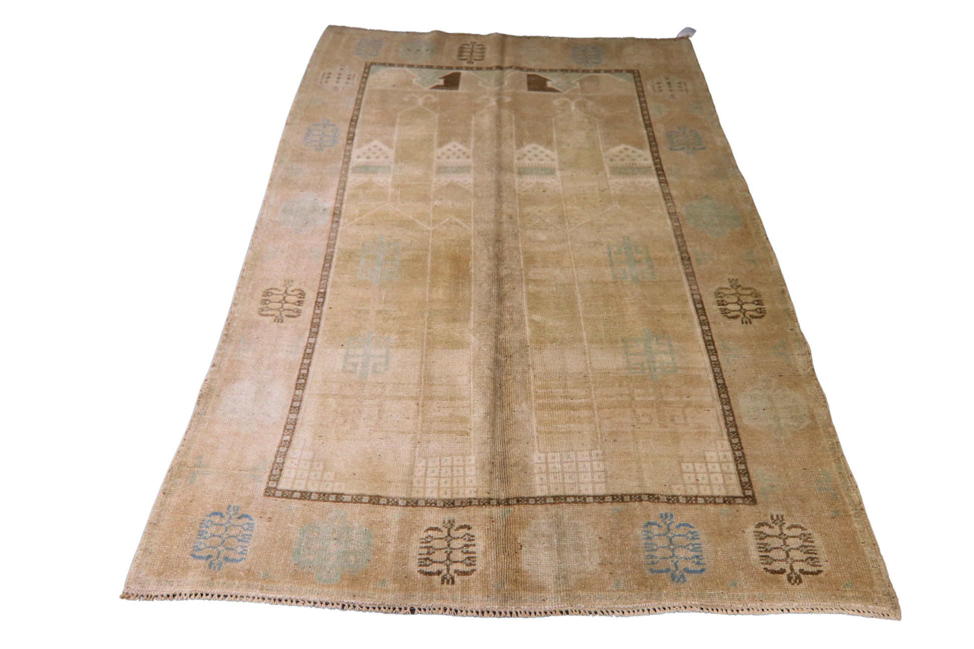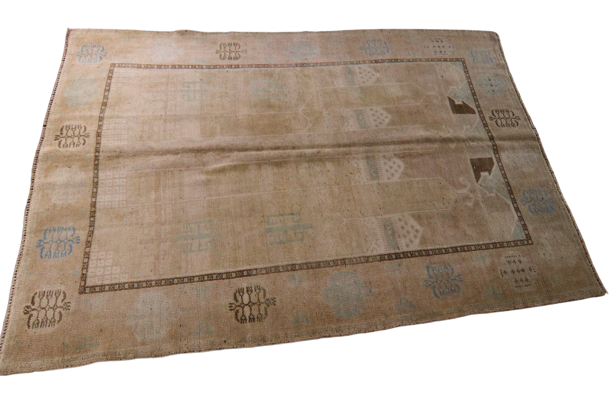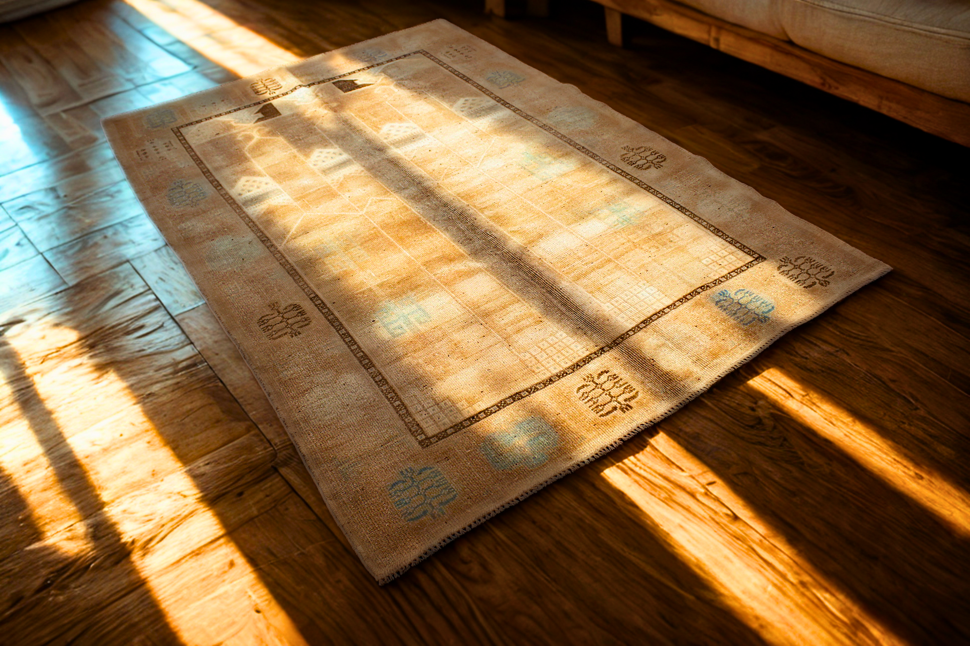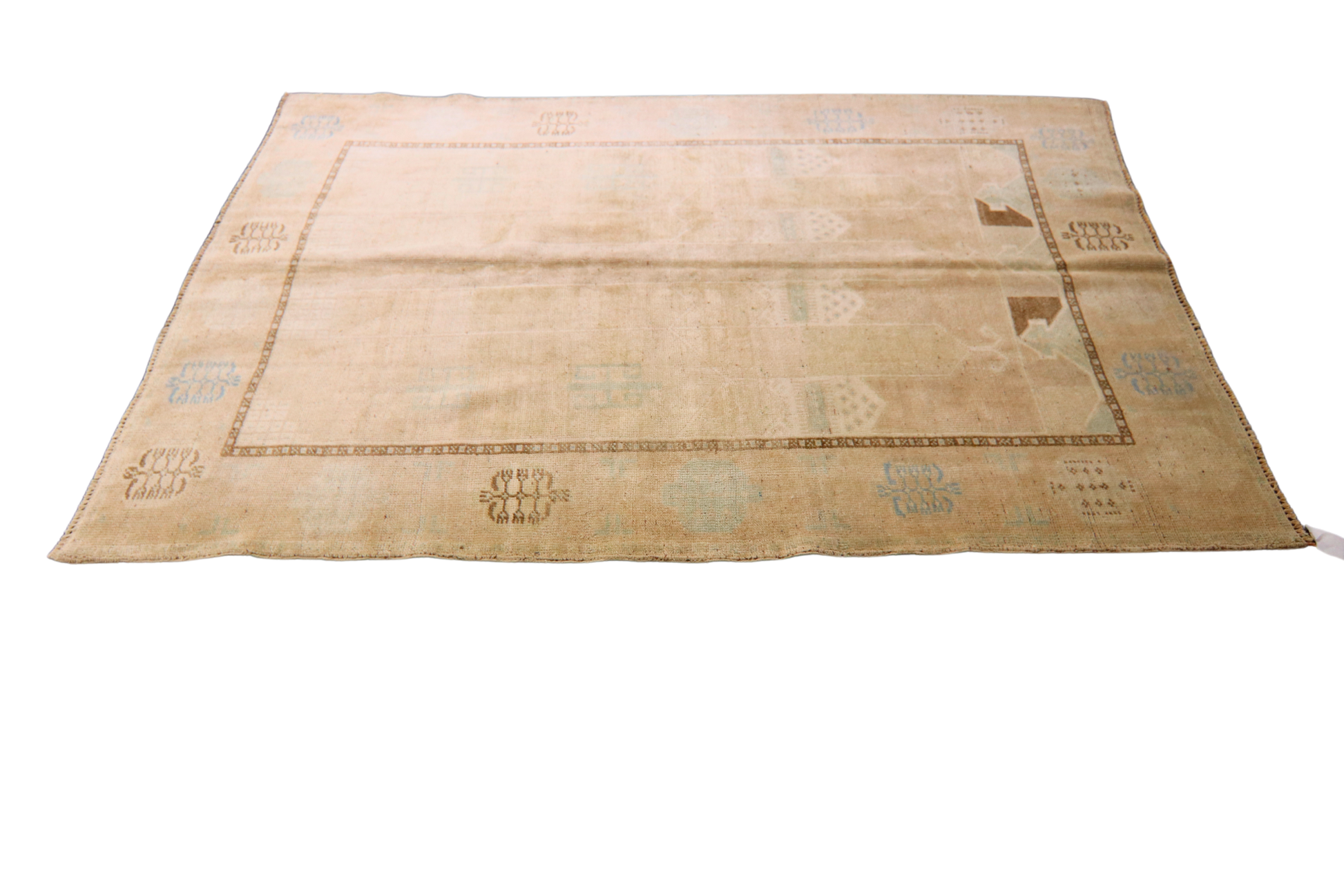 Soft as a whisper and delicate as faded parchment, this antique Turkish Oushak rug (4.9 × 7 ft) exudes a minimalist charm born of time and subtle craftsmanship. The faint silhouettes of paired mihrab-style motifs and stylized medallions rest within an open, sandy beige field. Muted sky blues and washed-down taupes gently echo around the edges, offering a visual rhythm that’s almost spiritual in nature.