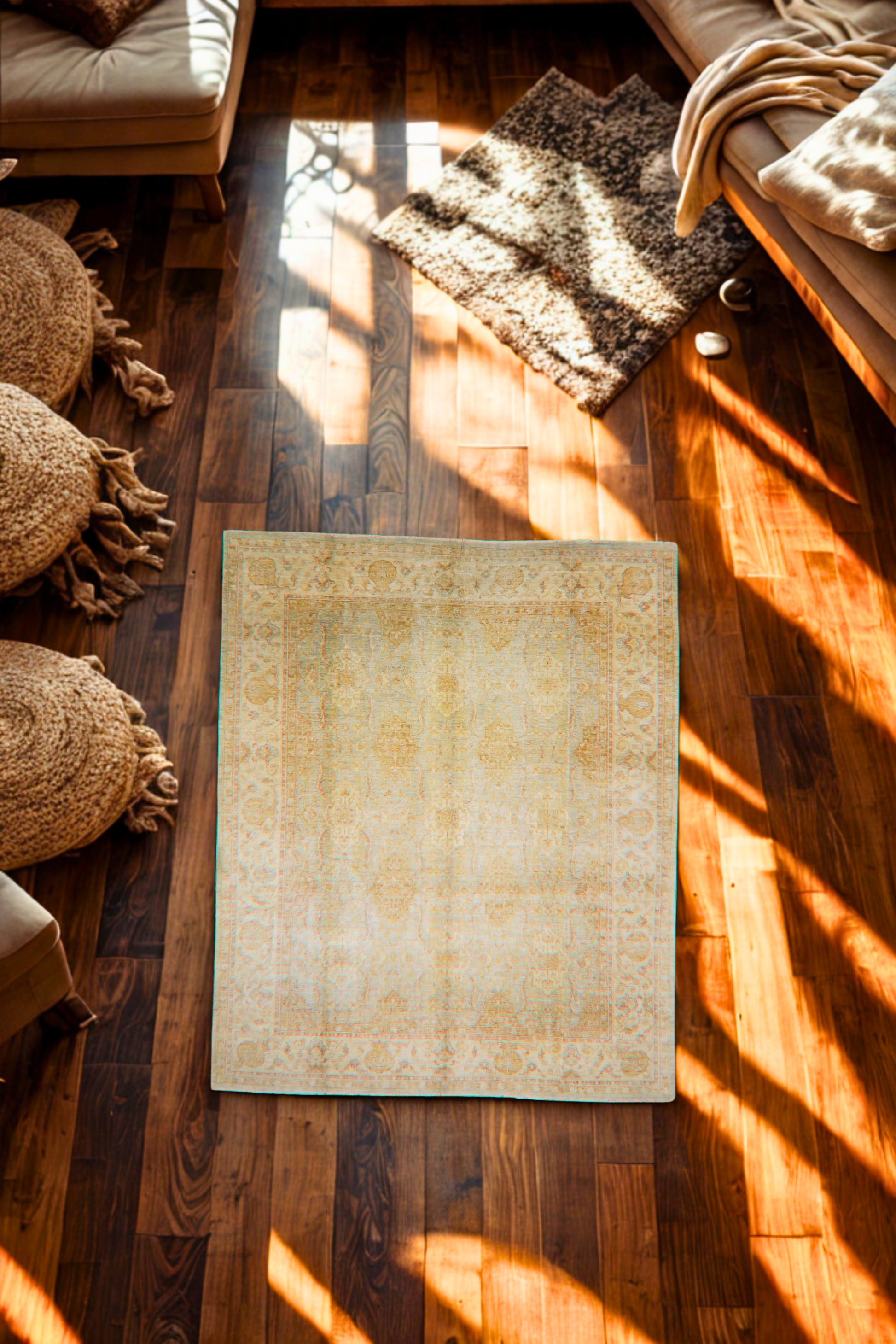 Effortlessly elegant, this 7.11 × 9.7 ft Oushak rug from Afghanistan bathes the room in a soft, luminous glow. Its washed ivory field is adorned with a classic palmette and vine lattice, rendered in muted sand and faded peach—tones that gently shift with the light and time of day. The subtle contrast and delicate design give it an ethereal presence that complements both traditional and modern interiors.