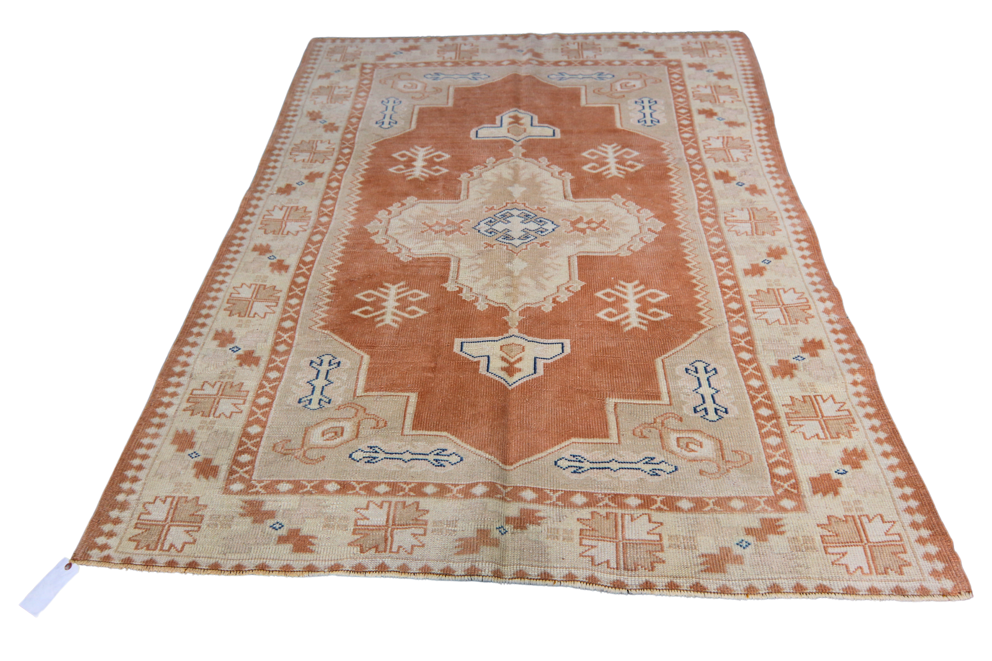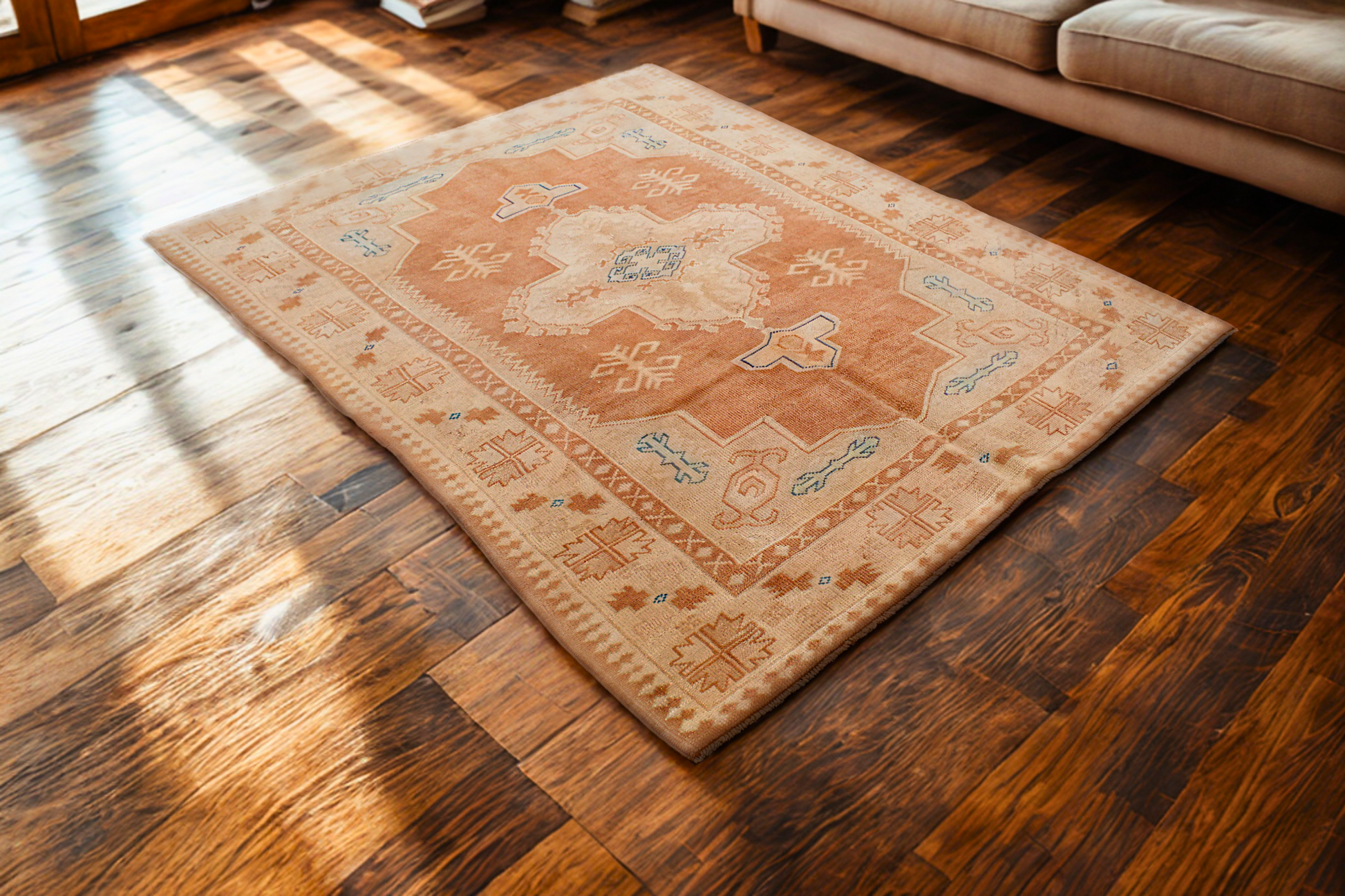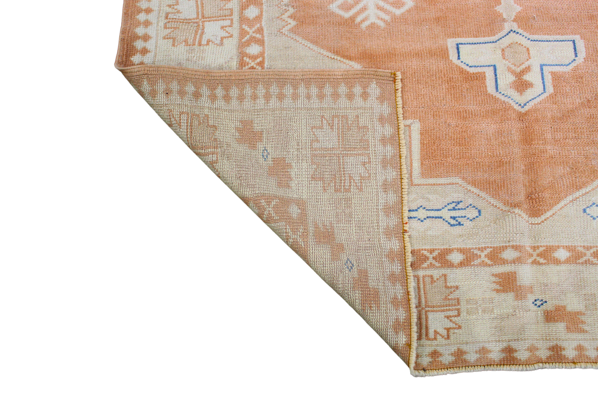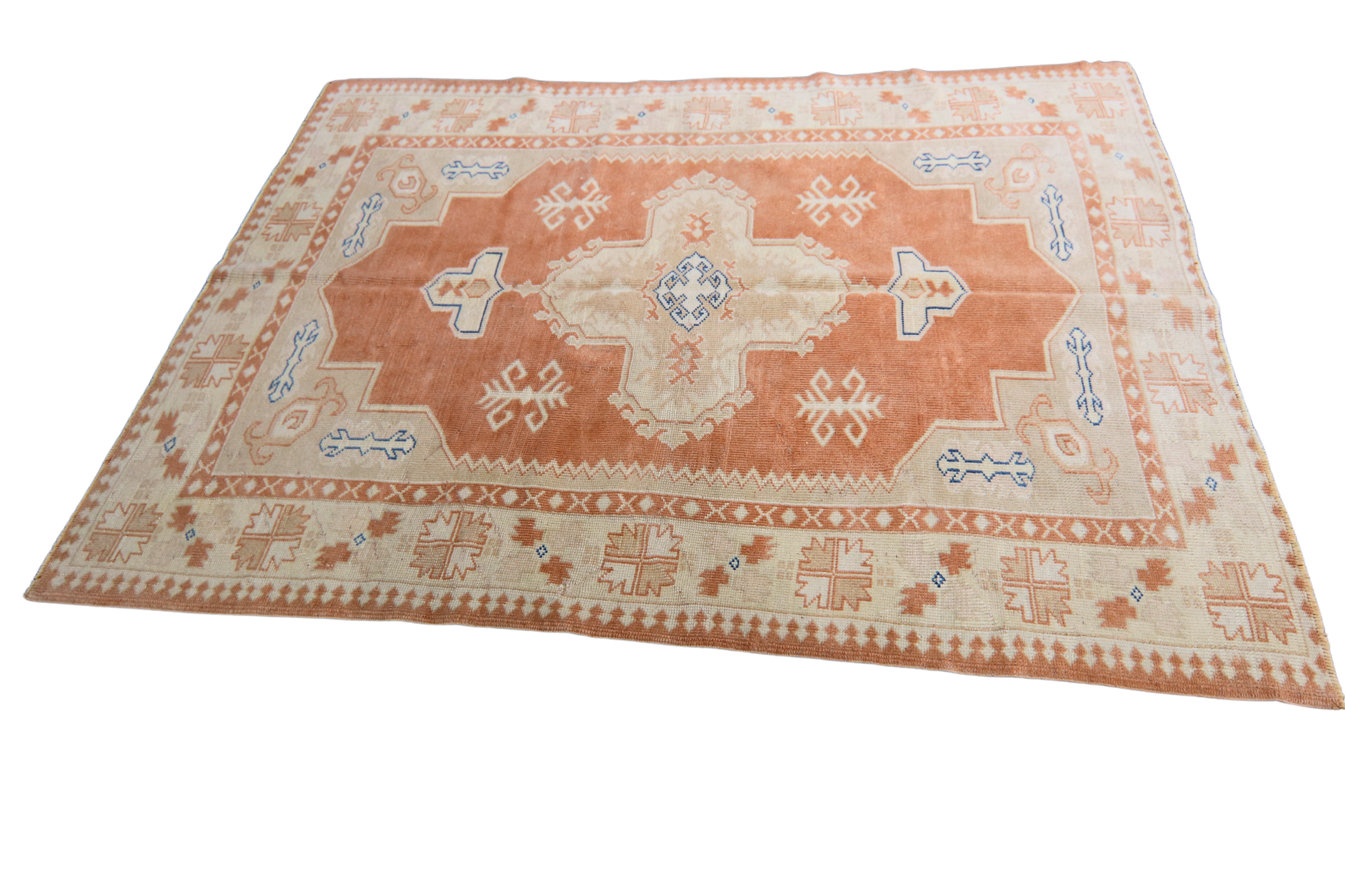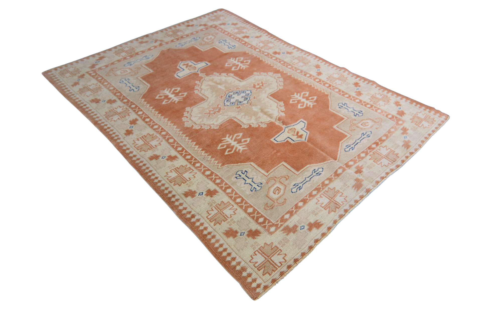 Softly sun-washed and richly symbolic, this antique Turkish Oushak rug (5.3 × 6.8 ft) brings a feeling of grounded elegance to any space. A terracotta-rose field anchors the piece, housing a central ivory medallion with gentle touches of sky blue and delicate tribal motifs. The stepped corners and stylized floral emblems are rendered in a simplified, geometric form, evoking the timeless charm of Anatolian weaving.