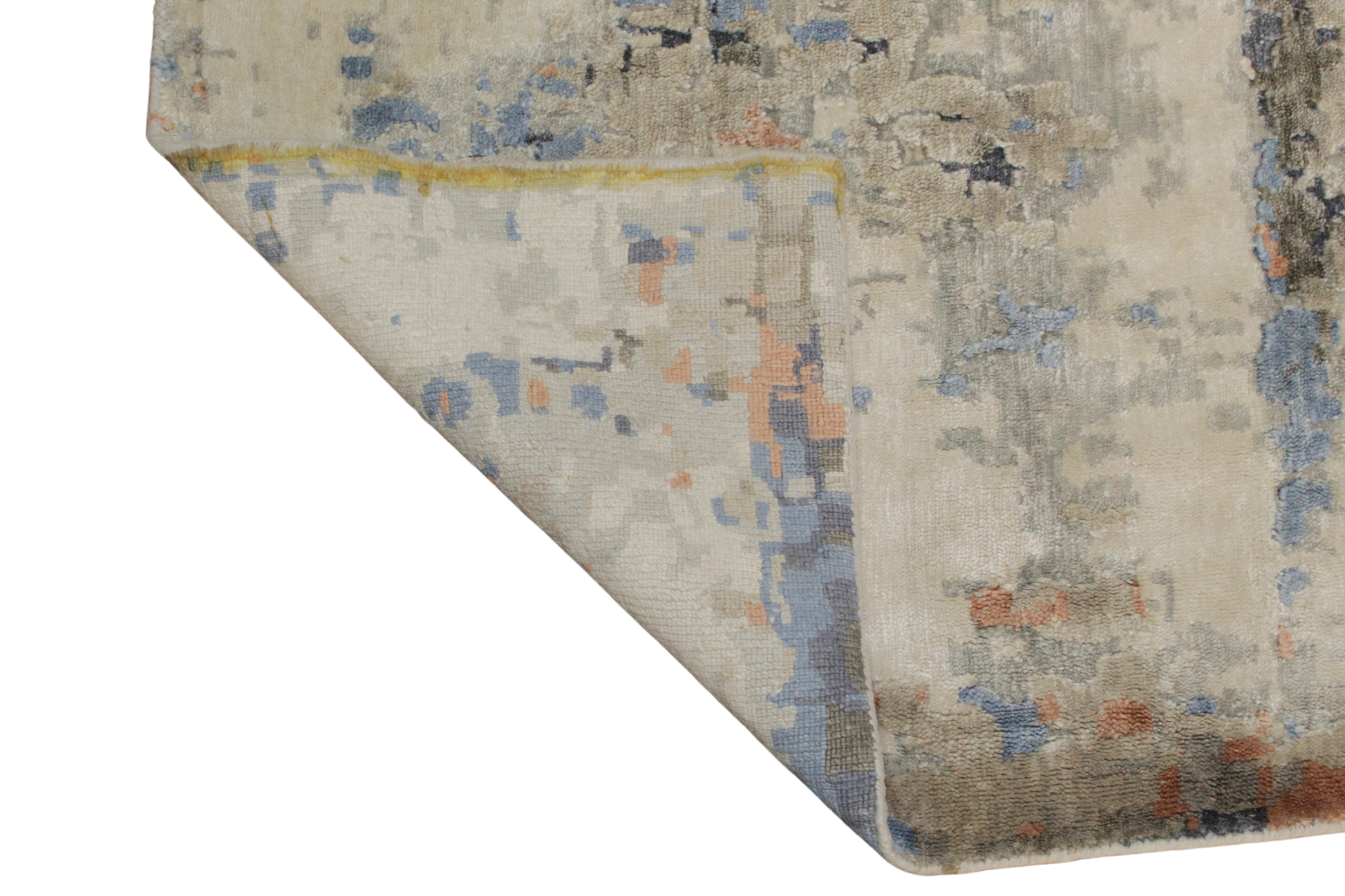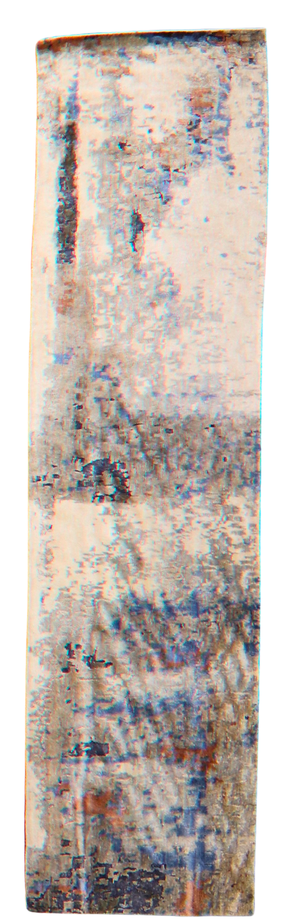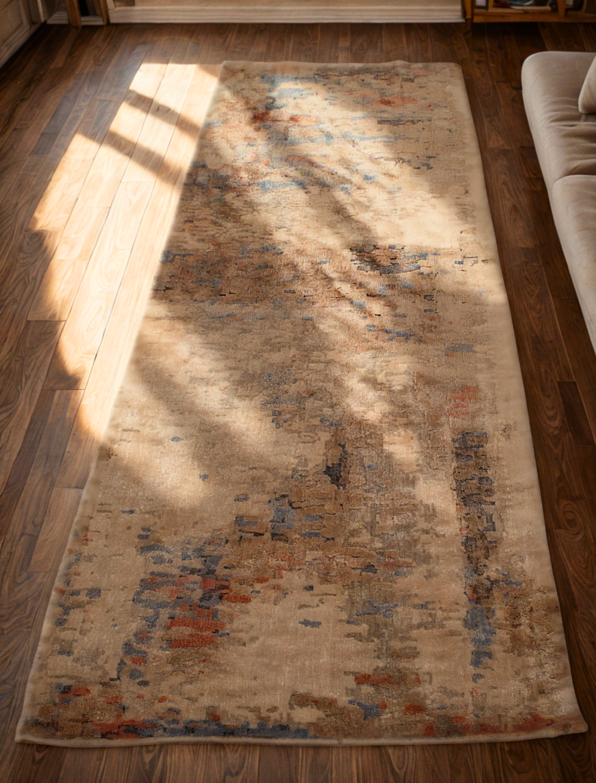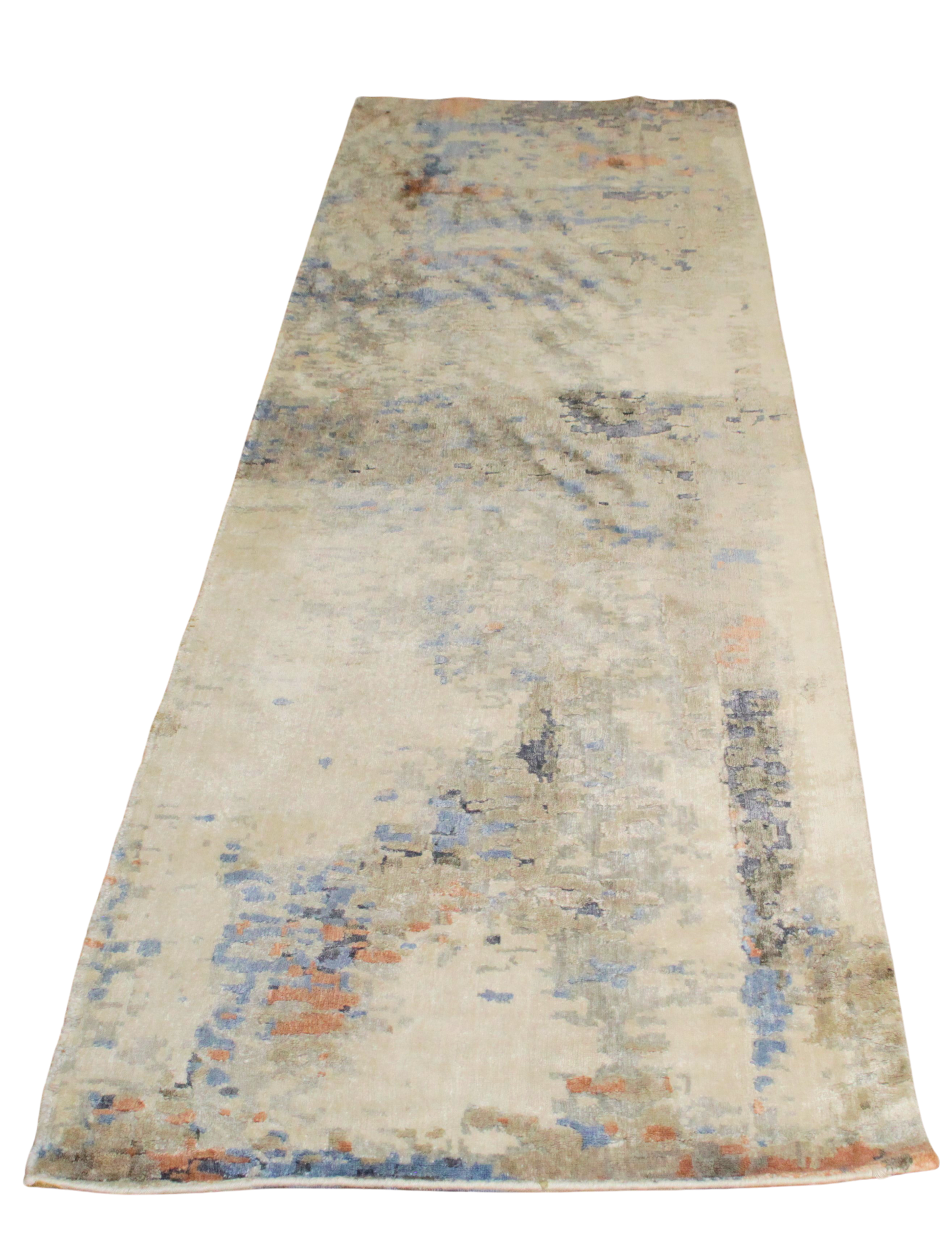 Ethereal yet grounded, this hand-knotted runner from Nepal (2.7 × 9.10 ft) captures the fleeting beauty of a hazy sunrise. Its soft ivory field is gently overlaid with strokes of muted blue, smoky gray, and rust-orange—like abstract impressions painted across a canvas. The palette brings a sense of calm, while the uneven, weathered texture adds quiet depth.