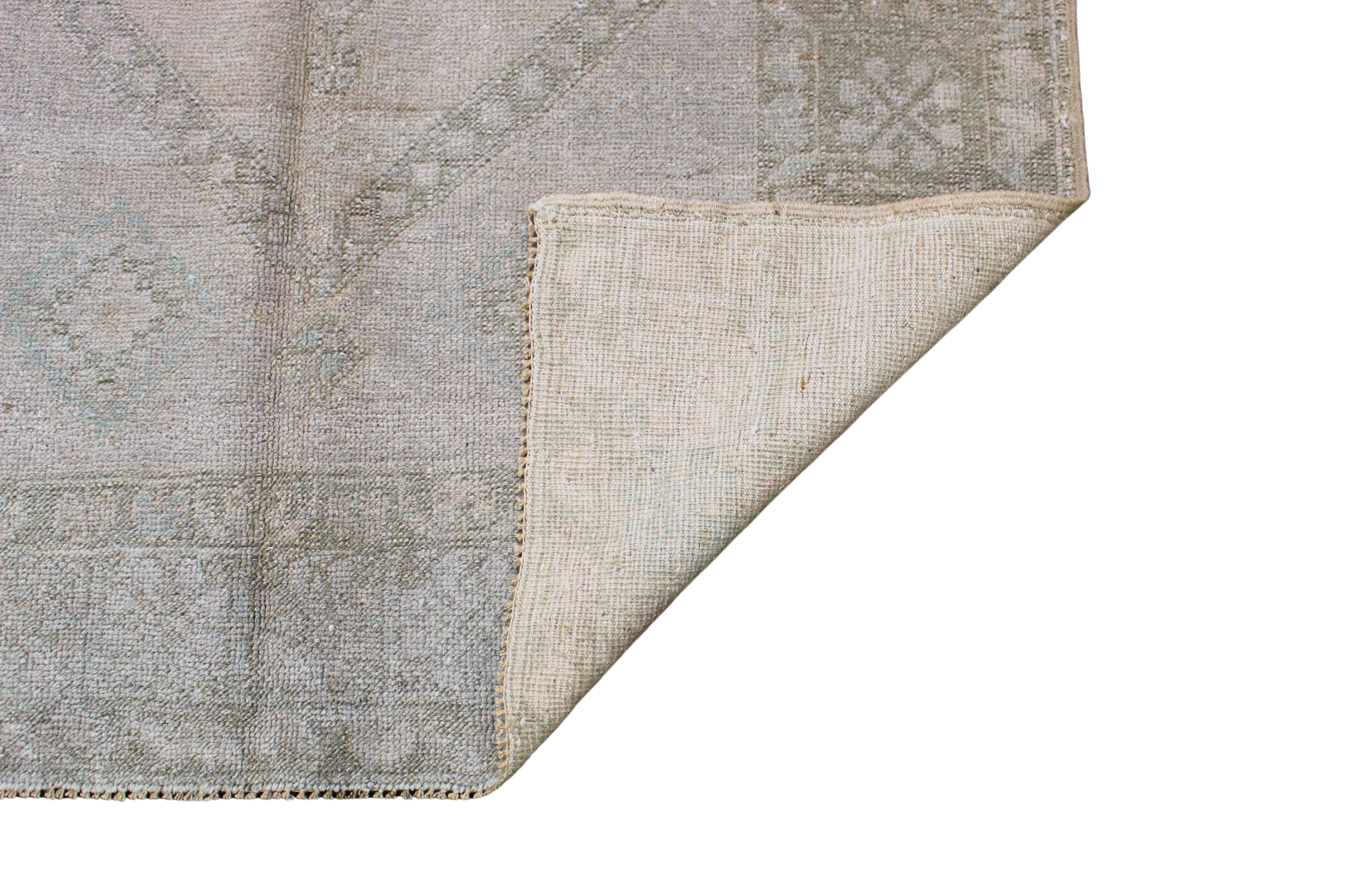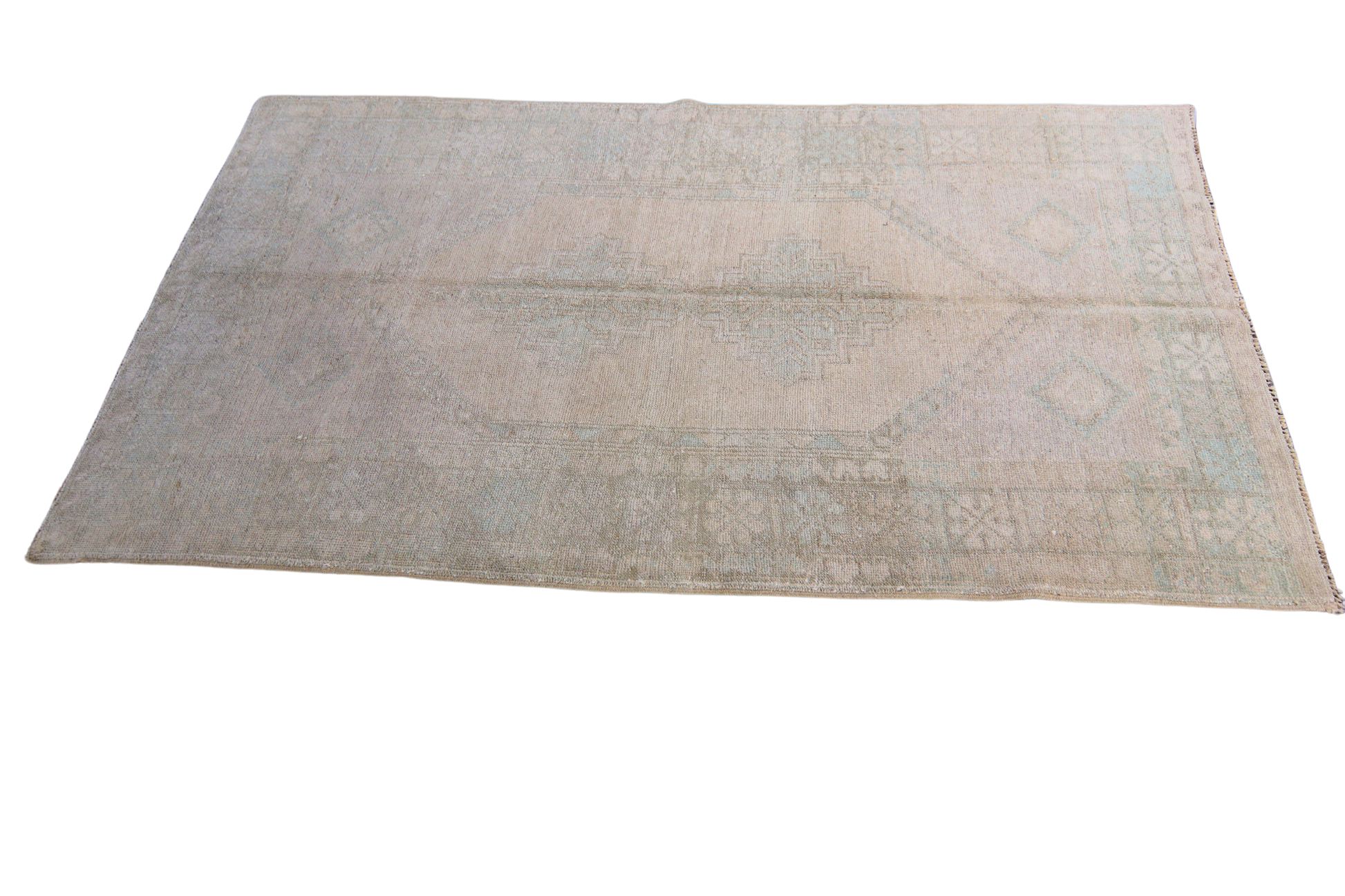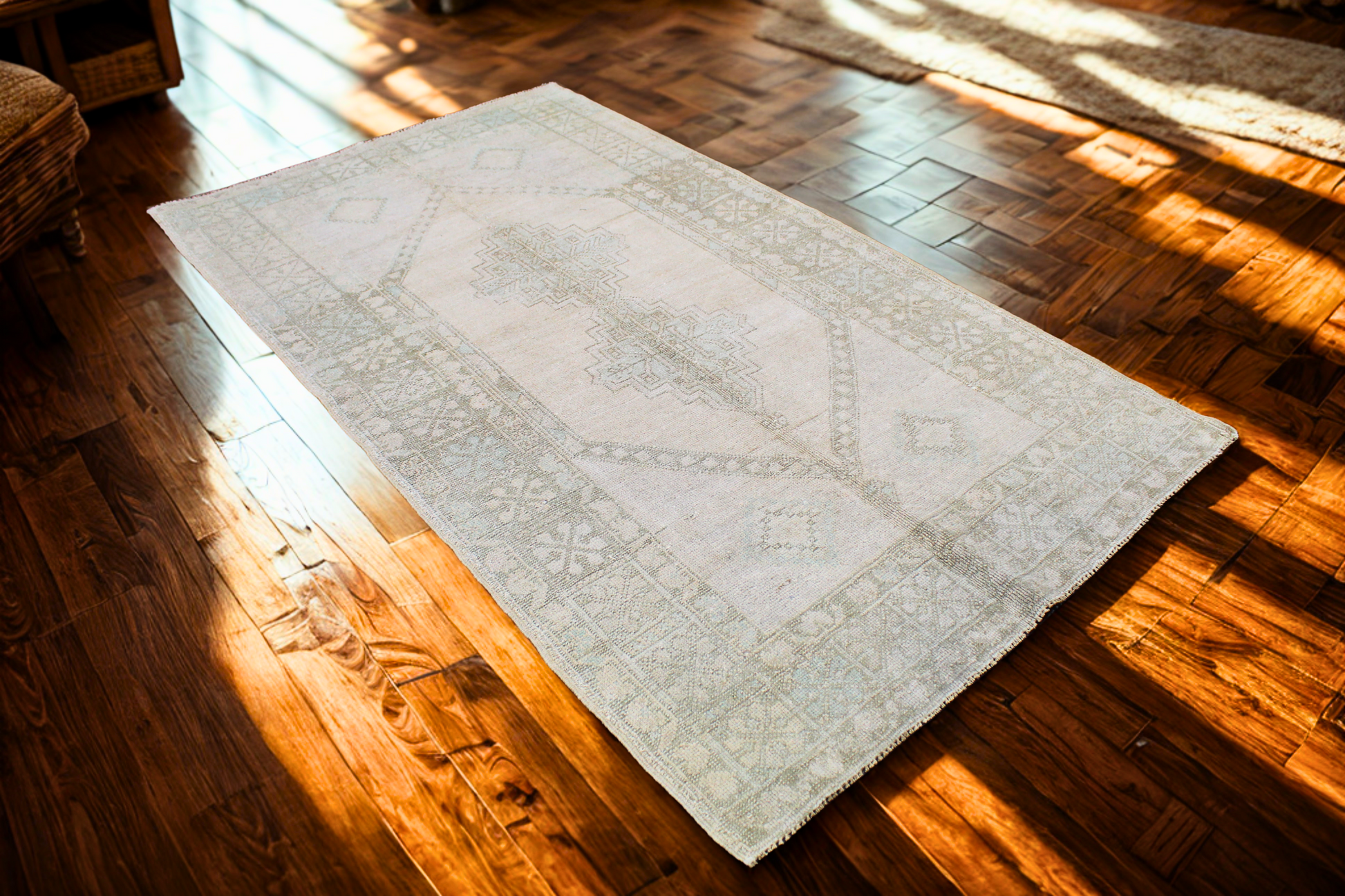 Ethereal and quietly elegant, this antique Oushak rug from Turkey (3.8 × 6.5 ft) offers a delicate interplay of ivory and faded mist-blue tones. The design, worn to near-ghostly softness, reveals subtle geometric medallions and corner spandrels barely emerging from the gently distressed surface. It's the kind of piece that feels almost dreamlike — understated yet immensely sophisticated.