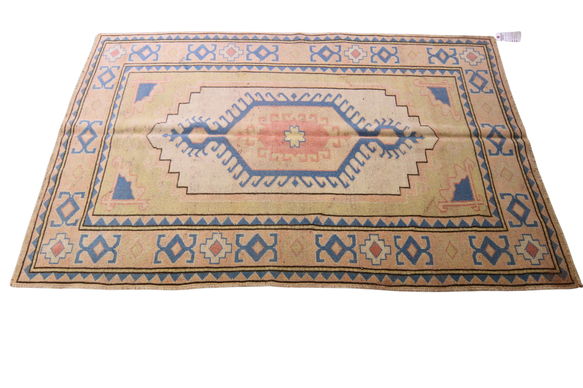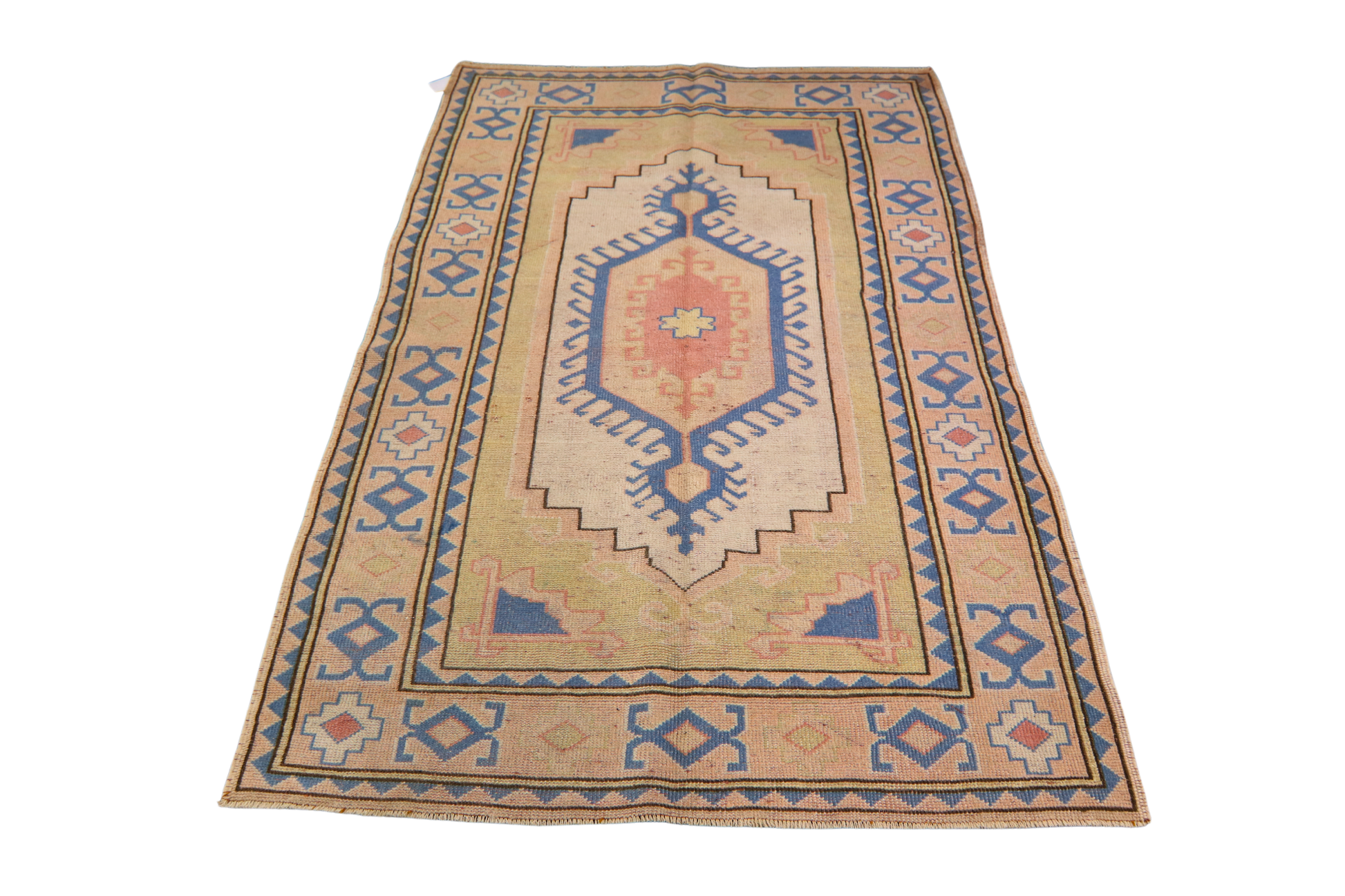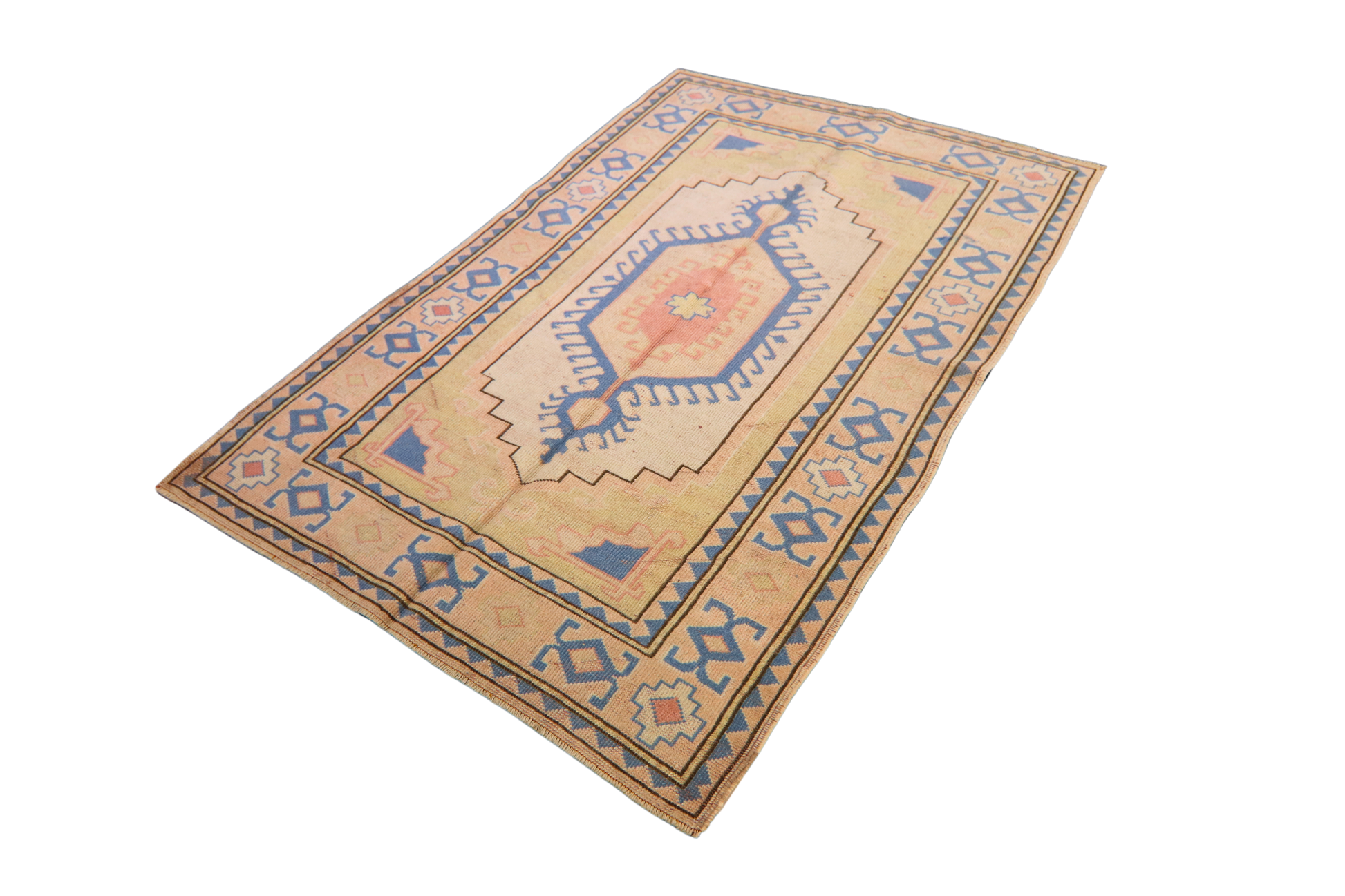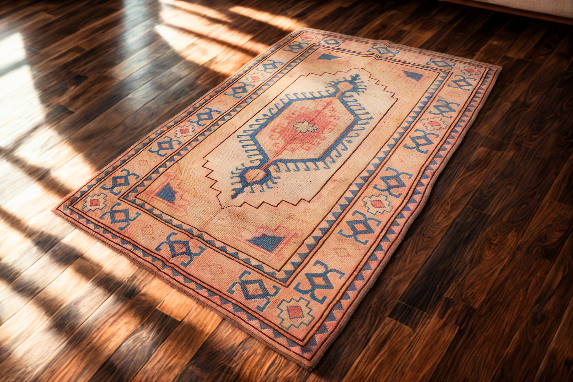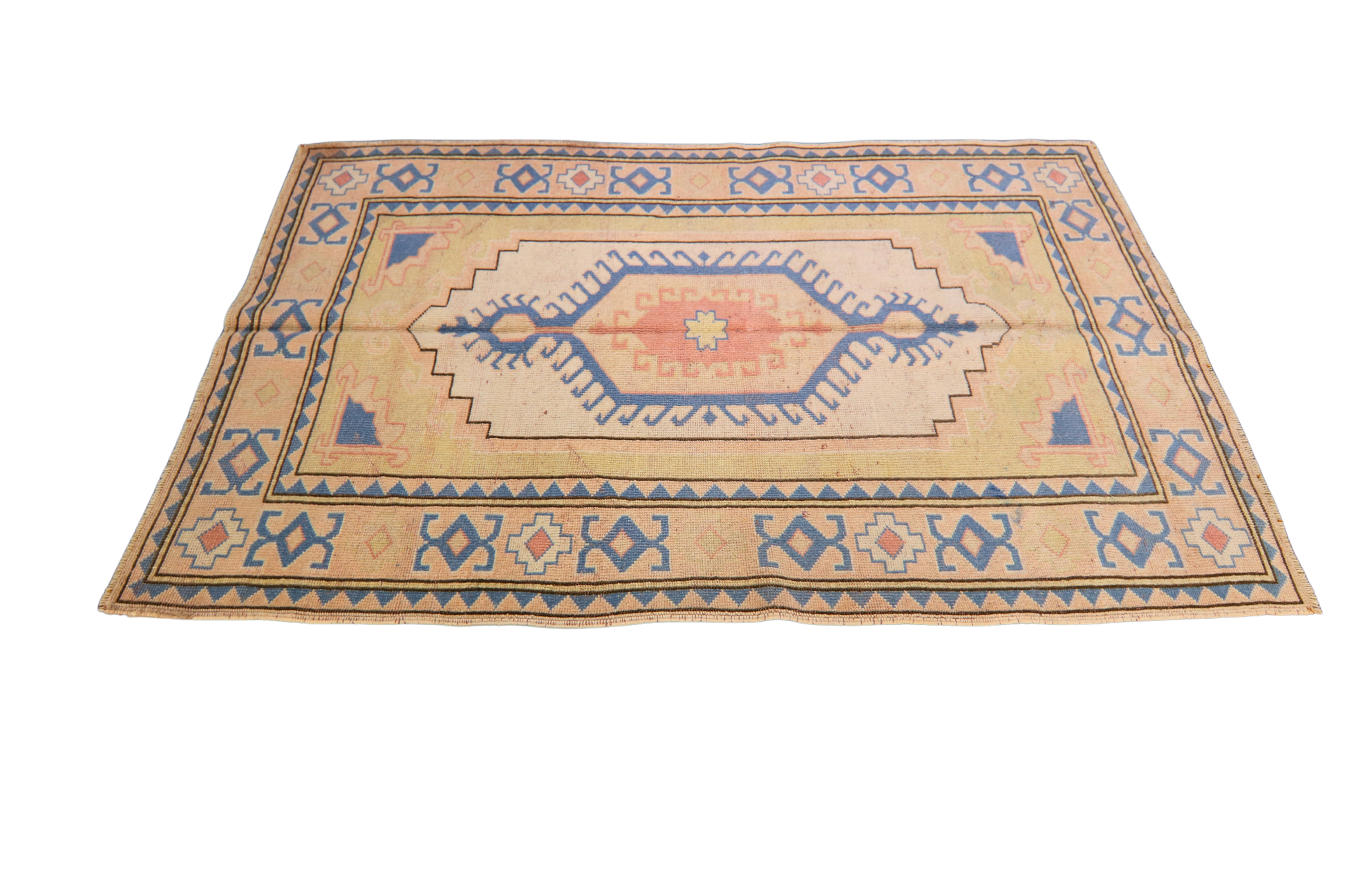 With a striking central medallion that glows like the last light of day, this antique Turkish Oushak rug (4 × 6 ft) balances tribal geometry with a soft, sun-washed palette. The field blends blush sand and cream, framing a stepped diamond motif in pale coral and blue. The borders, with their charmingly naive motifs, echo traditional Anatolian symbolism while maintaining a restrained, minimalistic charm.