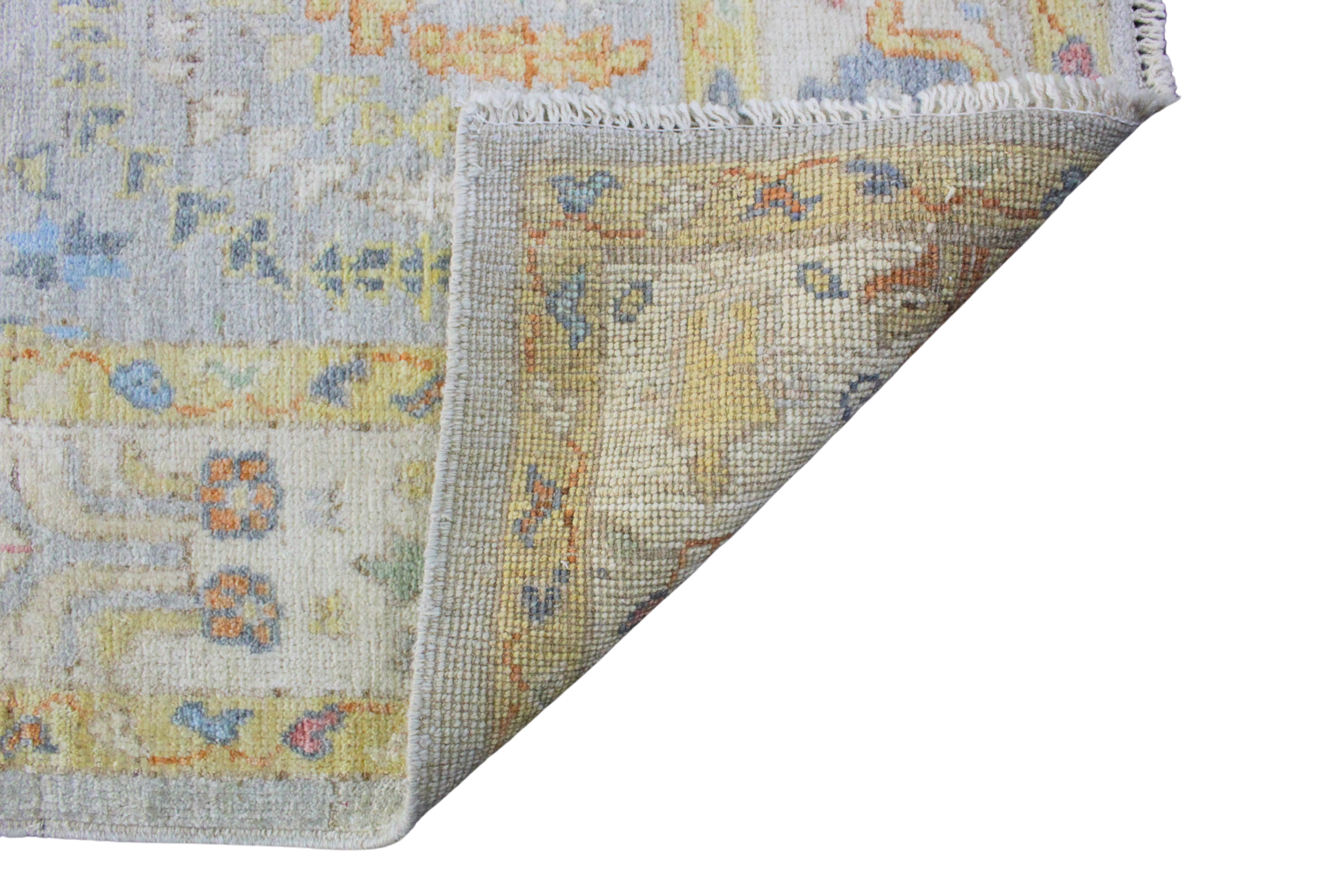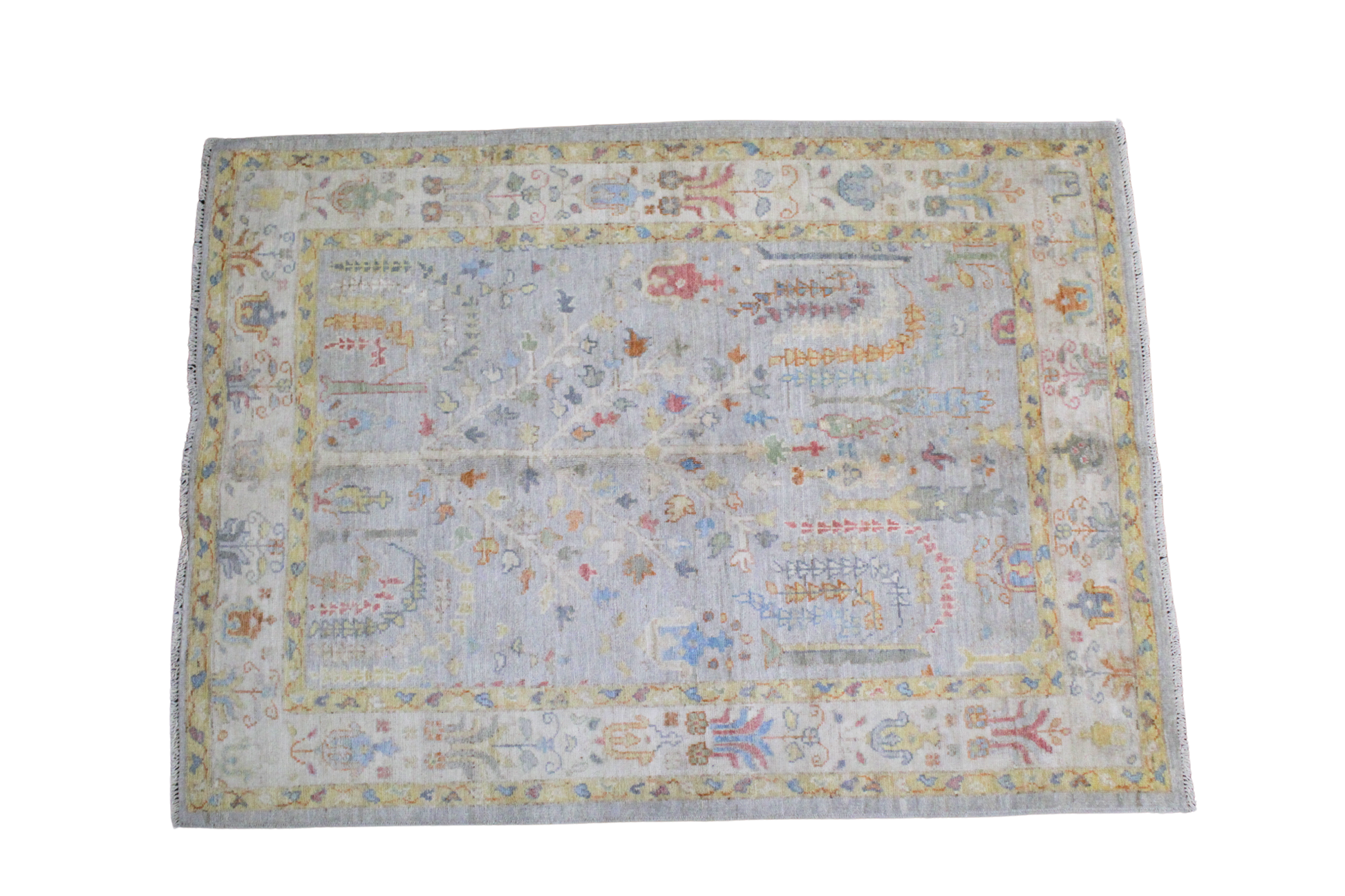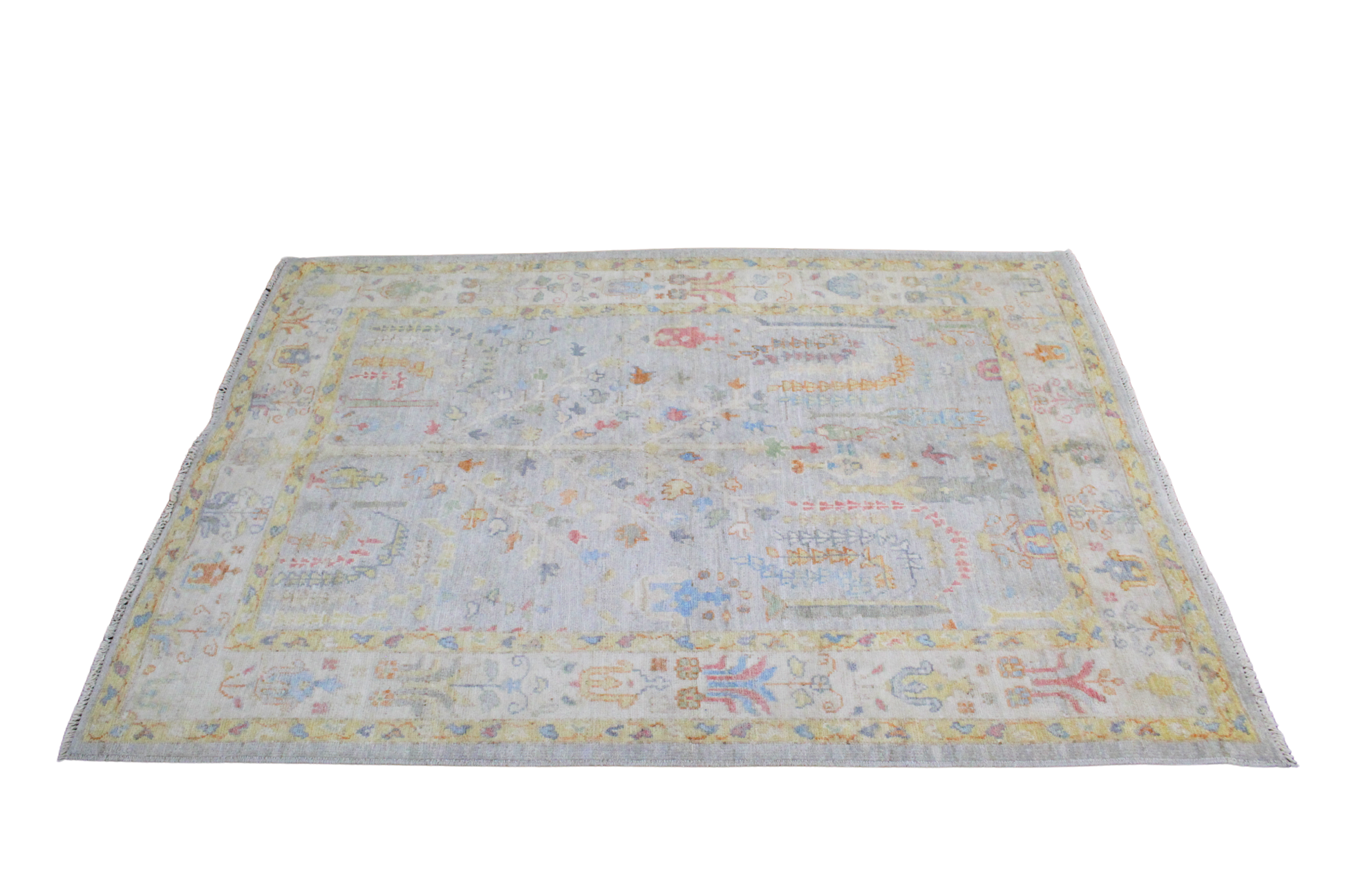 Delicately woven like a spring garden in bloom, this 5.1 × 6.11 ft Afghan Oushak rug introduces soft whimsy into traditional form. Set against a muted sky-blue base, the rug blossoms with small-scale botanical and vine motifs in cheerful shades of rose, butter yellow, sky blue, peach, mint green, and soft lavender. The intricate border frames the field with a gentle rhythm of color and form.