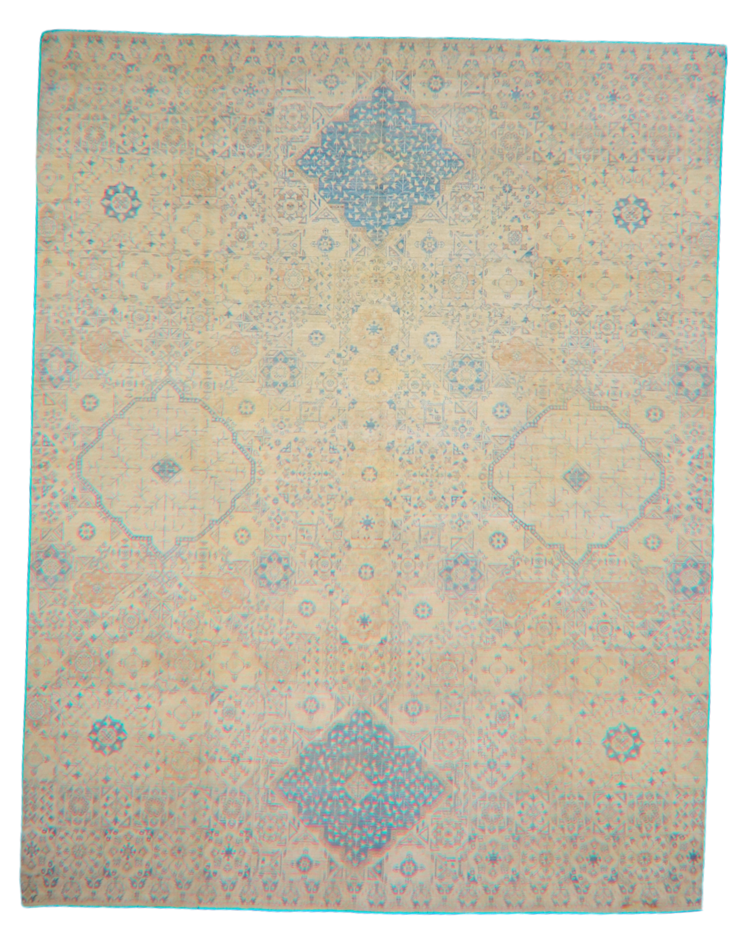 This captivating Oushak Afghan rug (8.1×10.4 ft) is a rare example of refined geometry balanced with soothing color. At its heart lies a central medallion in soft denim blue, echoed in symmetrical octagonal motifs across the field.
