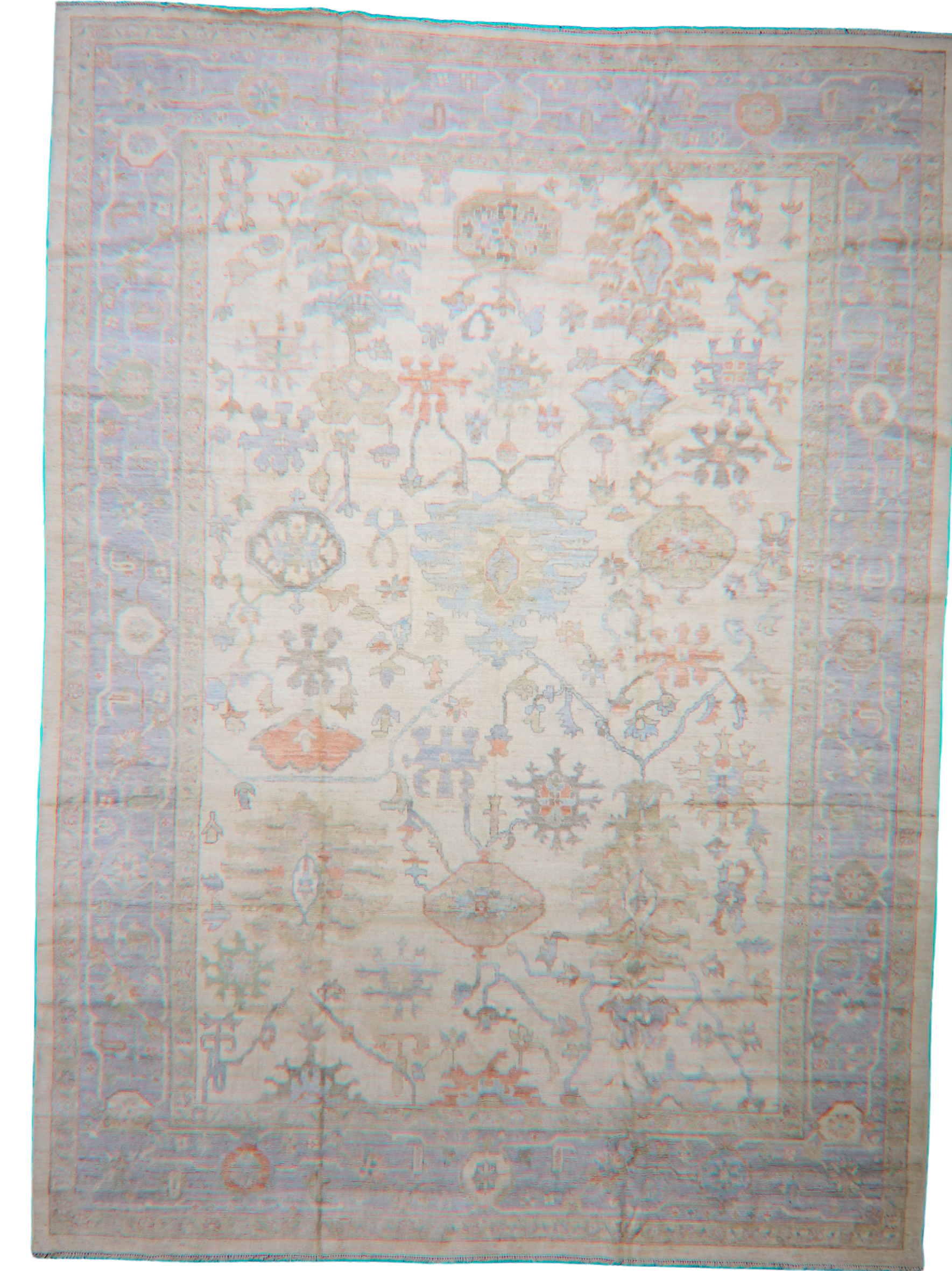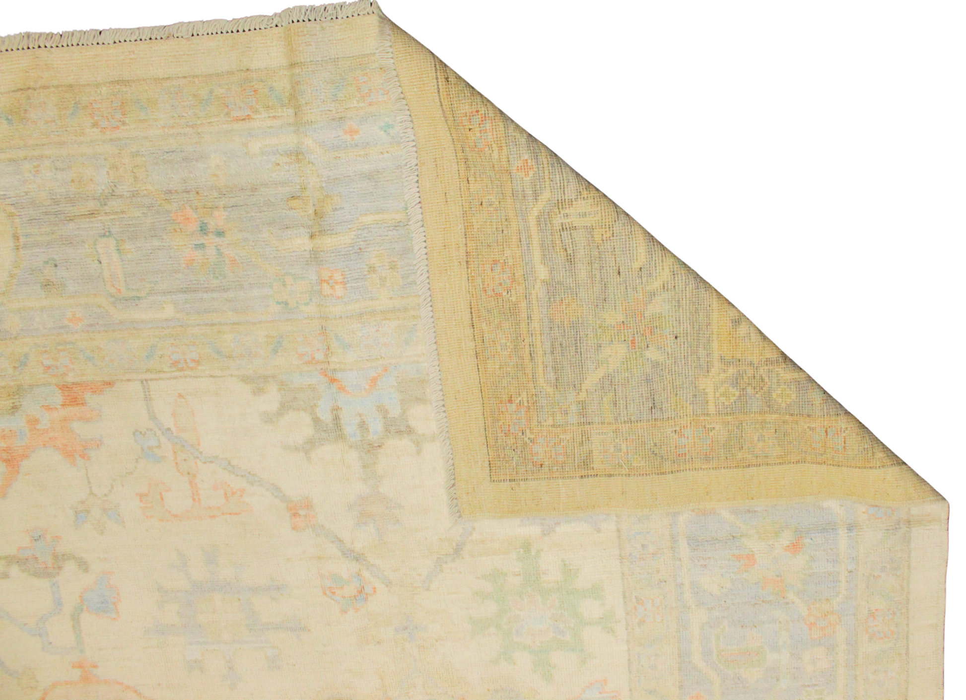The design embraces the loose, artistic character of traditional Oushak weaving, marked by expansive spacing and organic symmetry. A powdery blue border anchors the composition, framing the center in serene definition. This piece is ideal for contemporary interiors that favor understated elegance or traditional rooms in need of a soft focal point.
