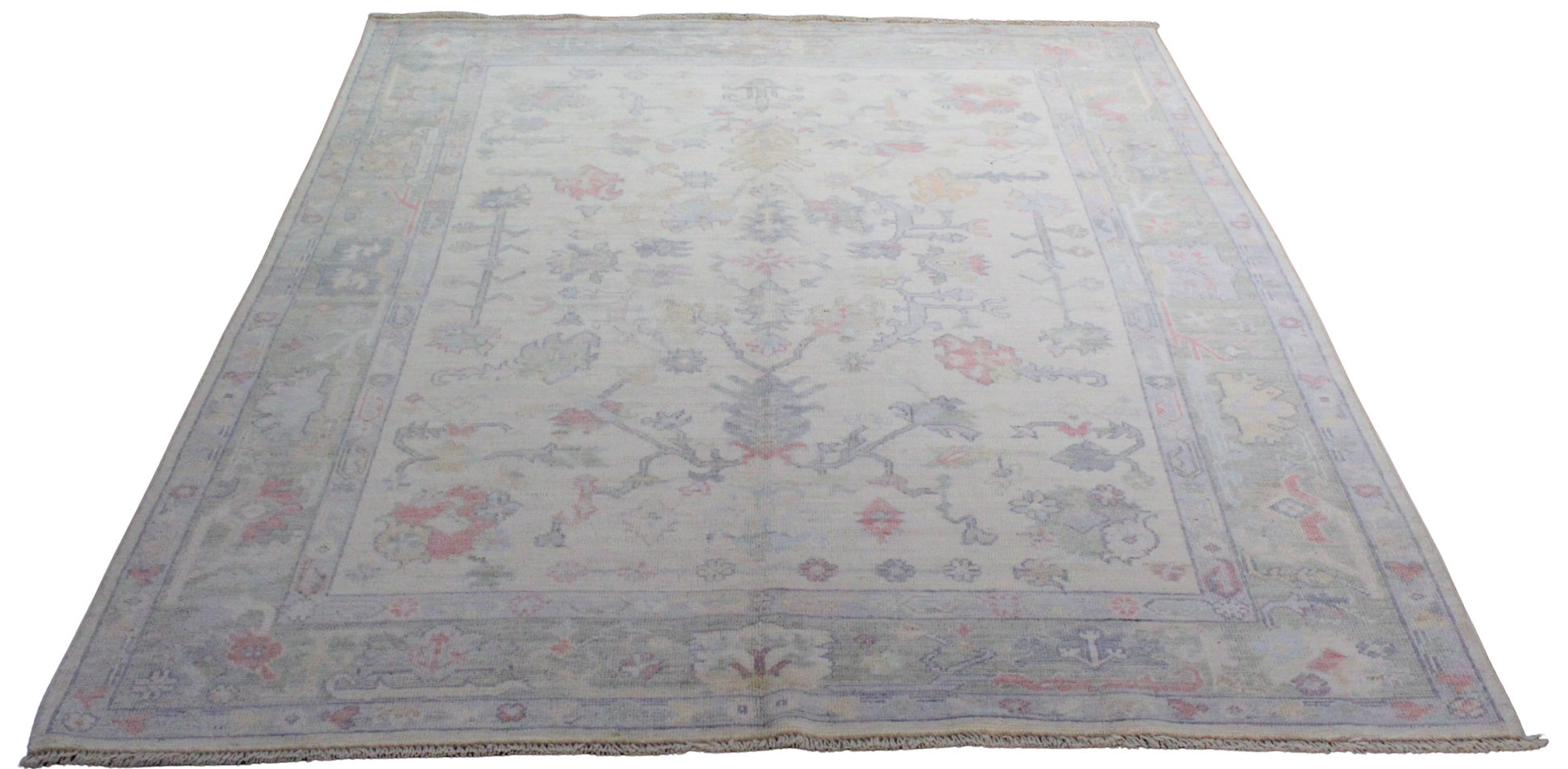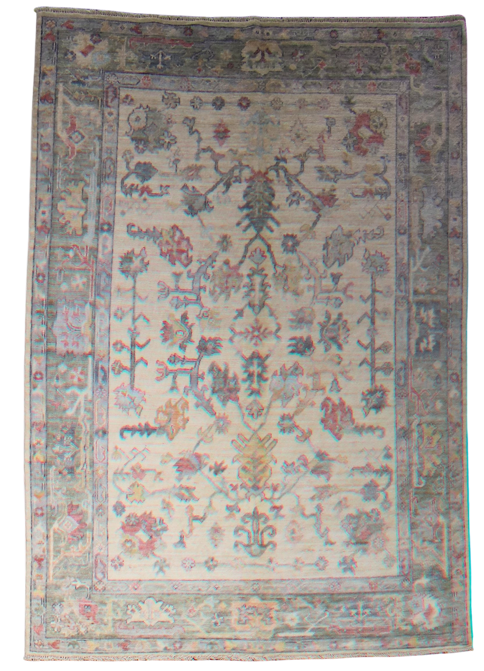 Delicate yet grounded, this Hand-knotted Afghan Oushak rug (6.1 × 8.9 ft) strikes a lovely balance between rustic charm and refined tradition. Its ivory field is brought to life with a lively arrangement of angular florals and stylized palmettes in tones of moss green, faded coral, goldenrod, dusty blue, and muted brick. The sage-toned border, filled with alternating tribal motifs, provides structure without overshadowing the rug’s artistic spontaneity.