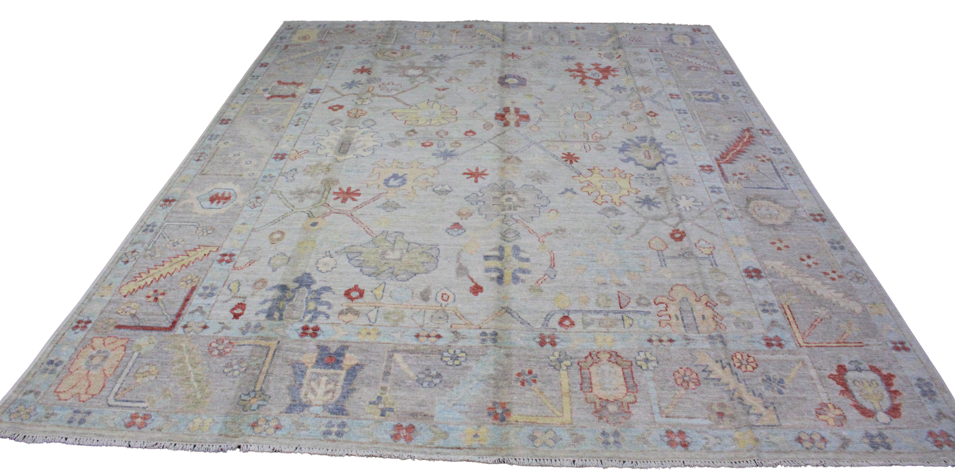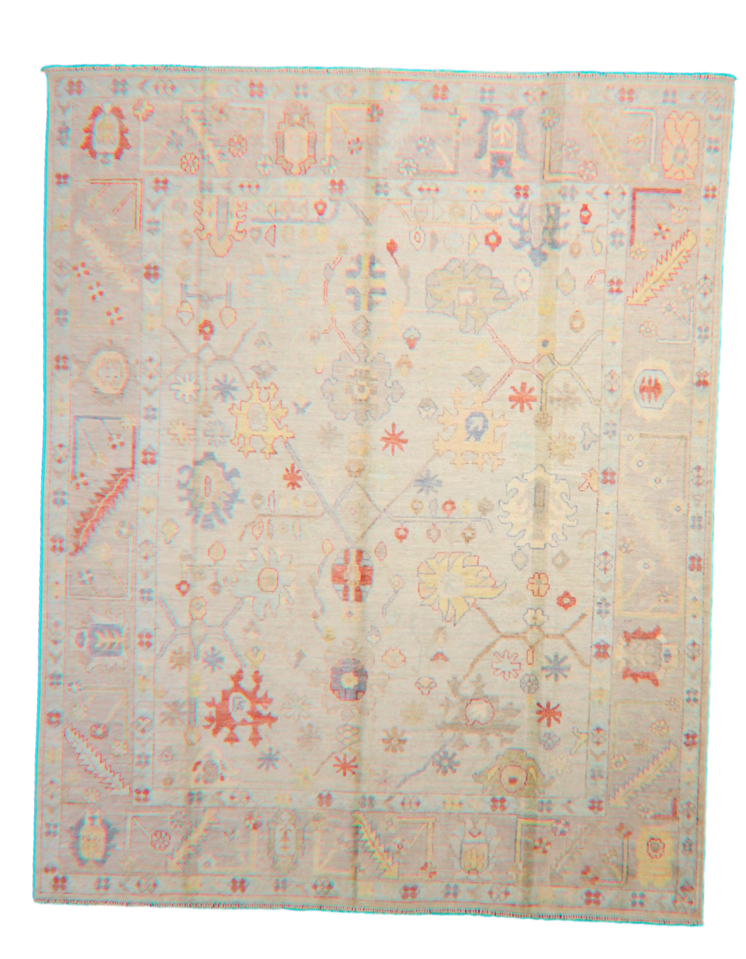 Lighthearted yet steeped in tradition, this Afghan Oushak rug (7.11 × 9.10 ft) radiates charm with its whimsical, scattered floral motifs and tribal medallions. The soft ivory field is animated by pastel accents in coral, cornflower blue, butter yellow, sage green, and dusty lavender. The wide border, detailed with quirky symbolic figures and botanical shapes, frames the rug like a piece of folk art brought to life.