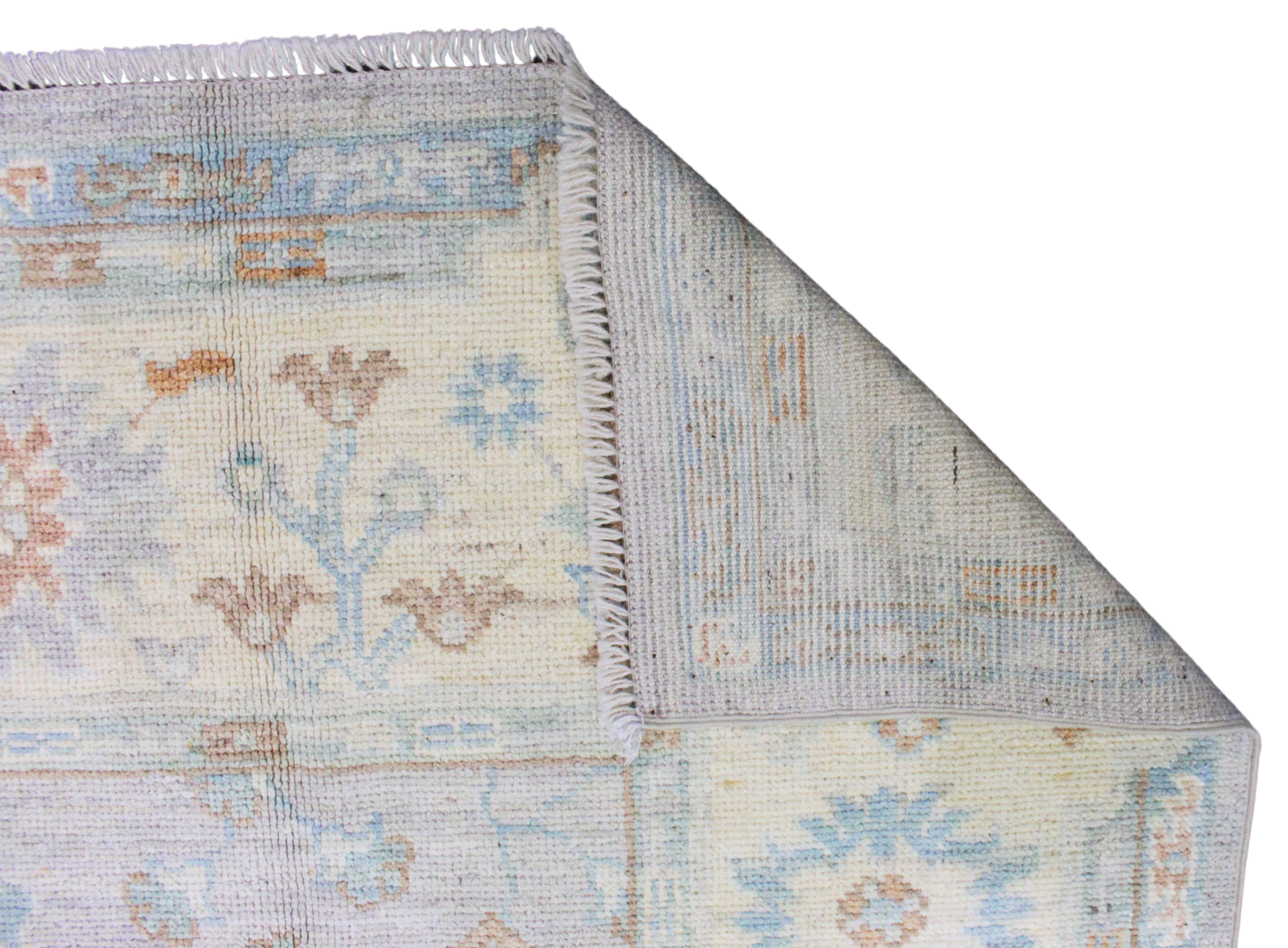 Cool, calming, and effortlessly elegant - this Afghan Oushak rug (8.1 × 9.9 ft) brings a breath of tranquility to any interior. Its soft powder blue field is adorned with a refined array of palmettes, rosettes, and scrolling vines, all rendered in muted ivory, beige, and hints of faded gold. The intricate border gently frames the composition, adding a sense of completeness without visual weight.