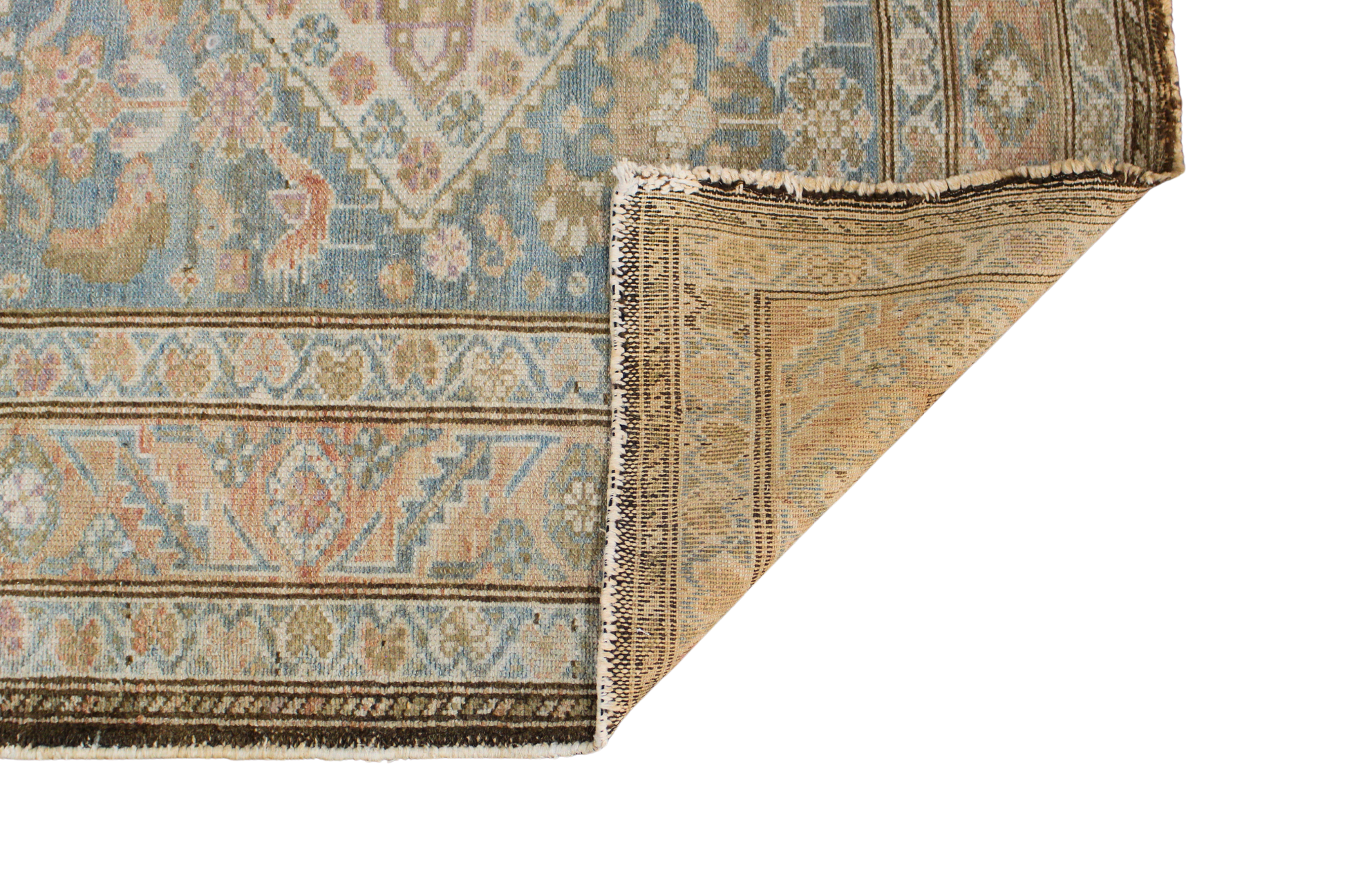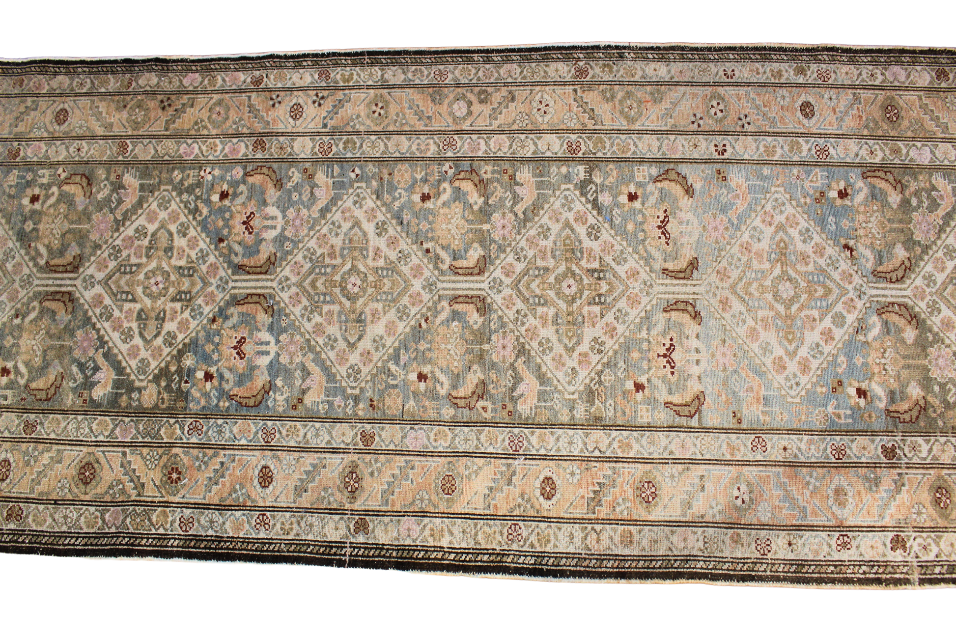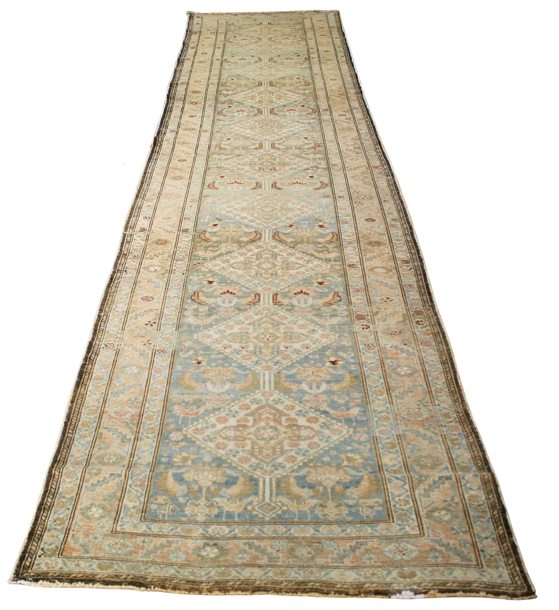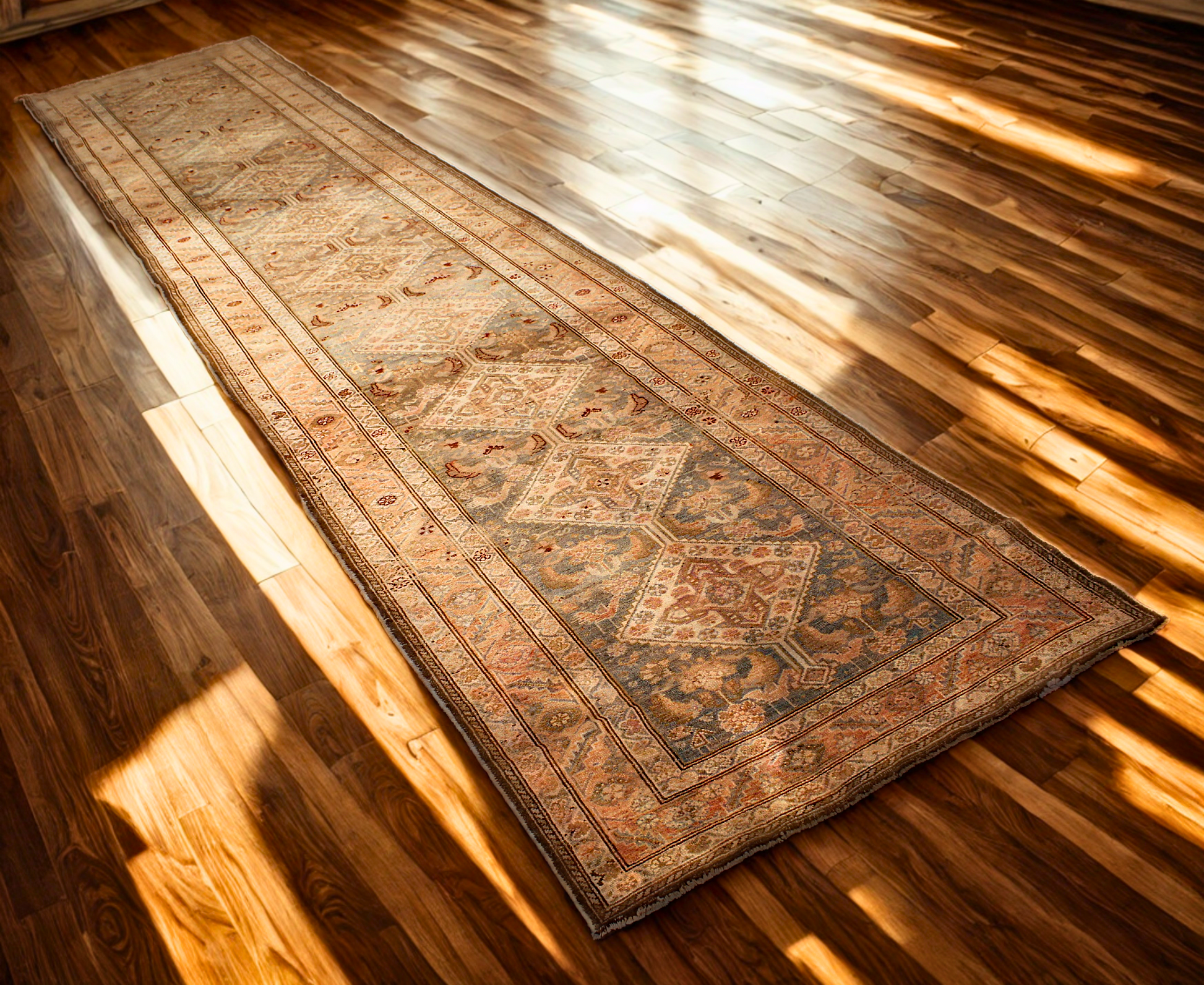 Soft and majestic, this antique Persian Malayer runner (4 × 16 ft) offers a calming presence with its cool, muted palette and rhythmic layout. Repeating diamond medallions float on a powdery blue-green field, each flanked by stylized motifs resembling ram's horns and floral bursts. The natural abrash, from faded teal to pale sand, lends a watercolor-like depth that enhances the rug’s antique character.