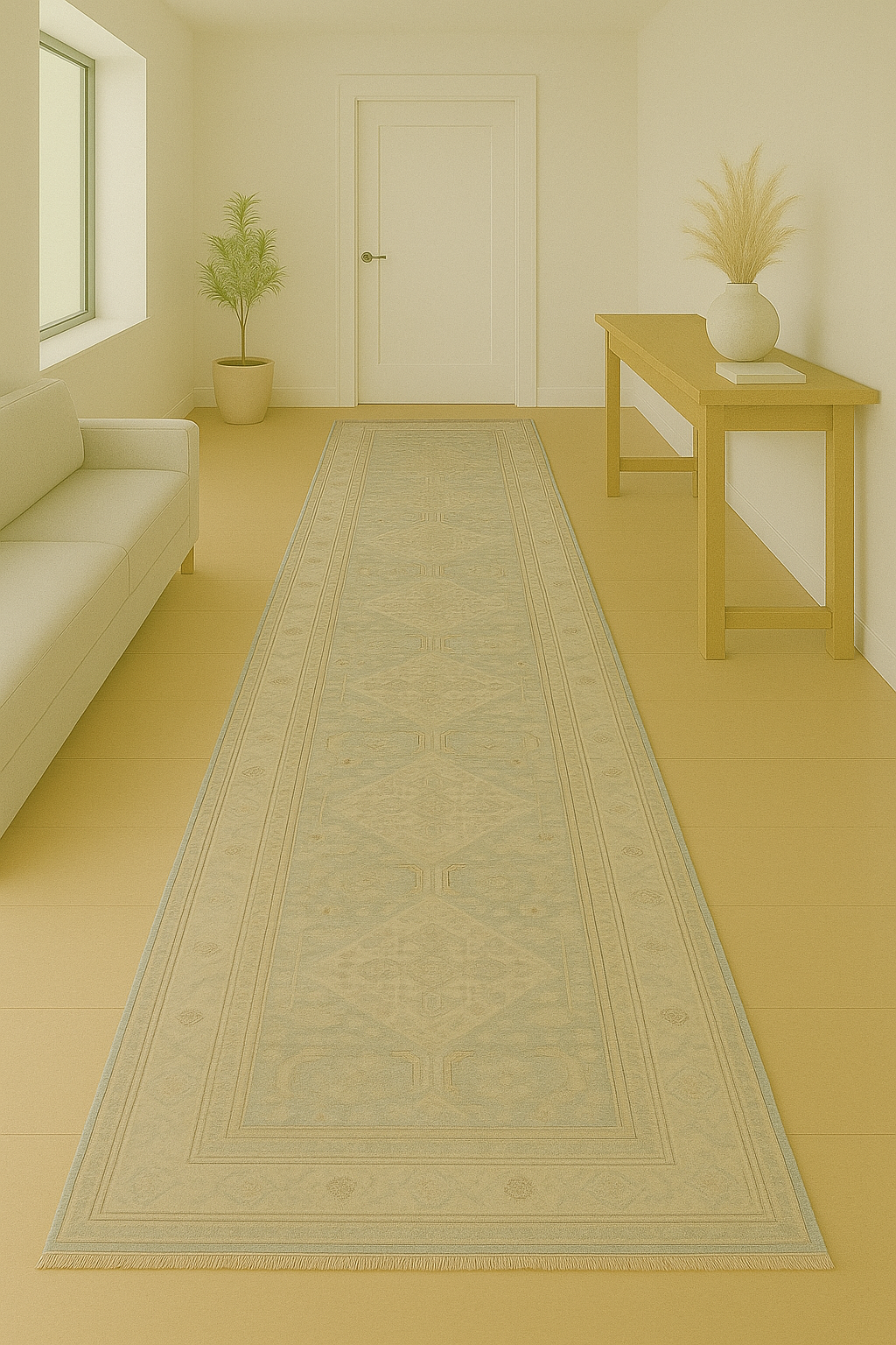 Its finely woven border—featuring rosettes and subtle zigzag vines—frames the design with quiet elegance. With its unusually wide width for a runner and gentle tonality, this piece is perfectly suited to breezy, sunlit interiors that favor soft contrasts and understated refinement.