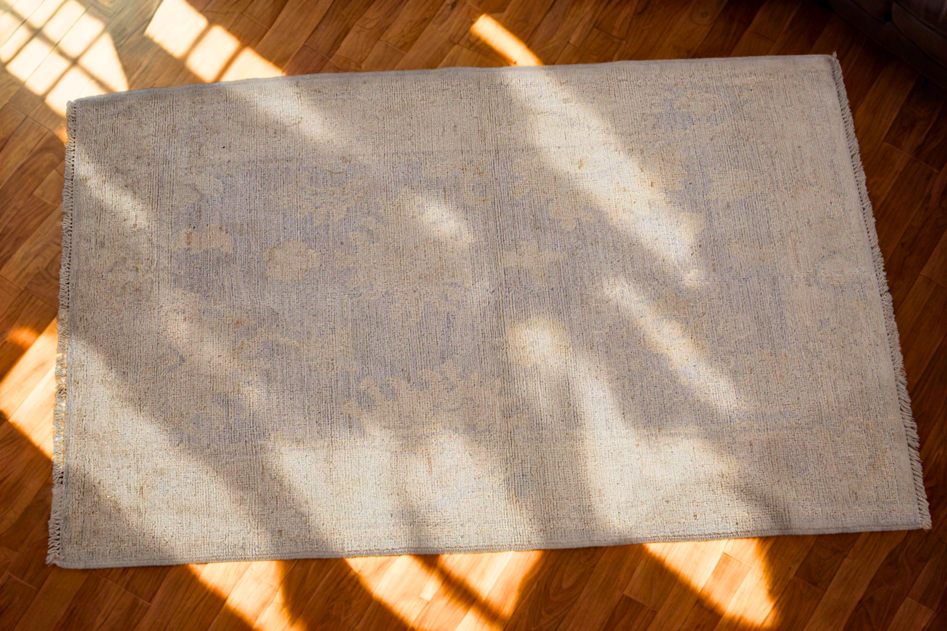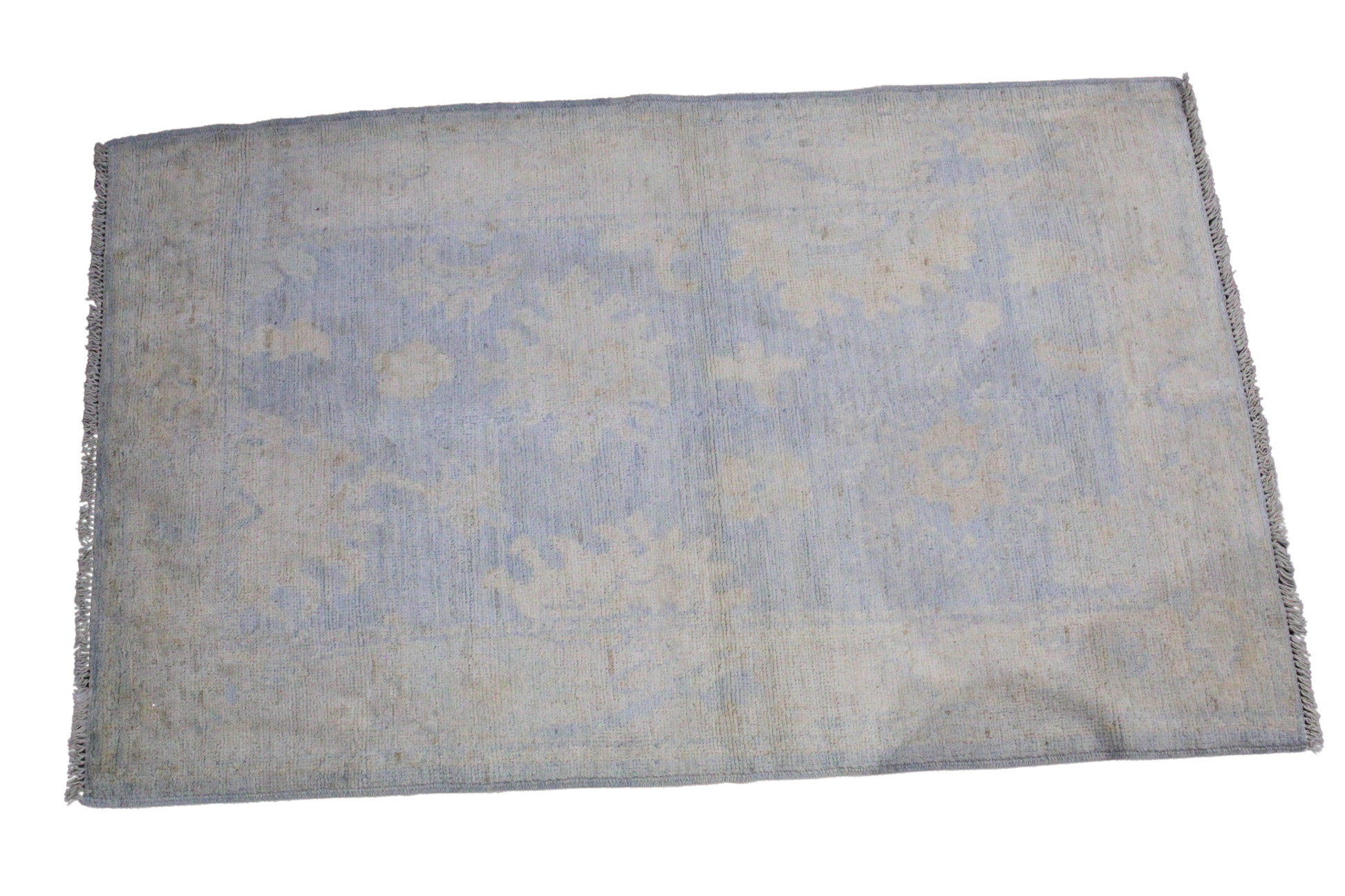 Woven by hand in Afghanistan, this 3'1" x 5'1" Oushak-style rug features a faded sky-blue field washed with pale ivory floral motifs that almost dissolve into the background, giving it a quiet, ethereal presence. The tone-on-tone palette creates a soft, transitional look that blends beautifully with both traditional and modern interiors.