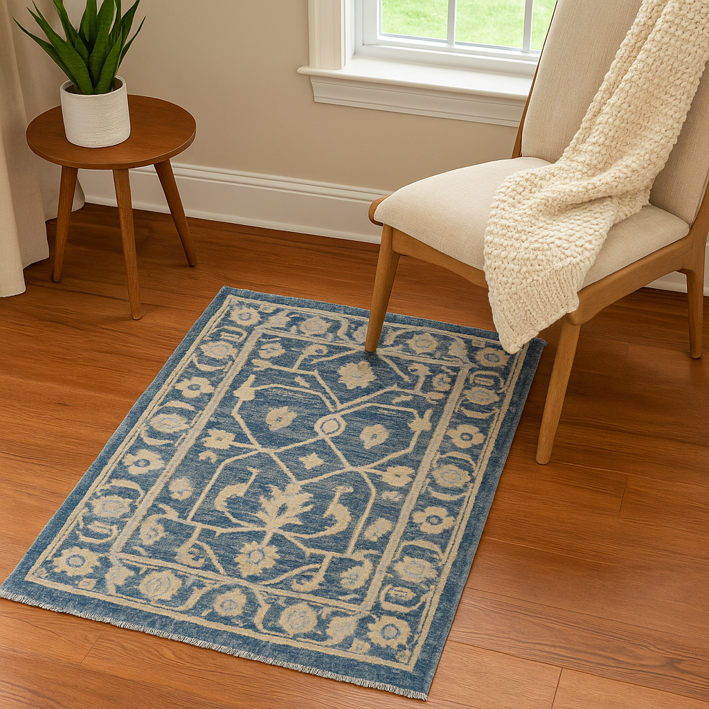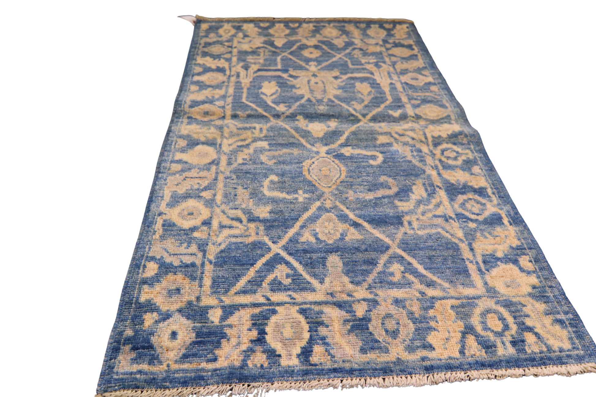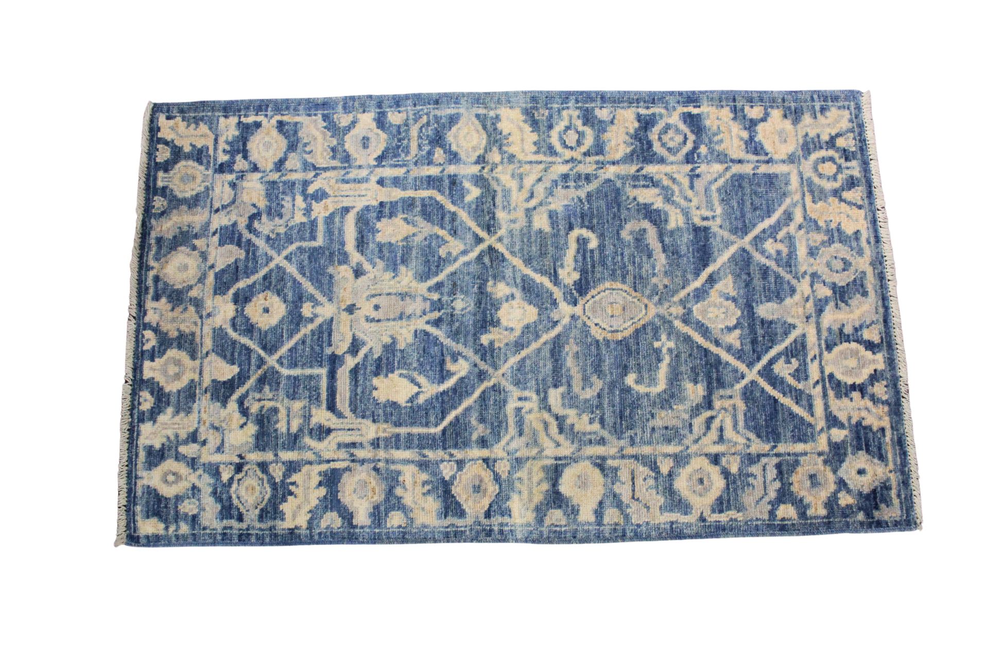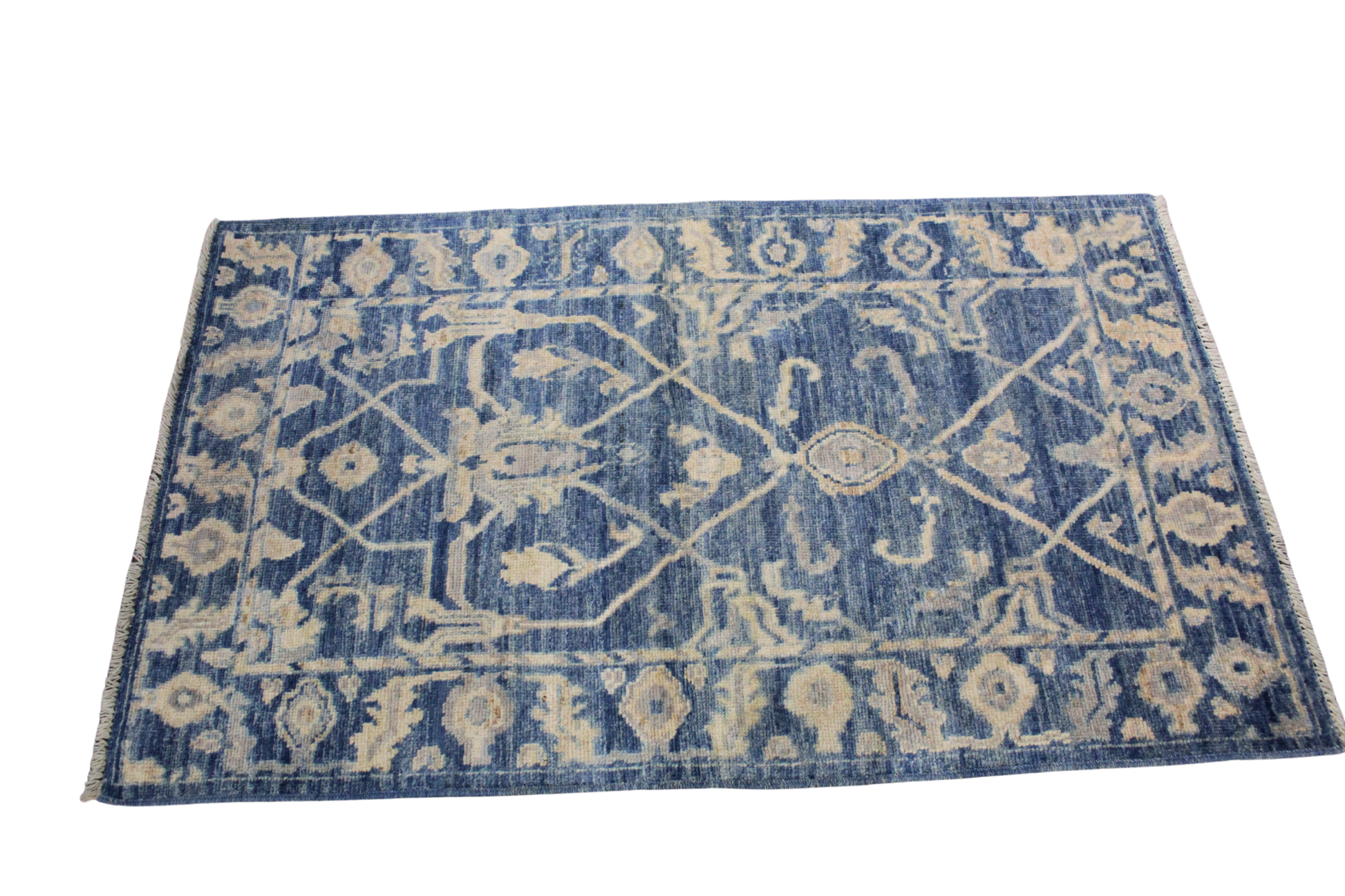 Measuring 3 x 5 feet, the rug features an intricate allover design woven in cool denim blue and soft ivory tones. The medallion and latticework pattern nod to traditional Anatolian motifs, while the gentle fading and soft wool pile add a sense of warmth and refinement. It’s the perfect accent for a cozy reading nook, guest room, or light-filled hallway.