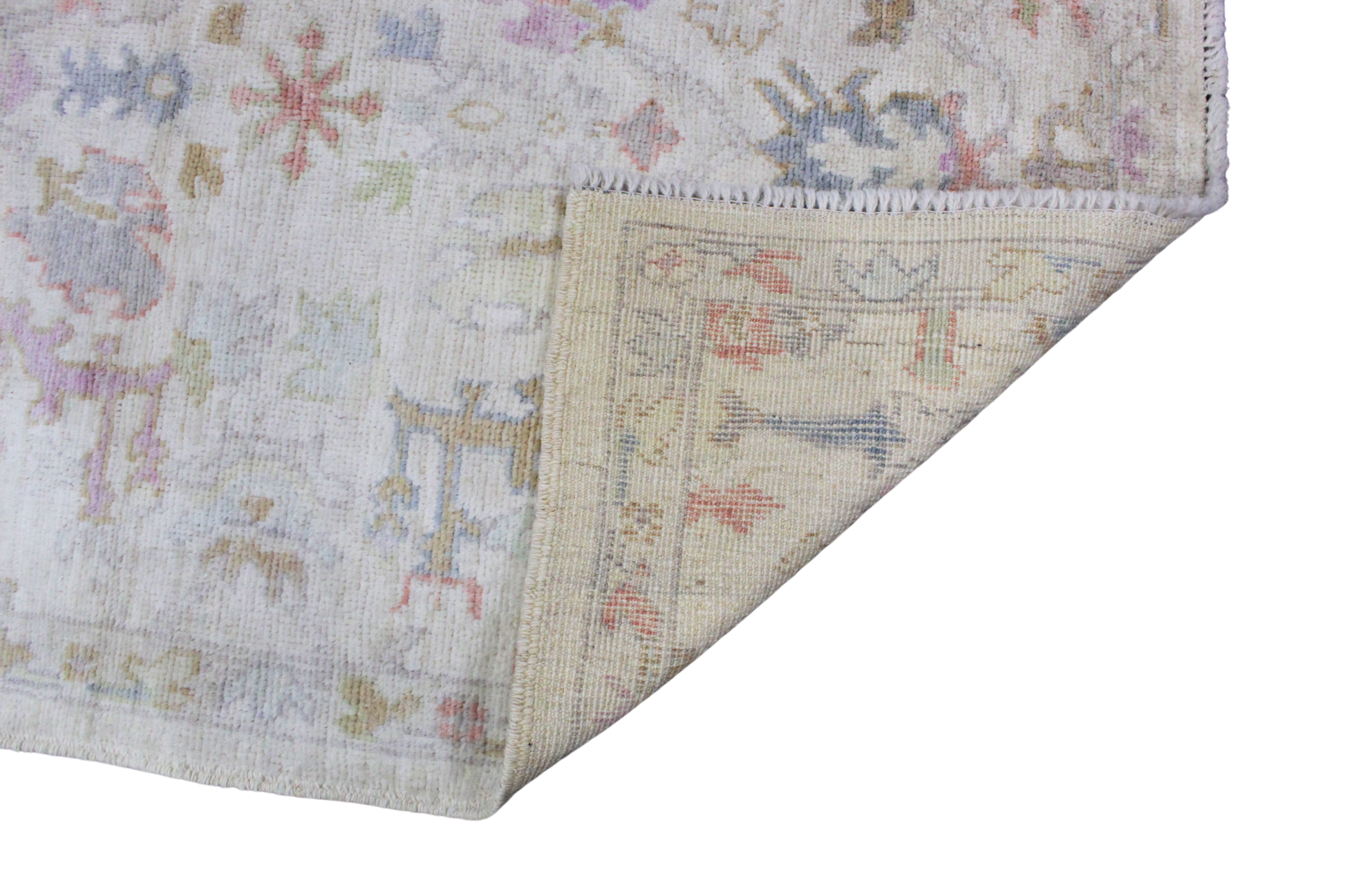 Soft, romantic, and understated — this 3 x 4.5 ft Afghan Oushak rug is a delicate masterpiece of subtle charm. Hand-knotted in fine wool, it features an allover pattern of whimsical florals and tribal motifs, all rendered in a graceful wash of faded pastels: rose, lavender, misty blue, soft gold, and pale green. The ivory background allows the gentle hues to breathe, creating a light and breezy presence.