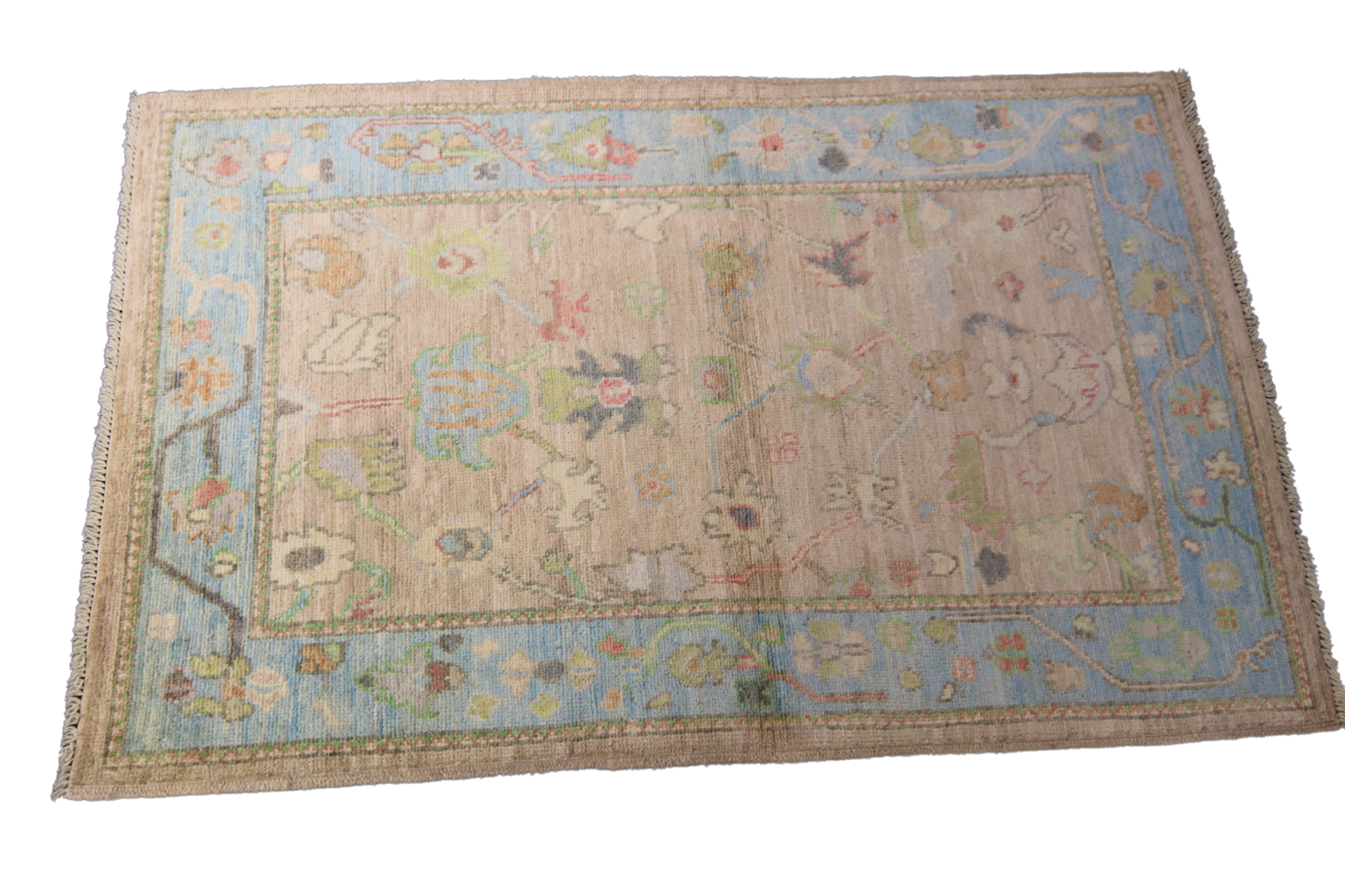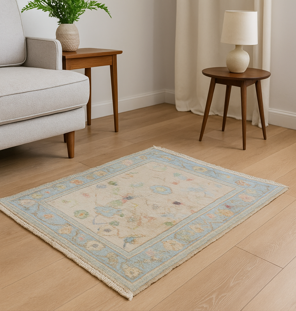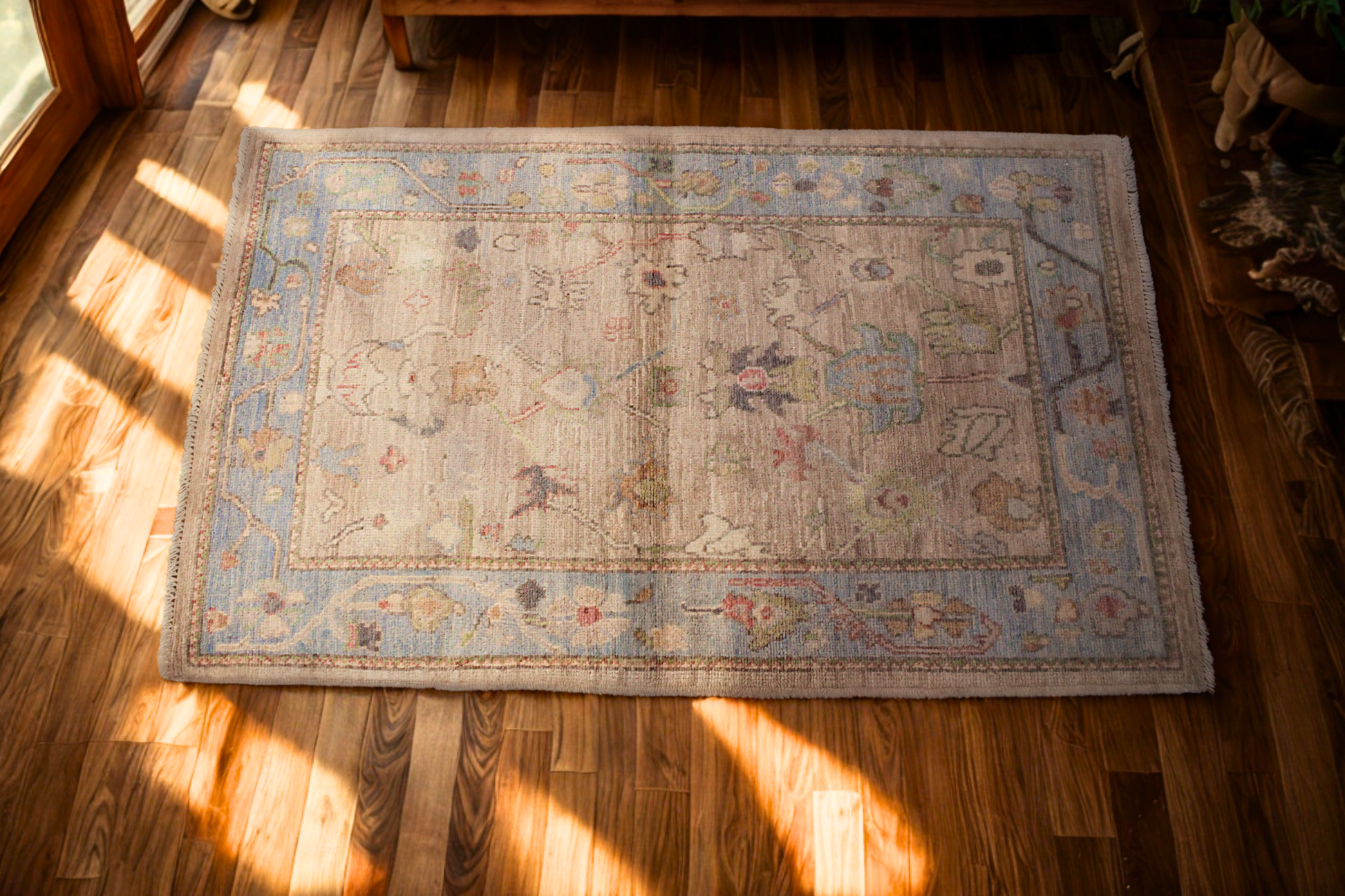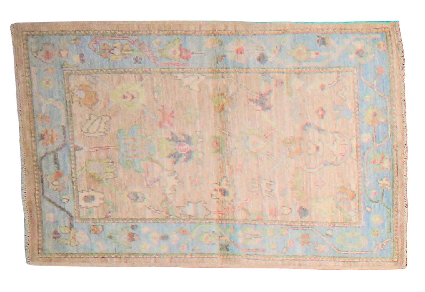 Measuring 3.1 x 4.11 feet, this hand-knotted piece features a soft pastel palette of sky blue, pale taupe, and hints of coral and green. The design blends delicate floral motifs and classic Oushak geometry within a wide, decorative border. The rug’s gently worn patina lends it a subtle vintage charm—perfect for creating a calming atmosphere.