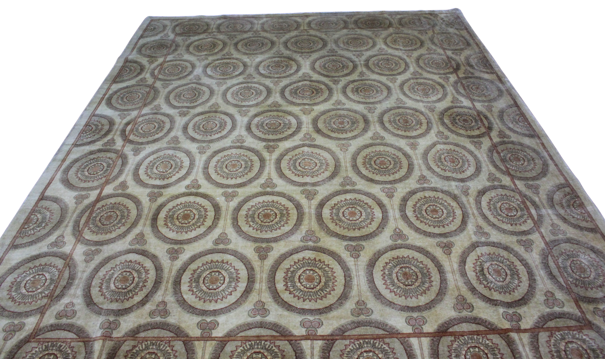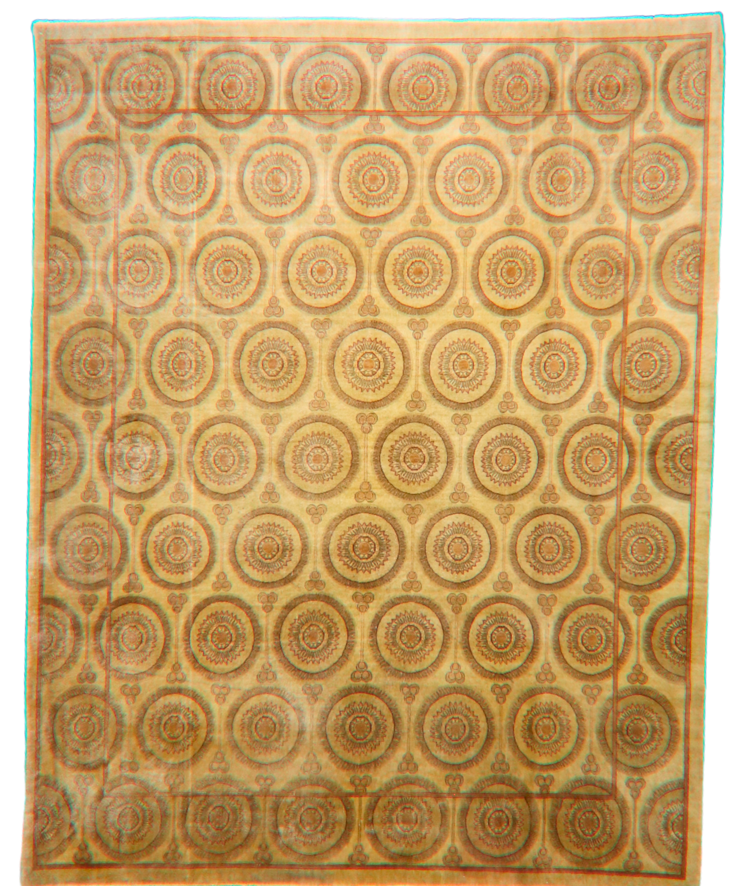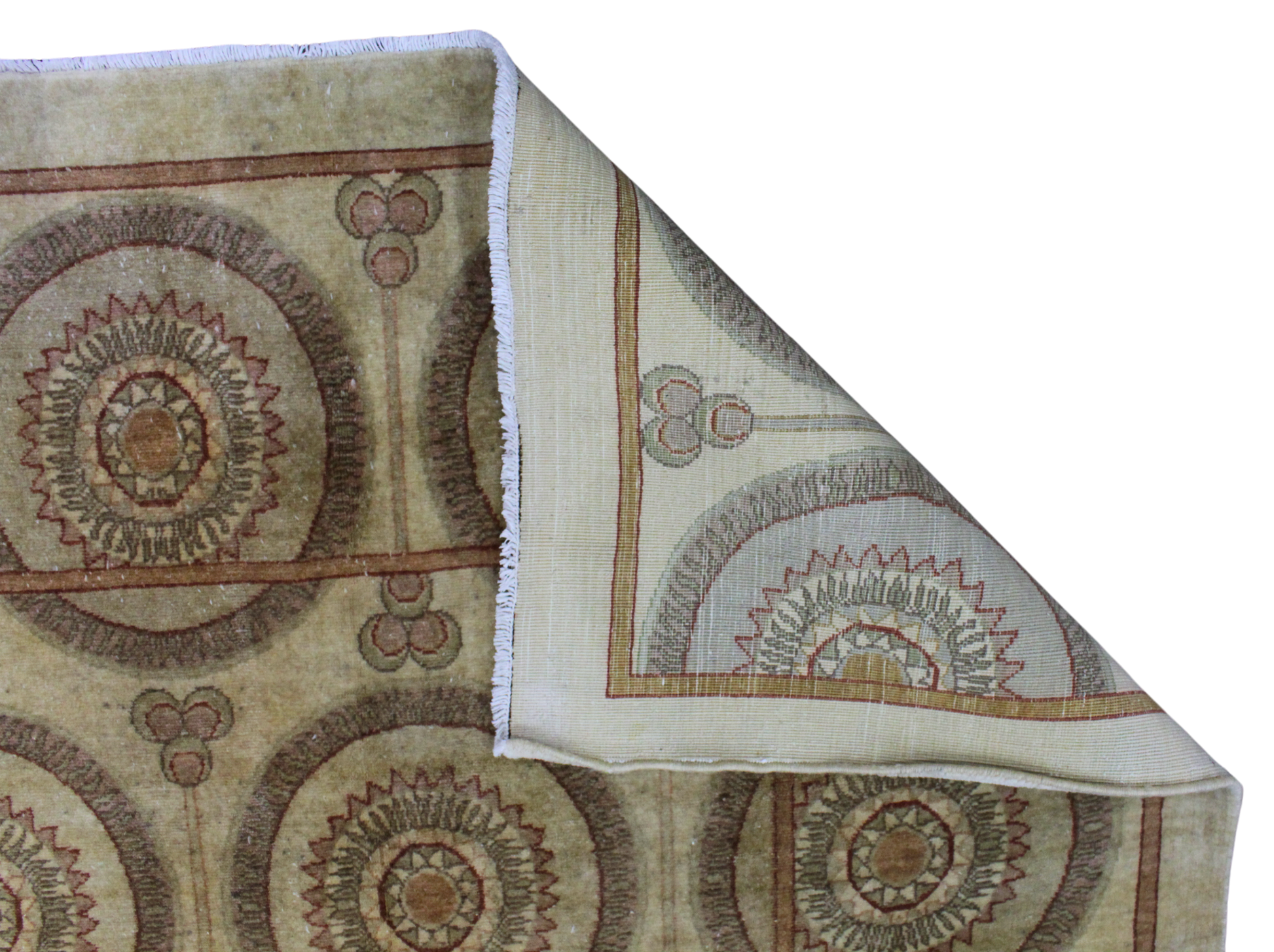 A true celebration of symmetry and craftsmanship, this Bamyan Afghan rug (8.2 × 10.3 ft) exudes energy through its hypnotic medallion repeat. Each circular motif is meticulously detailed, arranged in a precise grid across a golden sand field, giving the piece a sculptural, almost architectural presence.