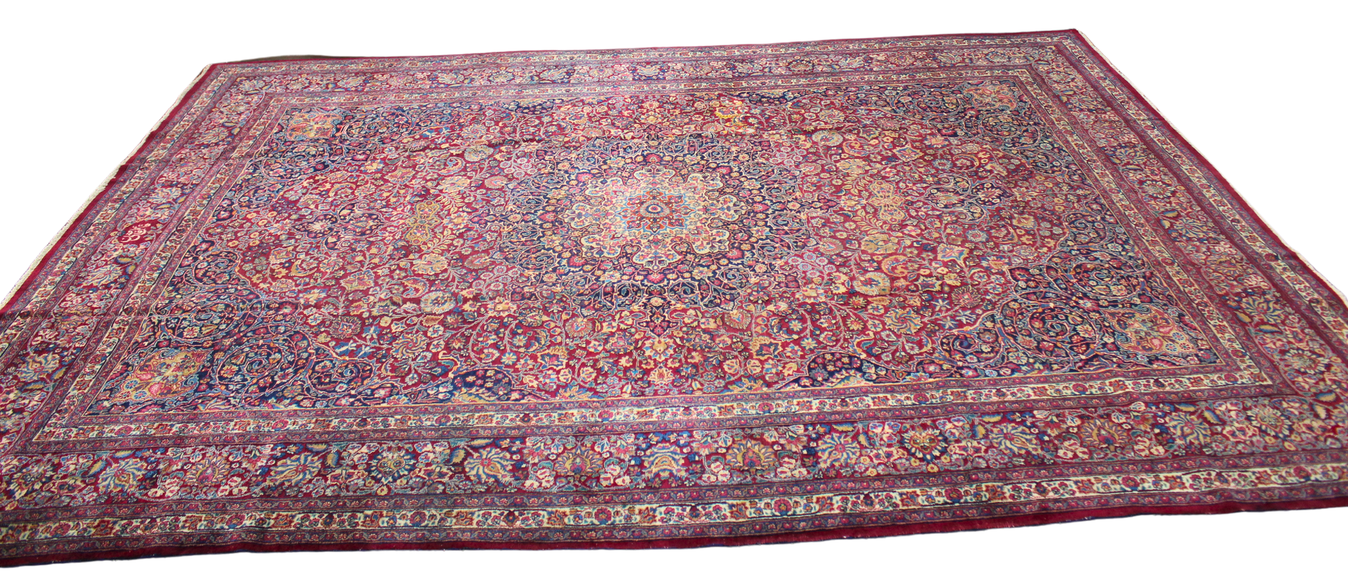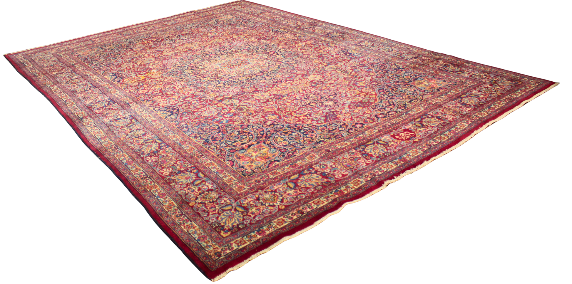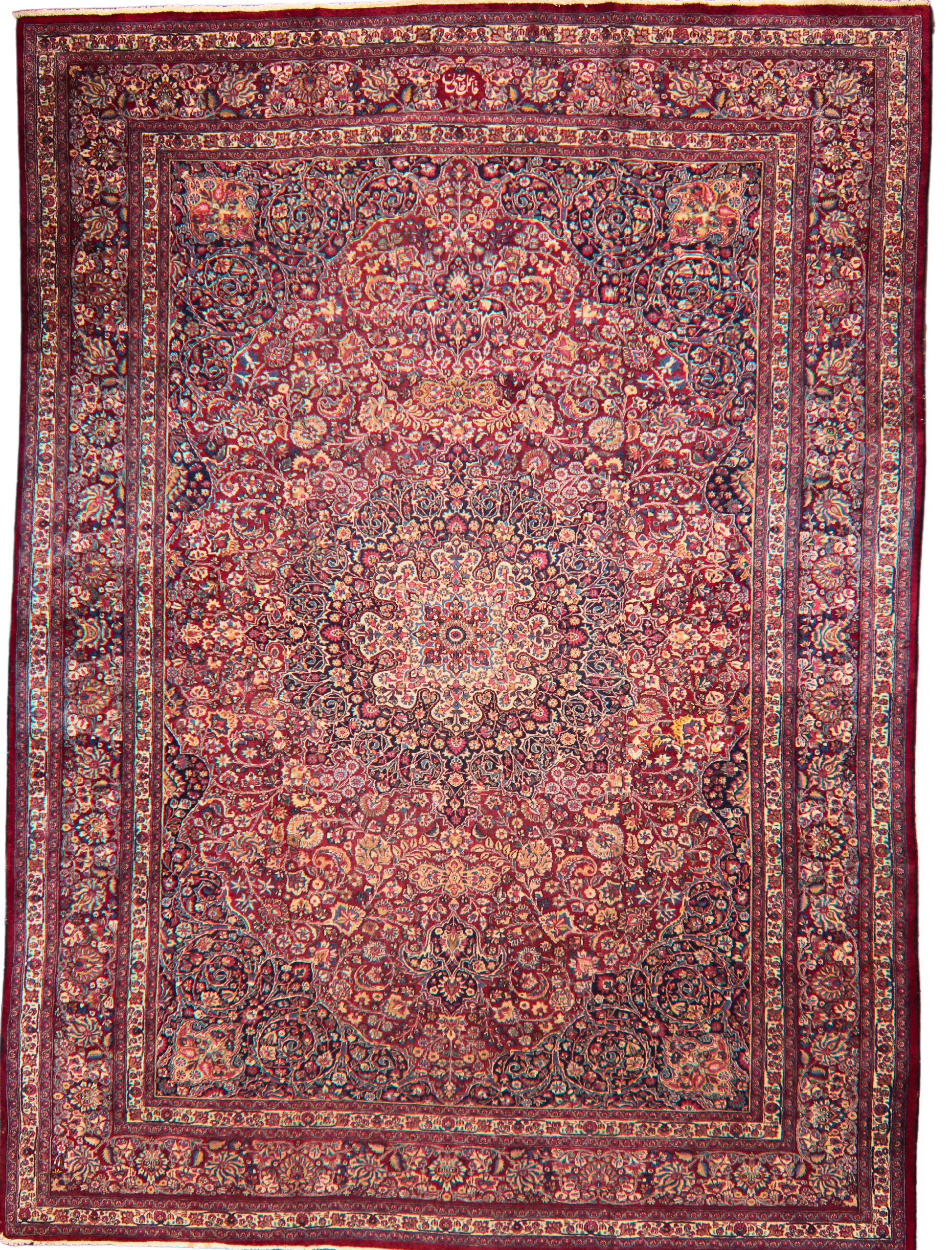 This magnificent Mashad rug (11.9 × 16.2 ft) commands attention with its opulent scale and intricate floral elegance. A finely rendered medallion anchors the design at center, radiating outward through a symphony of swirling vines, blossoms, and palmettes. Set against a richly saturated crimson field, the design balances fluid motion with classical symmetry hallmarks of high-grade Mashad weaving.