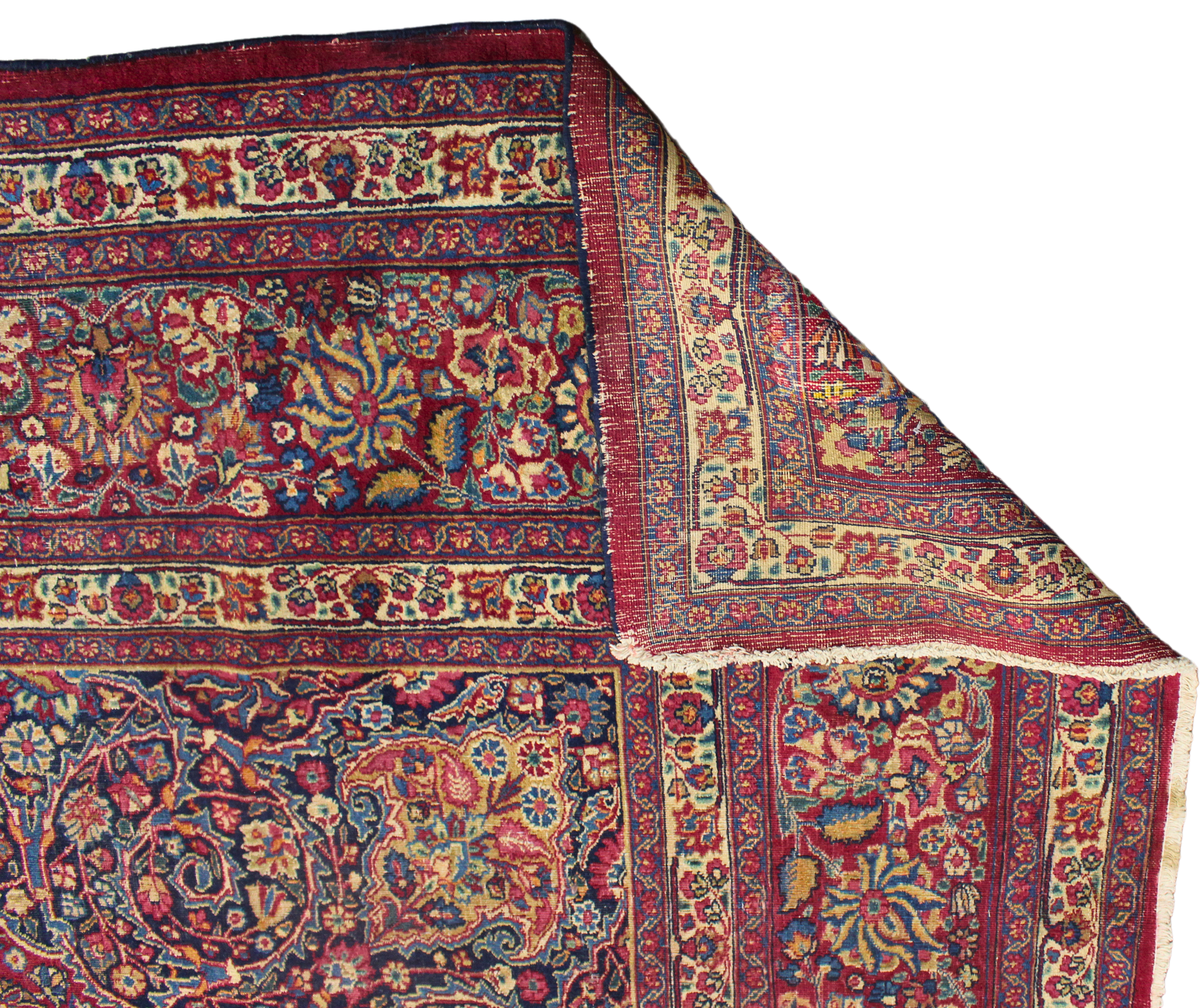 The borders echo the lush floral rhythm, framed in multiple guard bands in deep navy and brick red, adding refinement and structure. Subtle abrash, especially in the field, lends warmth and character, while the tight knotting and dense wool pile reflect quality and endurance. Ideal for large formal spaces or interiors that crave a dramatic, yet refined, focal point.