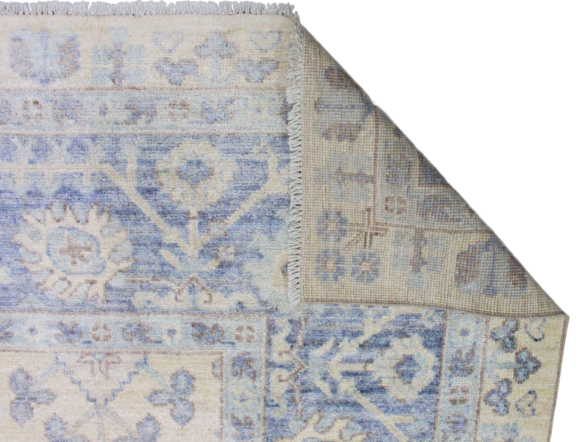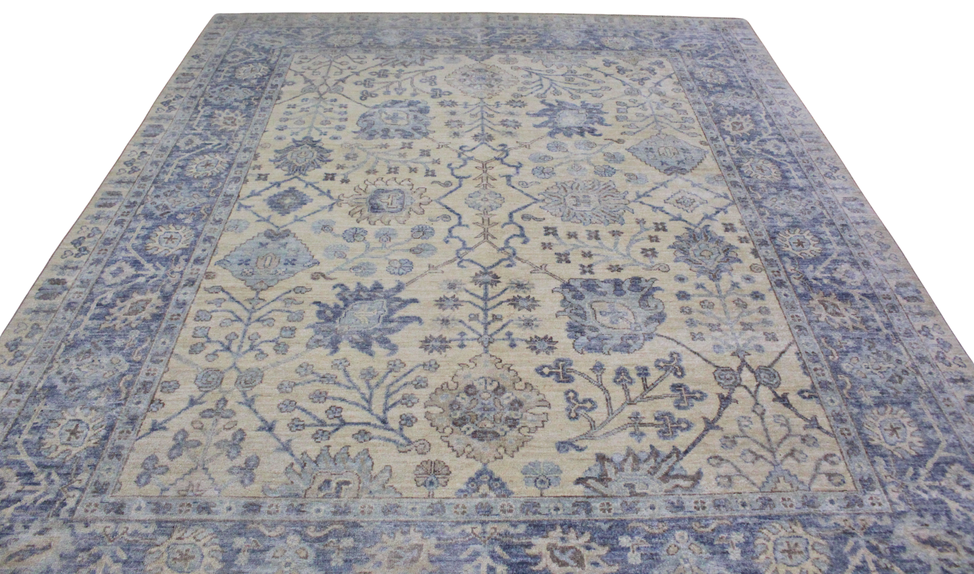 Evoking a tranquil garden at dawn, this hand-knotted Afghan Oushak rug (8.2 × 9.9 ft) brings grace and calm to any setting. A luminous ivory field is delicately embroidered with soft blue floral motifs and vine-like tracery. The intricate border, featuring stylized botanical elements, frames the composition with balance and elegance.