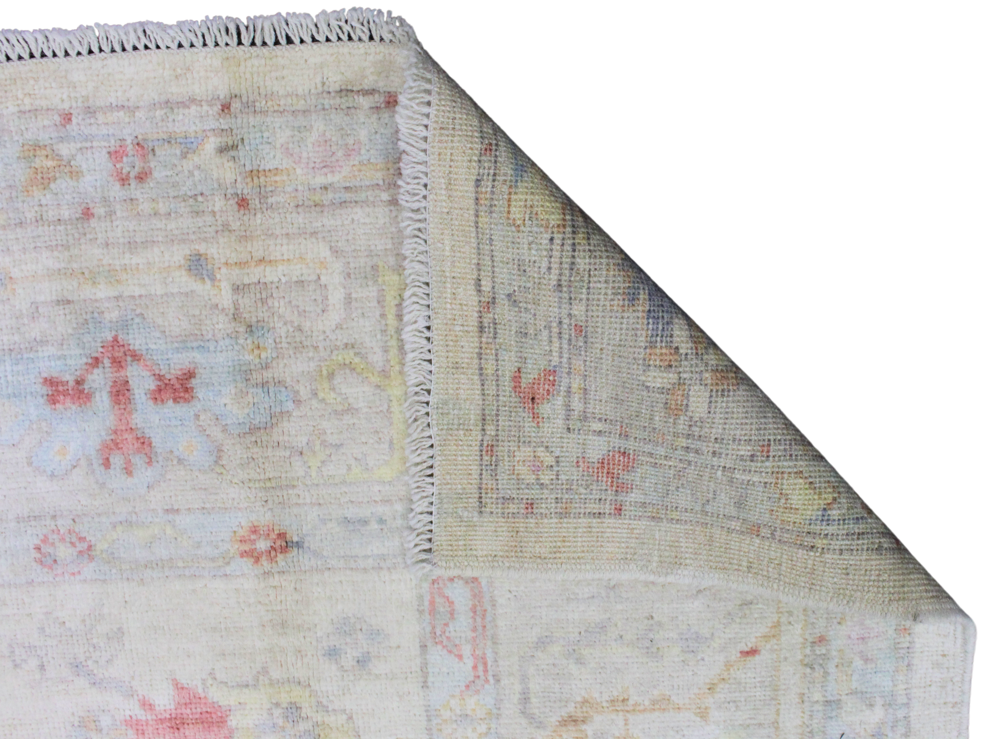 Effortlessly elegant and quietly refined, this Afghan Oushak rug (8 × 9.8 ft) offers a soft take on classic design. A pale ivory-cream field plays host to an array of loosely arranged floral and geometric motifs, woven in muted shades of dusty rose, faded sage, stone blue, and golden sand. The wide border, featuring similar toned-down elements, provides a balanced frame while maintaining the rug’s gentle, vintage character.