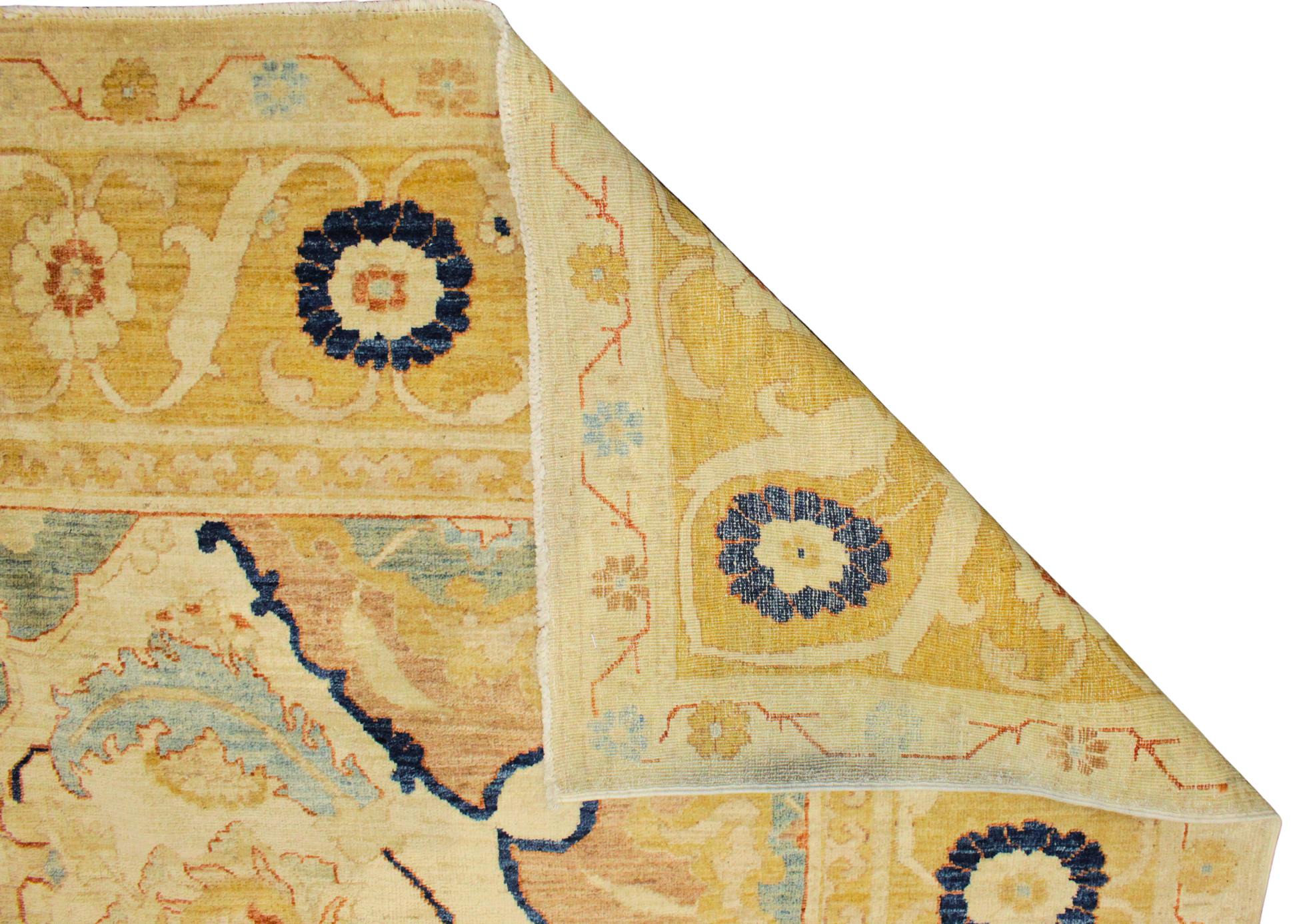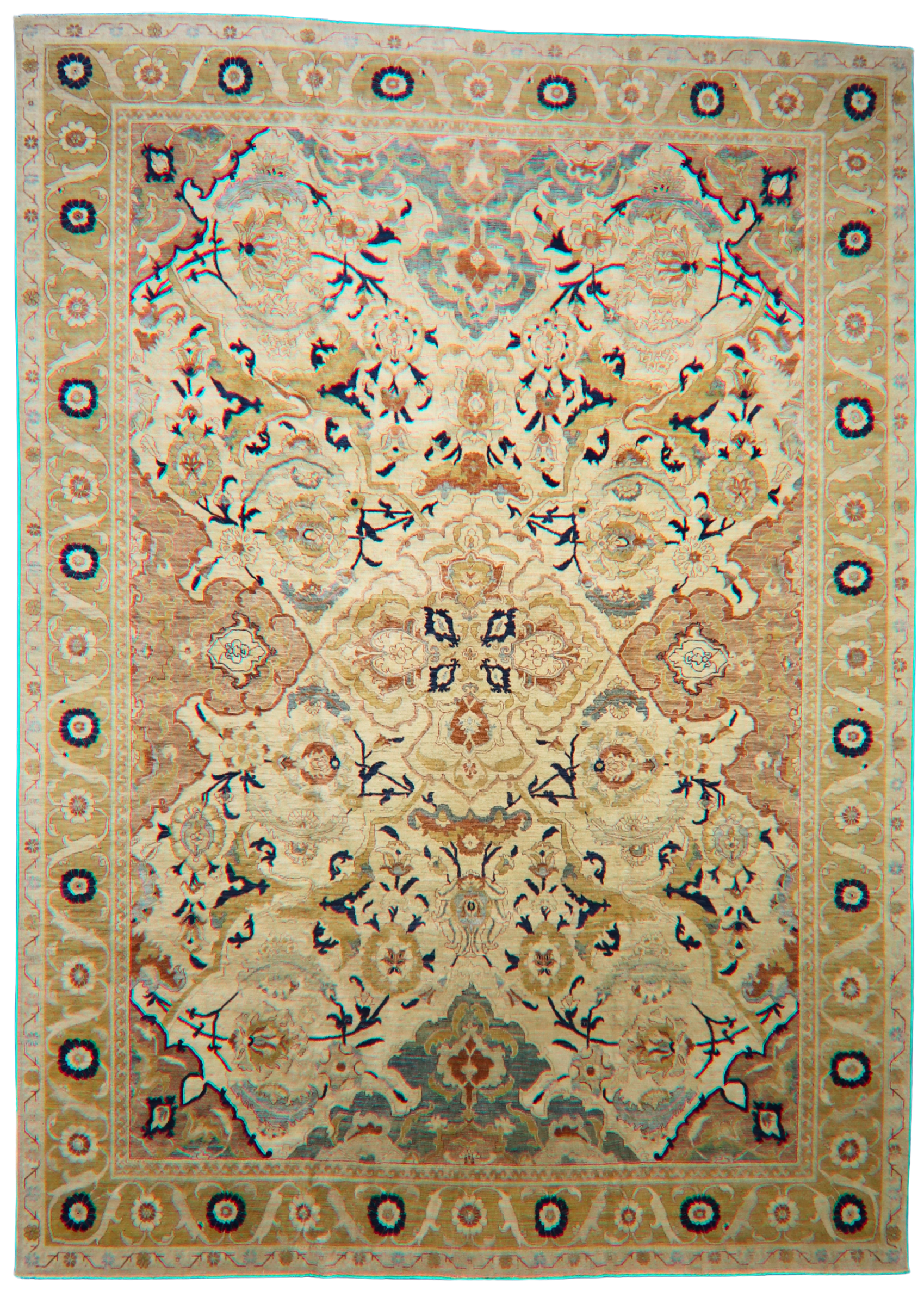 The broad golden border, punctuated with dark circular rosettes, adds a bold architectural frame that balances the delicacy of the inner design. Its symmetrical layout and subtle sheen reflect the meticulous craftsmanship of Afghan artisans trained in Persian traditions. A statement piece ideal for formal living rooms, offices, or elegant dining spaces.