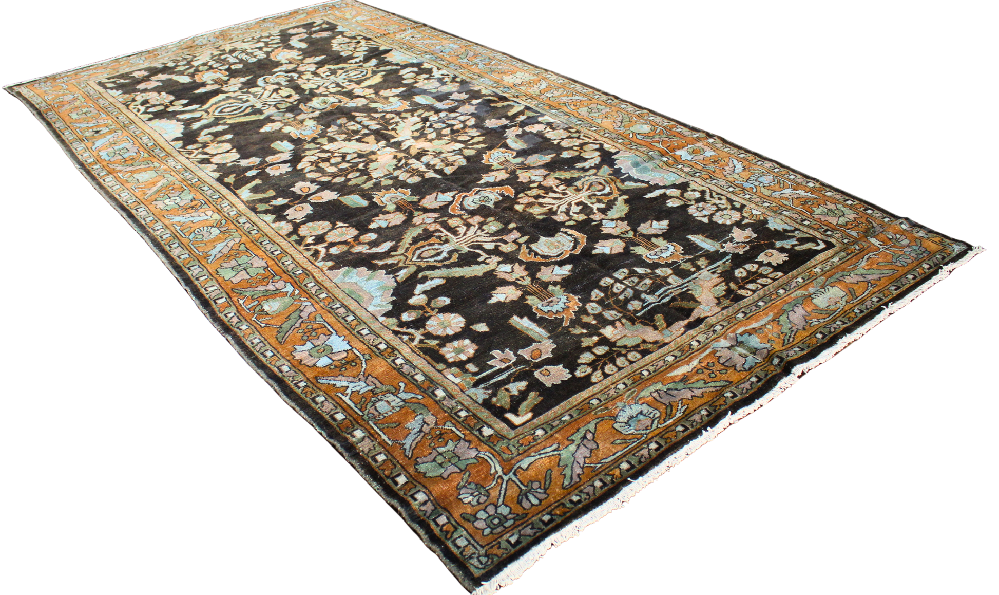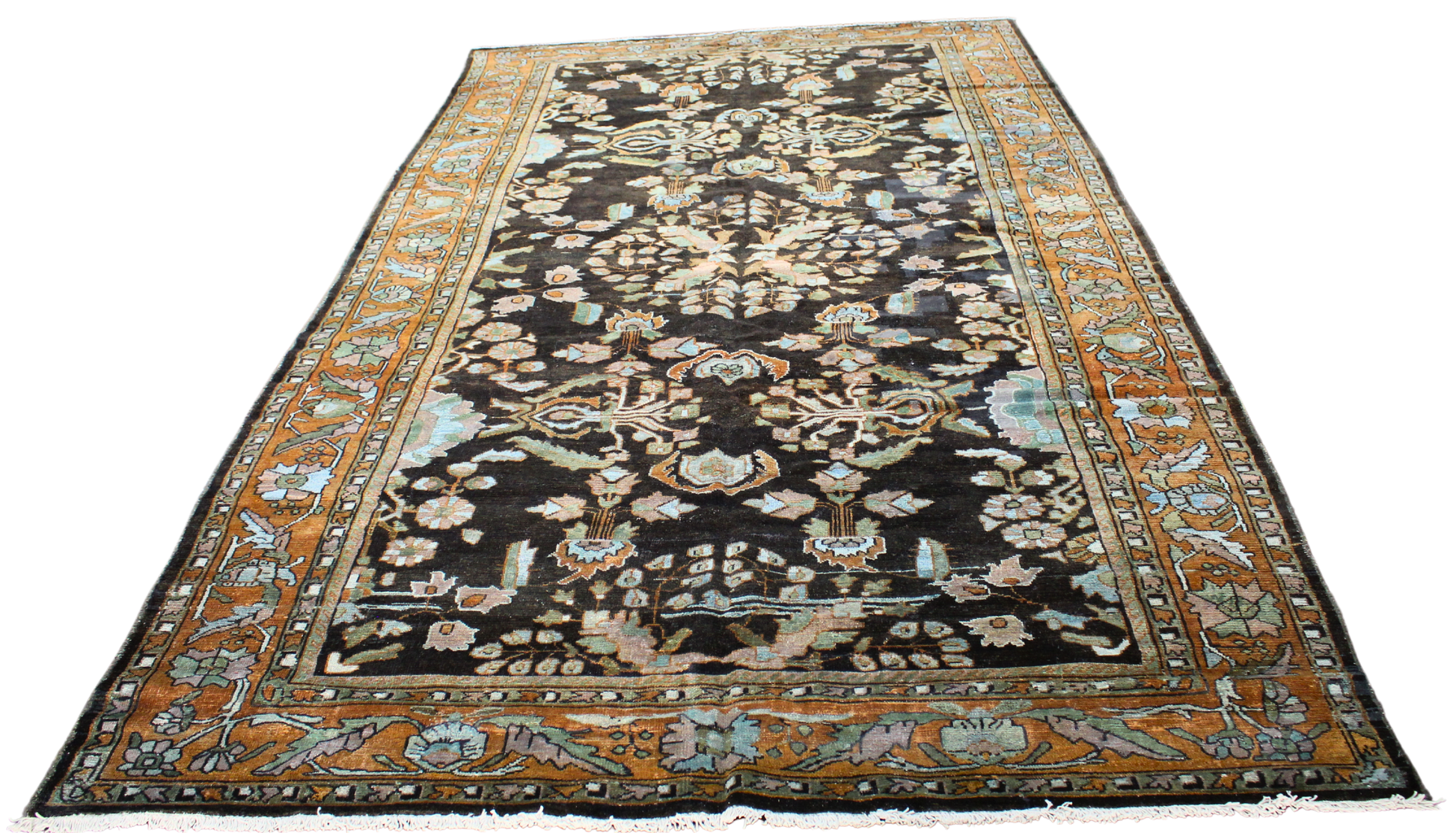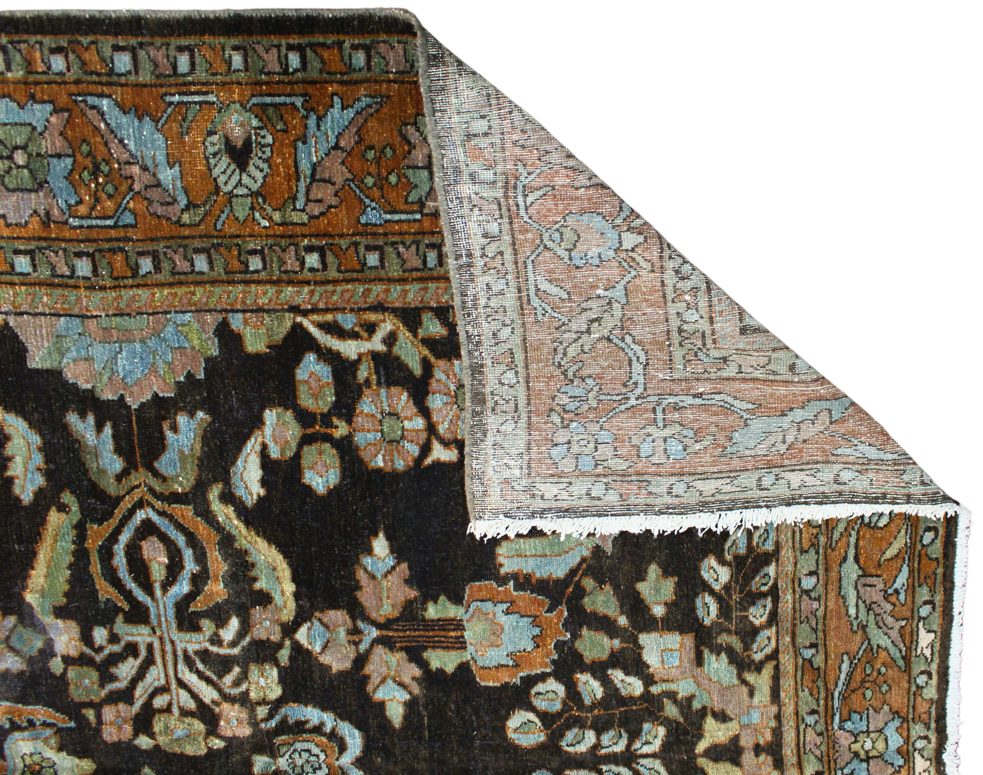 This antique Lilihan rug (7.3 × 13.1 ft) delivers a moody sophistication with its inky charcoal ground and richly stylized floral motifs. Towering botehs, mirrored palmettes, and complex vinework unfold in rhythmic symmetry, highlighted by muted ochre, dusty aqua, faded rust, and salmon pink. The composition is anchored by a large central medallion formation that echoes the repeating floral sprays surrounding it.