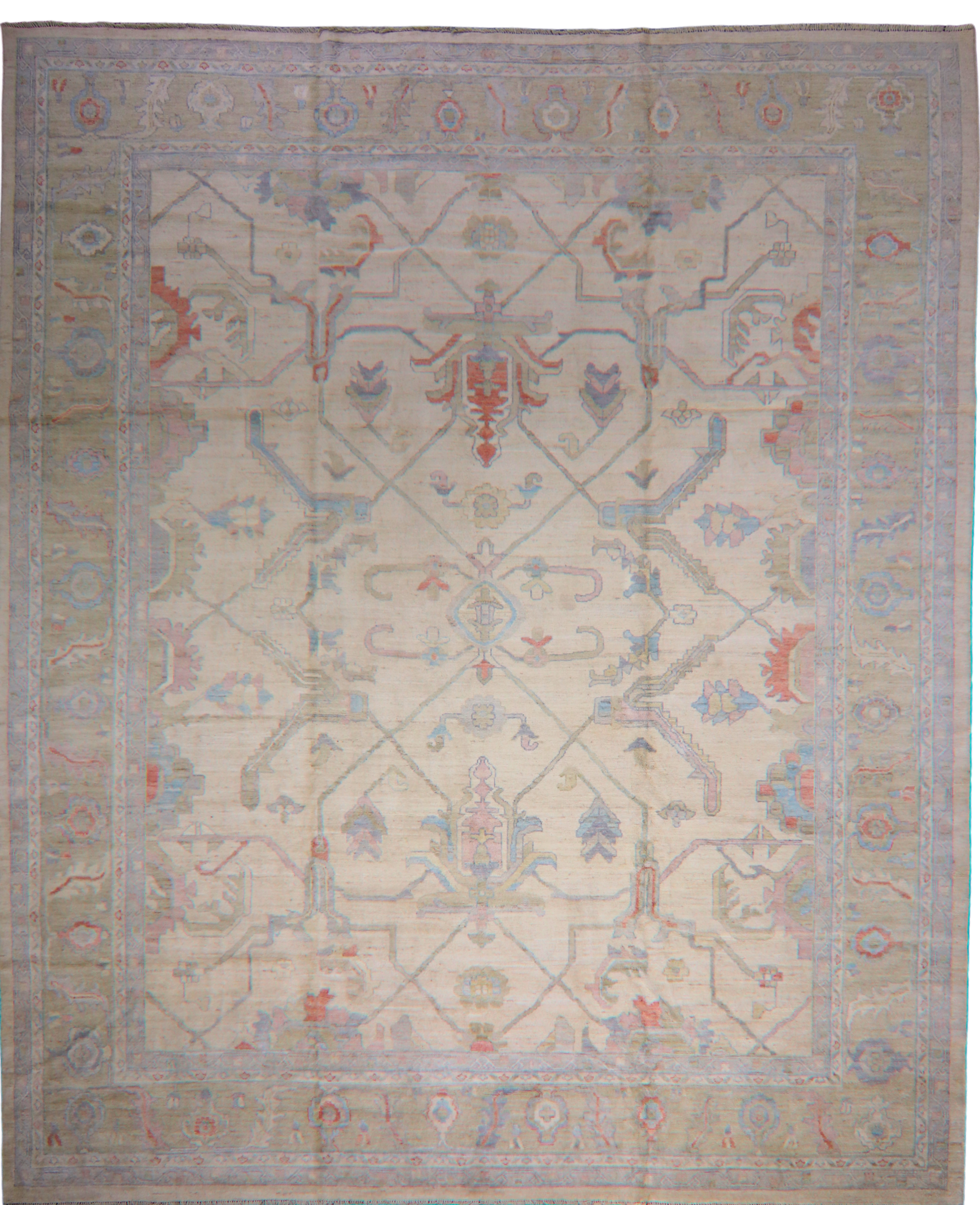 This Oushak rug from Afghanistan radiates understated grandeur through its open geometric layout and airy pastel tones. The field features a lattice of angular vines and stylized florals arranged in a symmetrical diamond pattern, anchored by gentle terracotta, pale denim, and olive accents on a creamy parchment ground.