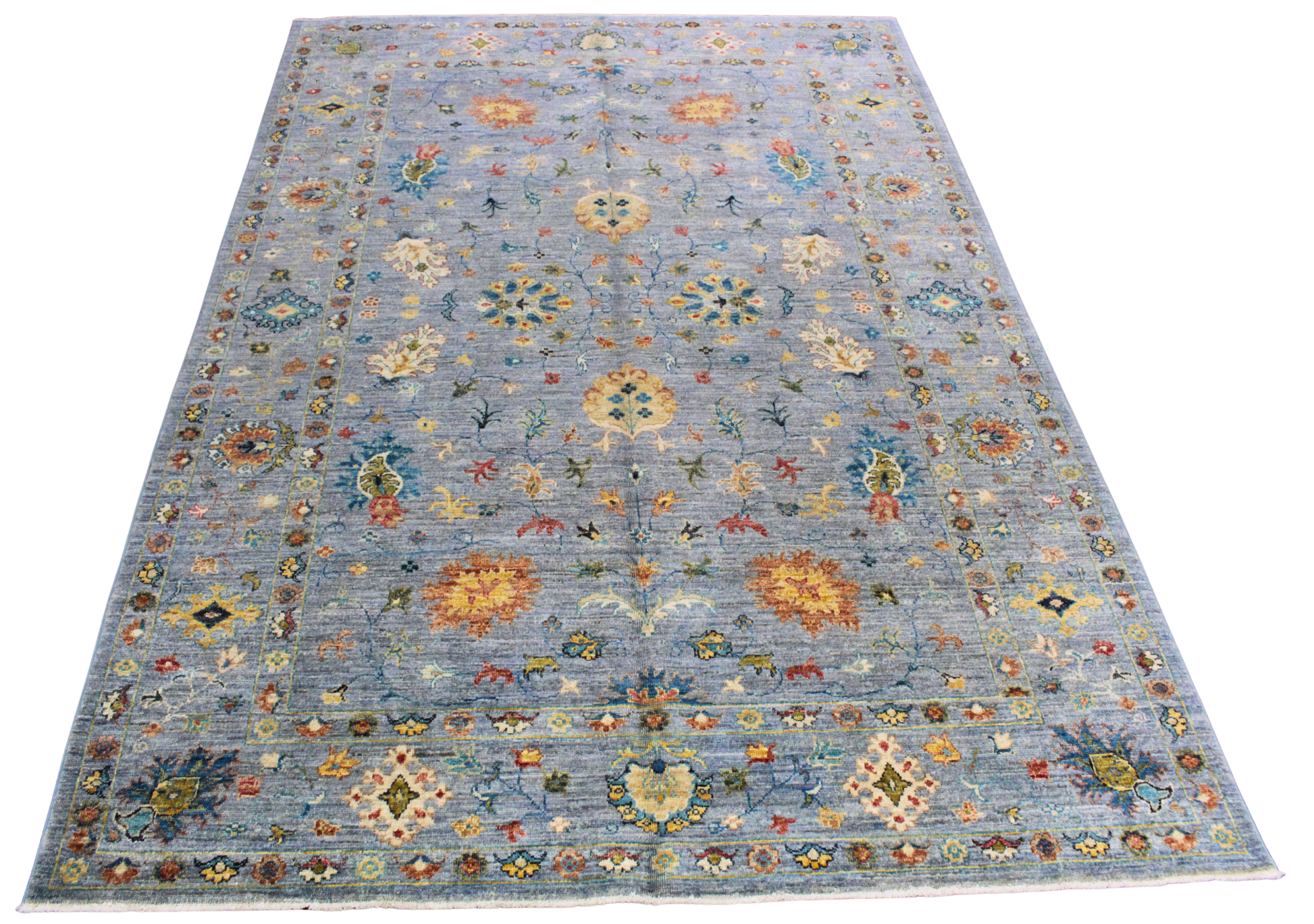 Saturated in a dusky denim blue and adorned with a lush garden of stylized florals, this 5.6 × 8 ft Fine Afghan rug brings vibrancy and balance in equal measure. Hand-knotted with care, its botanical motifs bloom in shades of saffron gold, rosewood, coral, and mint green scattered across the field like petals in motion. A detailed floral border adds structure while preserving the rug’s organic charm.