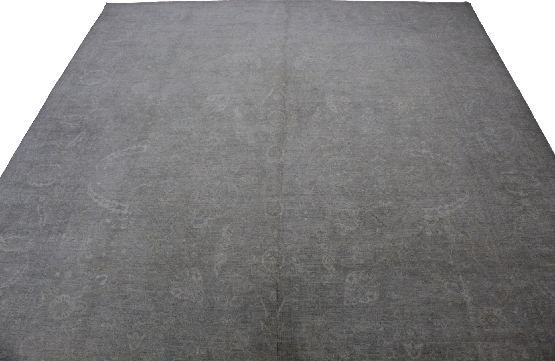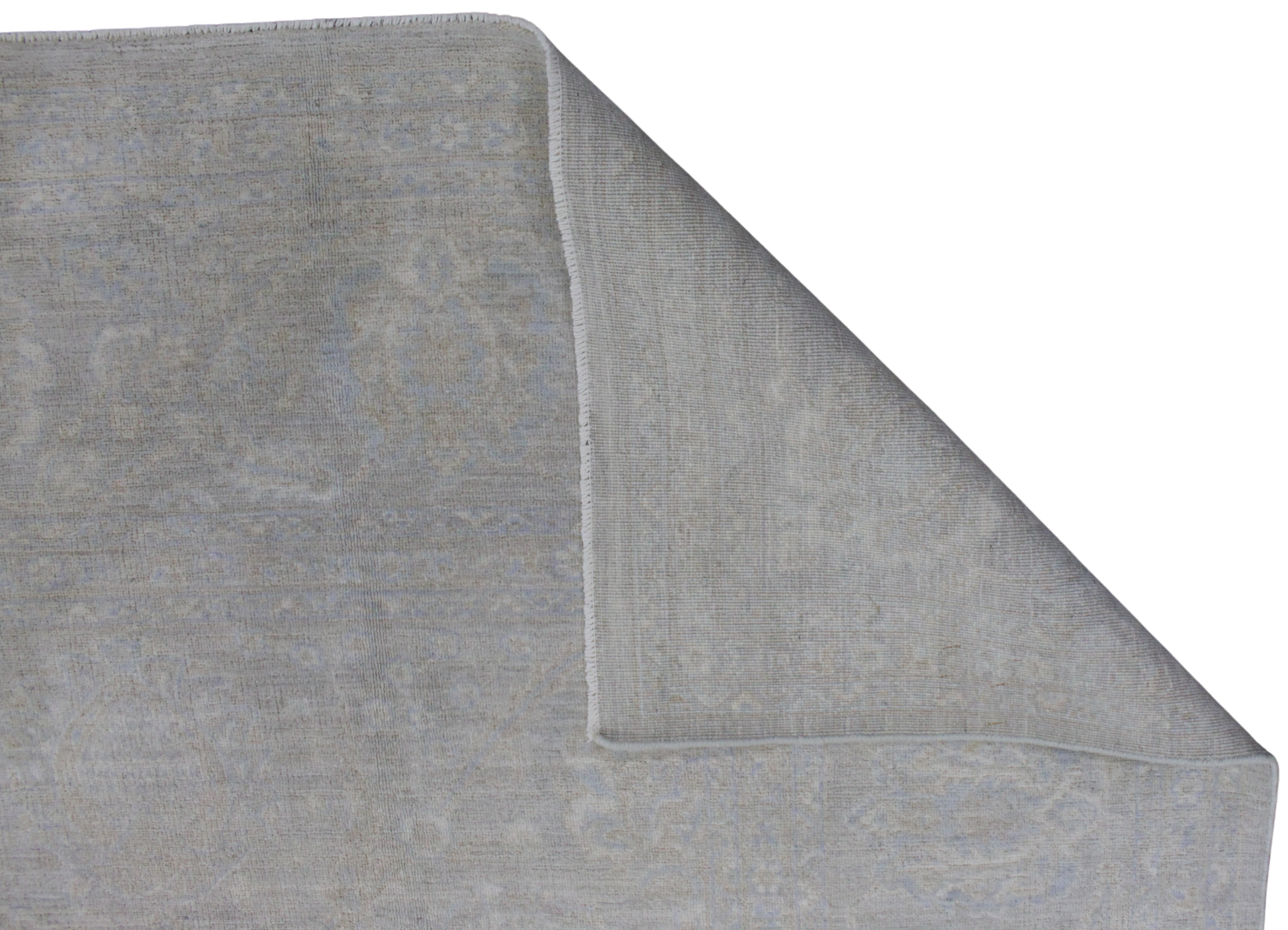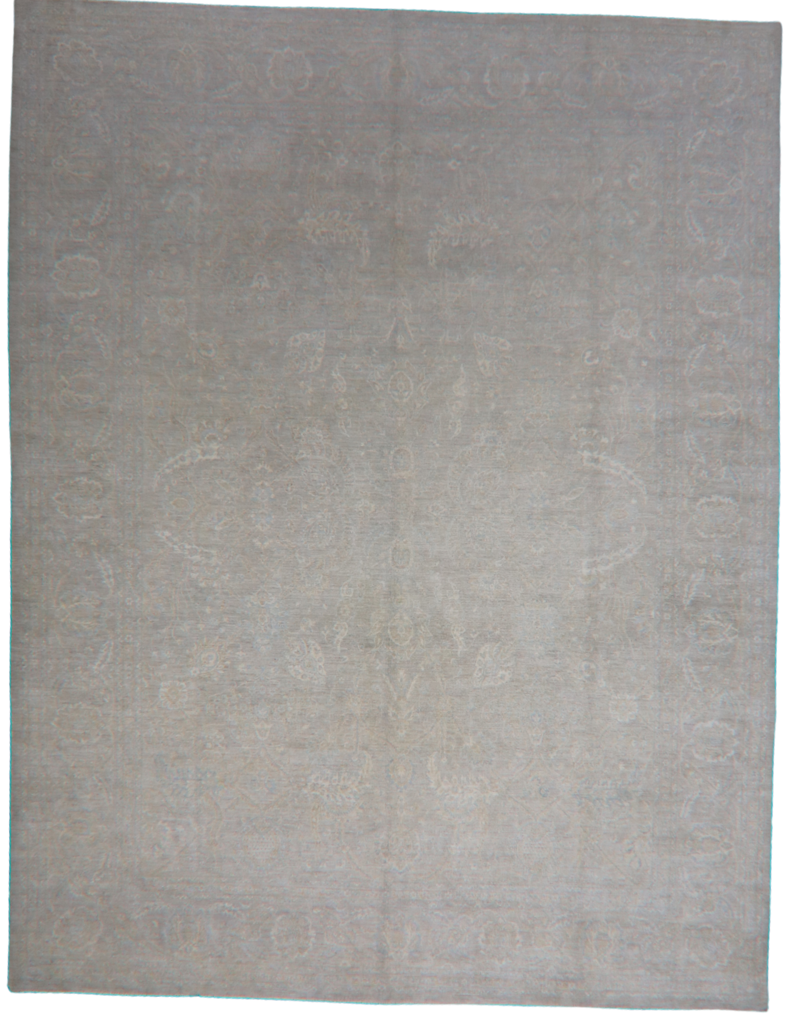 Delicate yet complex, this 8.10 × 11.5 ft Afghan Tabriz rug captures the essence of refined restraint. Its muted palette of celadon, pale smoke, and powdery taupe forms a ghostlike pattern of classical medallions and Persianate floral vines that seem to shift and shimmer in the light. The composition is rooted in traditional Tabriz aesthetics, but the faded tones bring a contemporary air of subtle luxury.