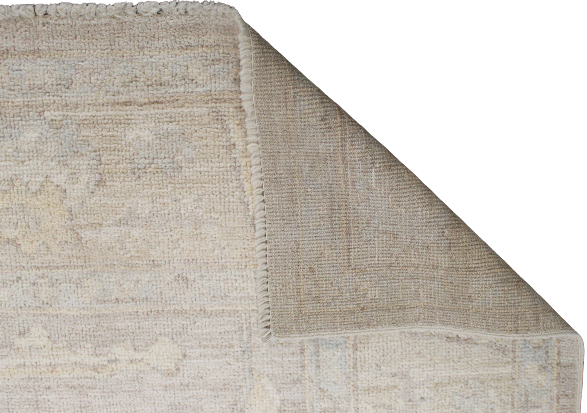 This Afghan Oushak rug exudes a serene, understated elegance with its subtle palette and soft design. The ivory field is decorated with faint floral and vine motifs, woven in muted tones of stone gray, beige, and pale cream, giving it a graceful, antique-inspired appearance. The details are intentionally softened, creating a washed, almost tonal effect that allows the rug to blend seamlessly with a wide variety of interiors.