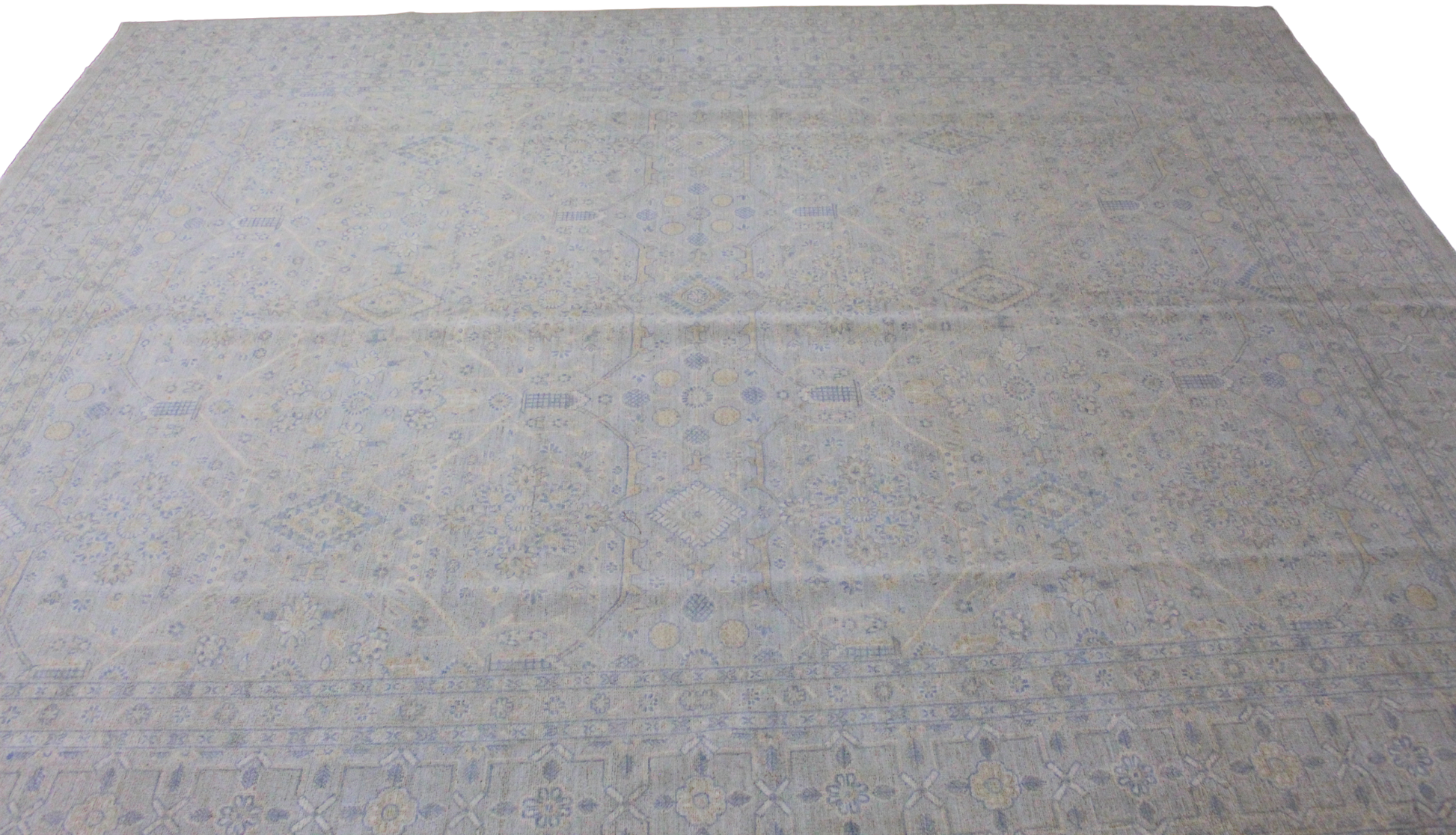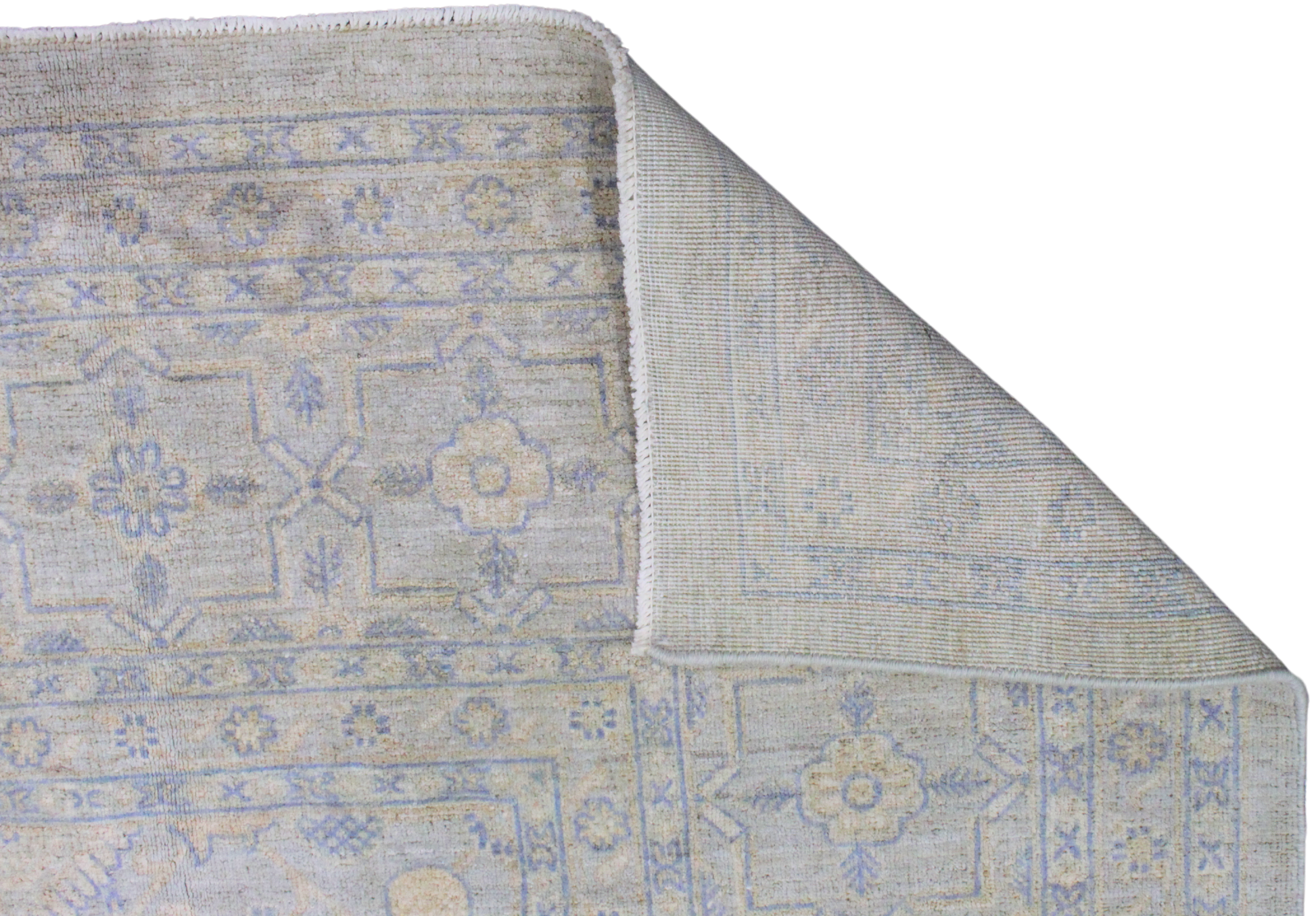 This Tabriz rug from Afghanistan (7.9 × 9.8 ft) brings a breath of calm refinement to any interior with its delicate balance of symmetry and serenity. The field is filled with a finely articulated allover lattice of medallions, geometric motifs, and floral accents—all rendered in whisper-soft tones of ivory, mist blue, and warm parchment. Its subtle patterning gently emerges as the light hits, offering depth without visual heaviness.