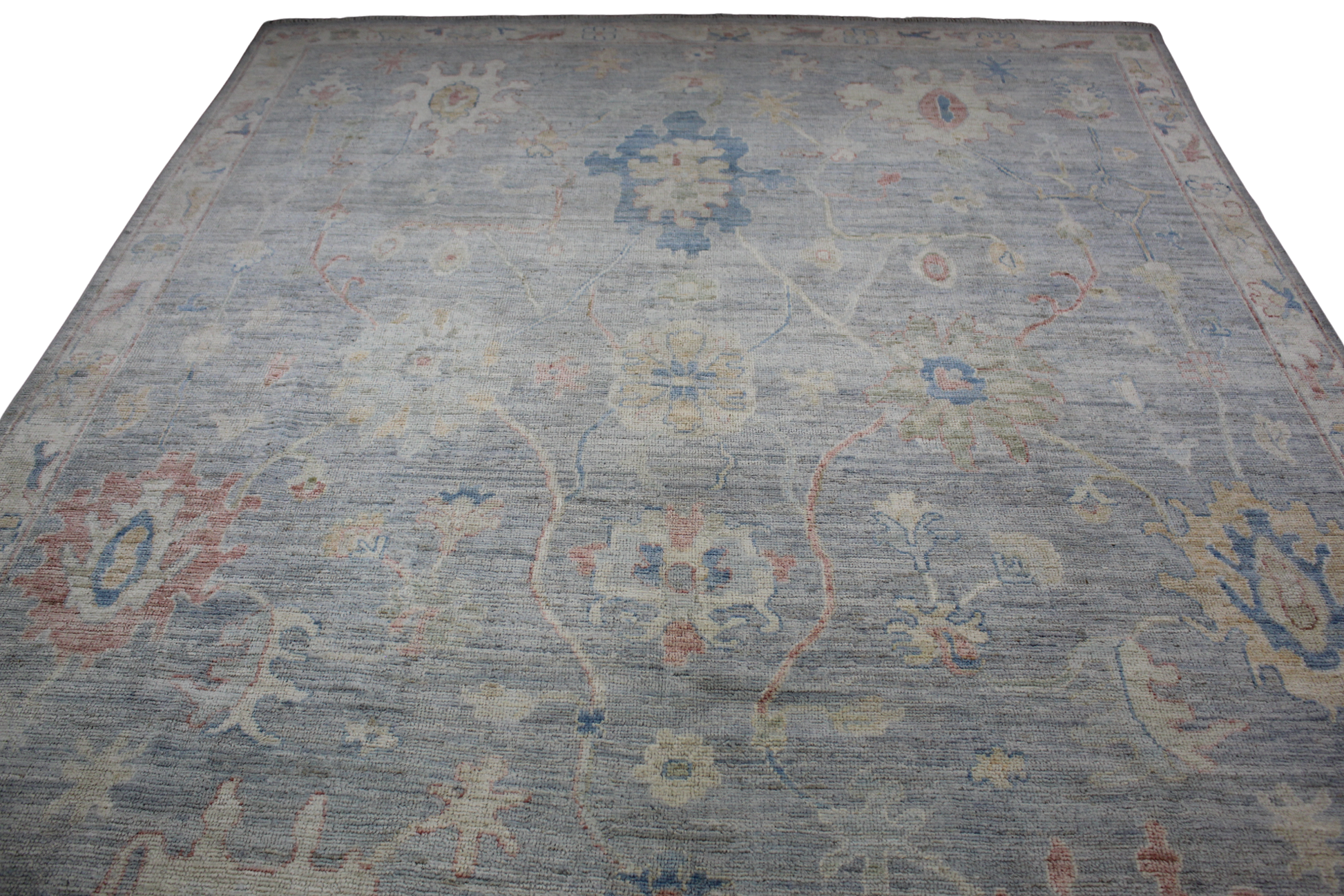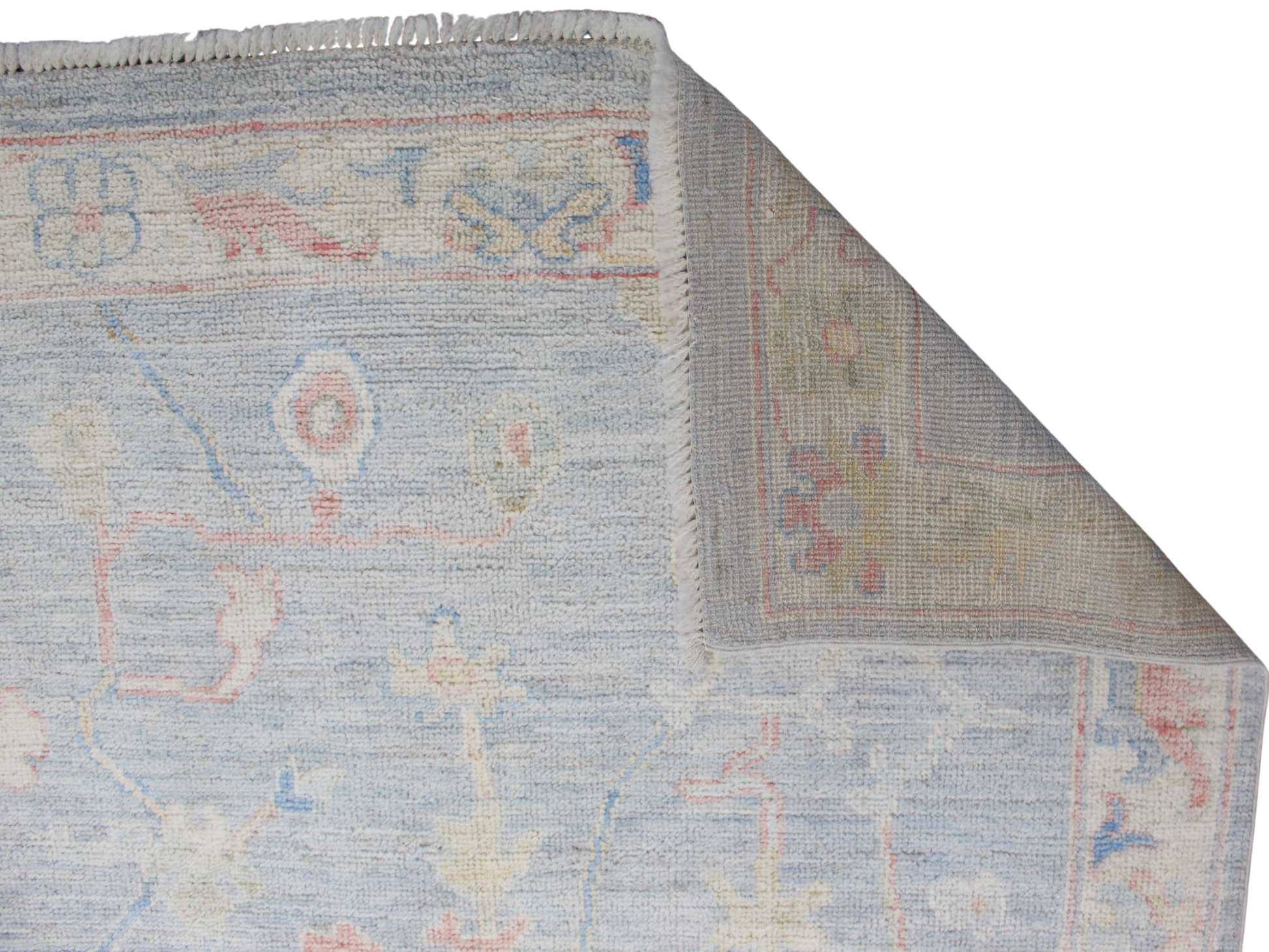 This beautiful Afghan Oushak rug is a study in softness and refinement, designed to bring a calming elegance to any space. The rug’s muted gray-blue field serves as a serene backdrop for scattered floral and vine motifs, woven in gentle shades of powder blue, blush pink, butter yellow, and ivory. The design is delicately faded, evoking the timeless charm of antique Oushak rugs while remaining perfectly suited to modern interiors.